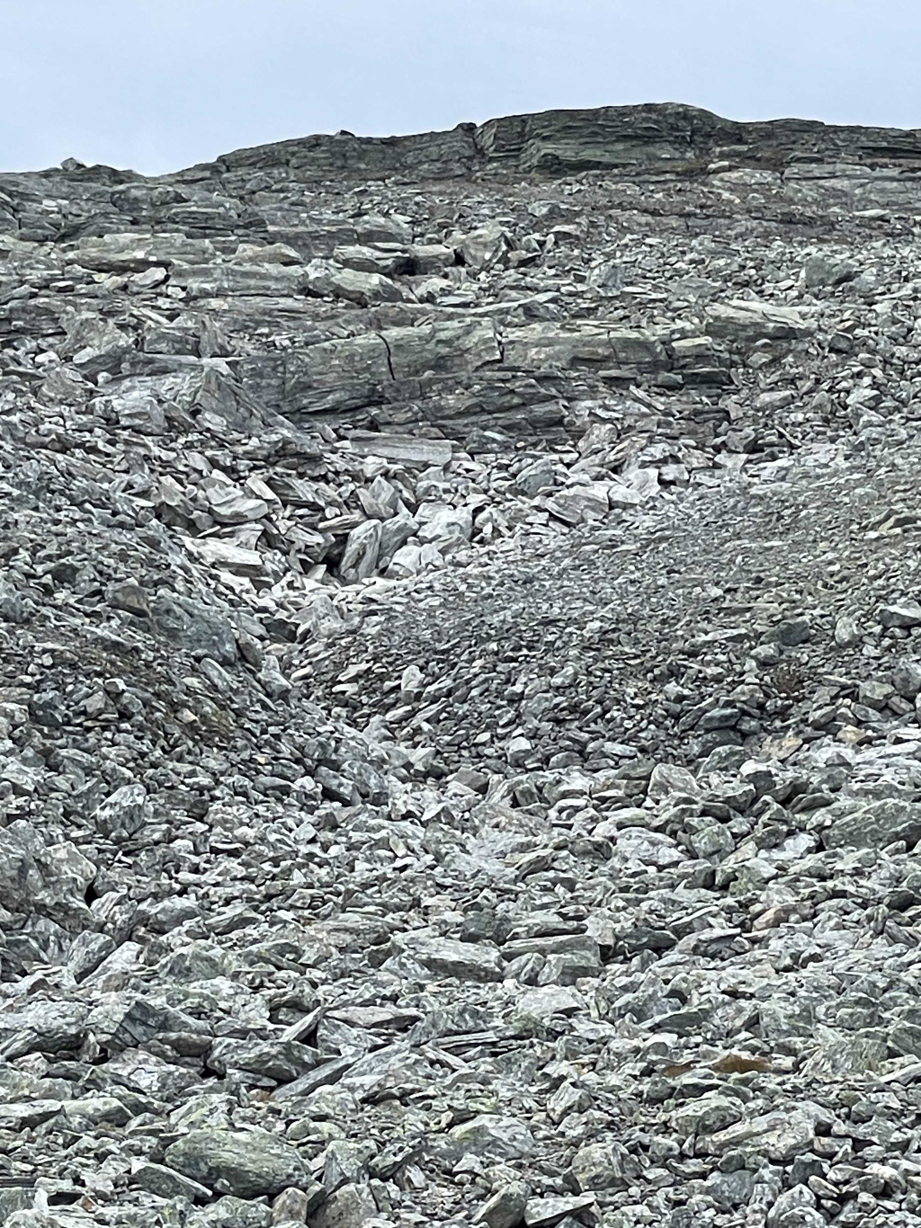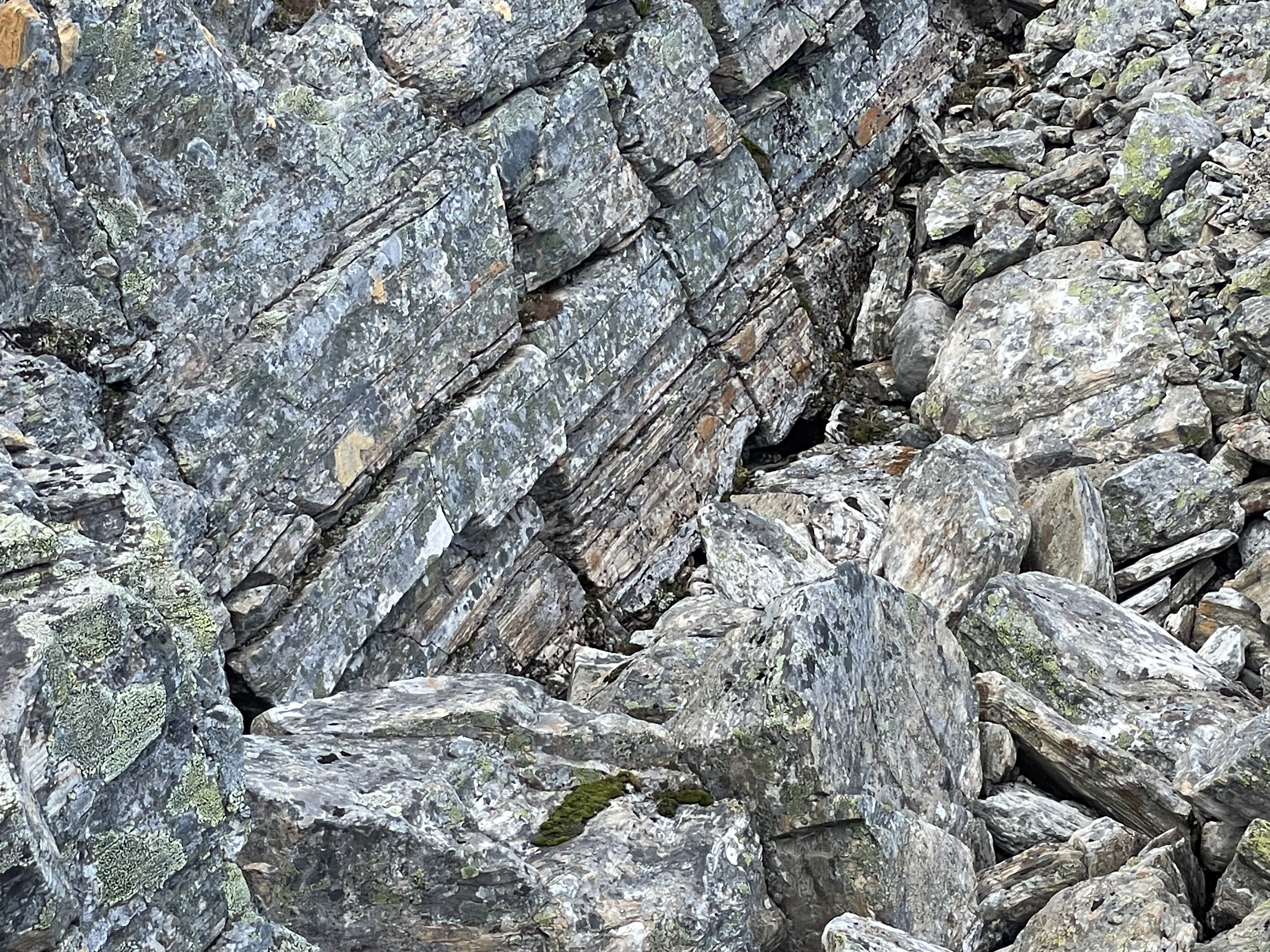 This is further northwest from the previous wall of the same ridge. We were unsure about the rock, but the bottom layers in this picture are clearly different from other rock in the wall: