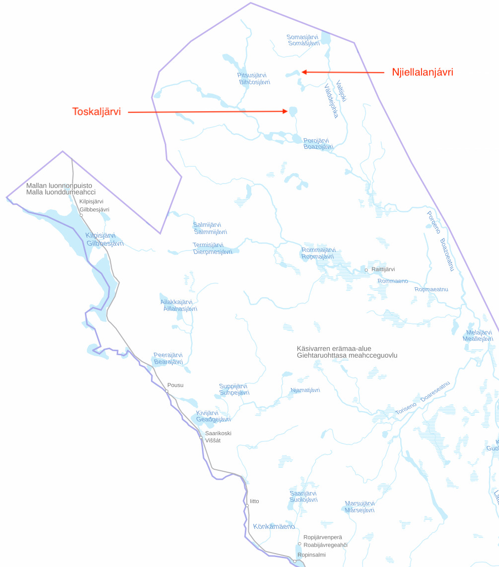Here's the area our expedition looked at, between the Nijellalanjávri and Toskaljärvi lakes: