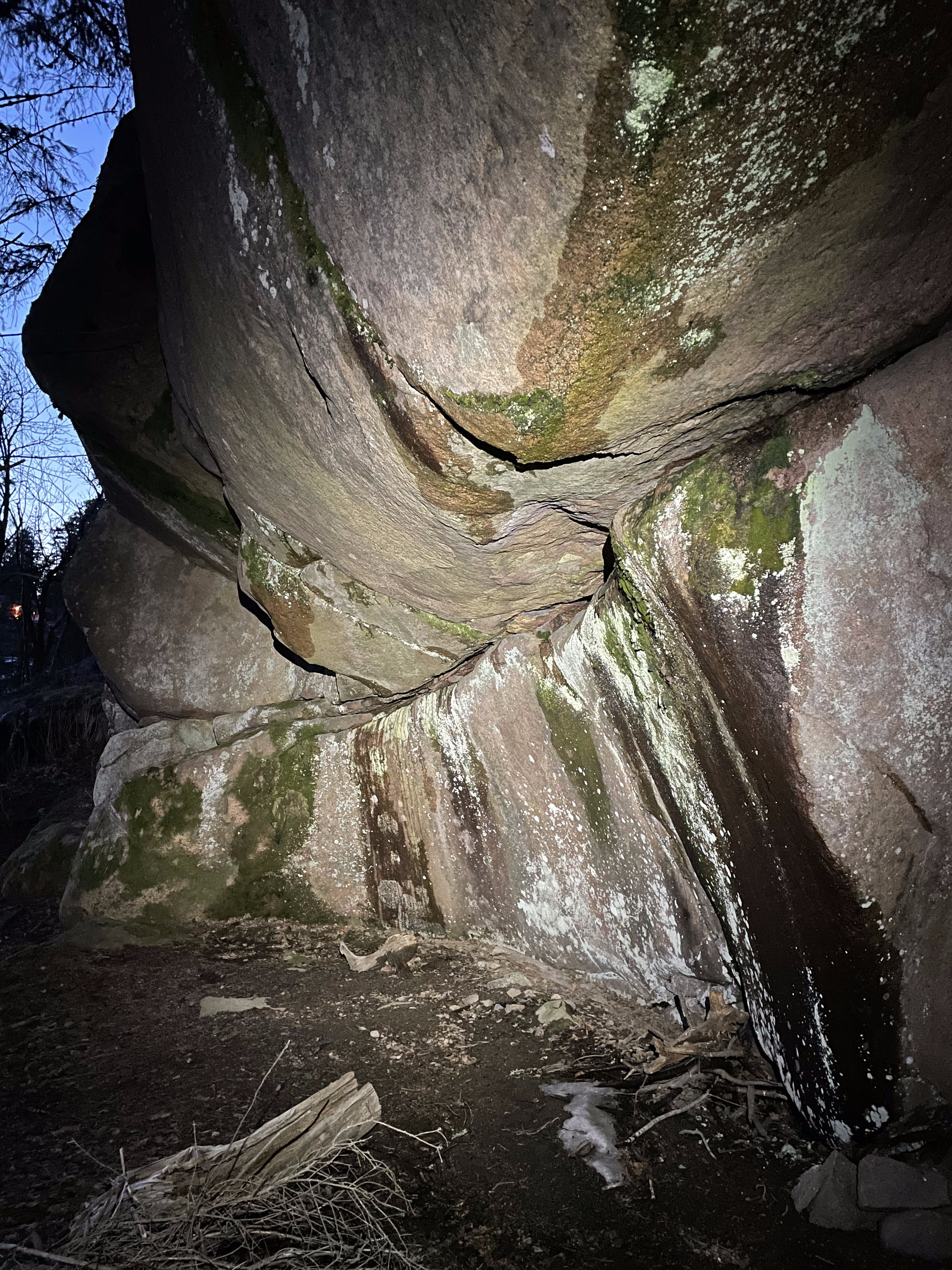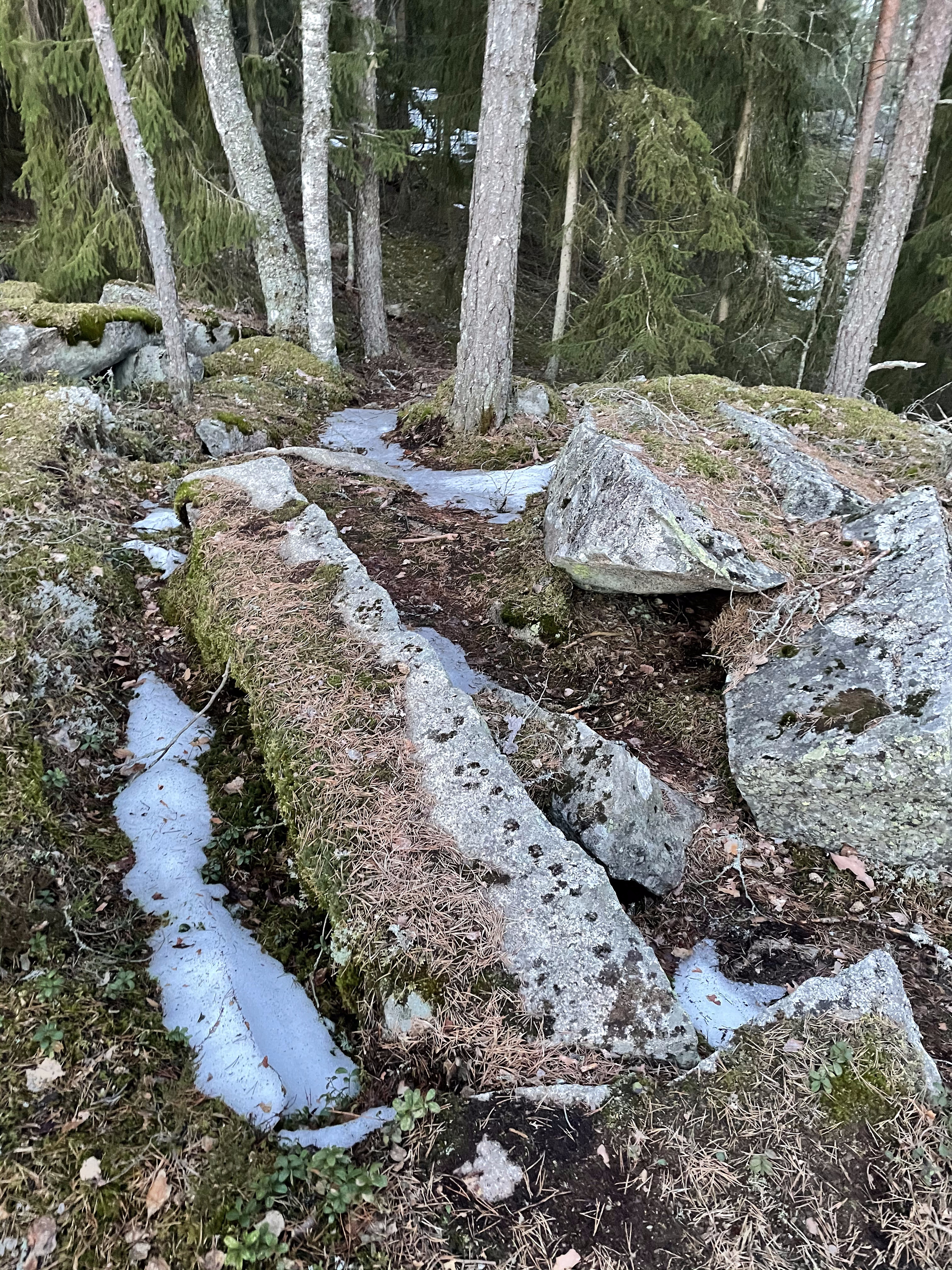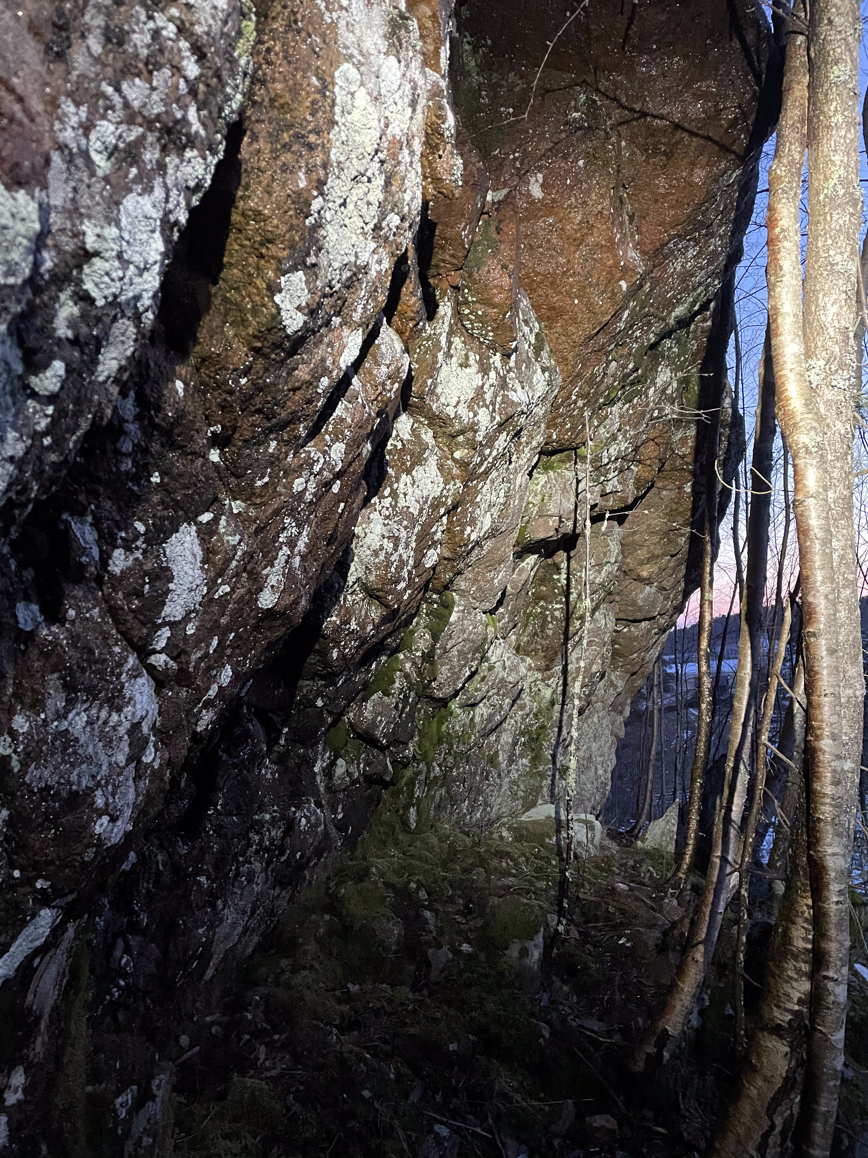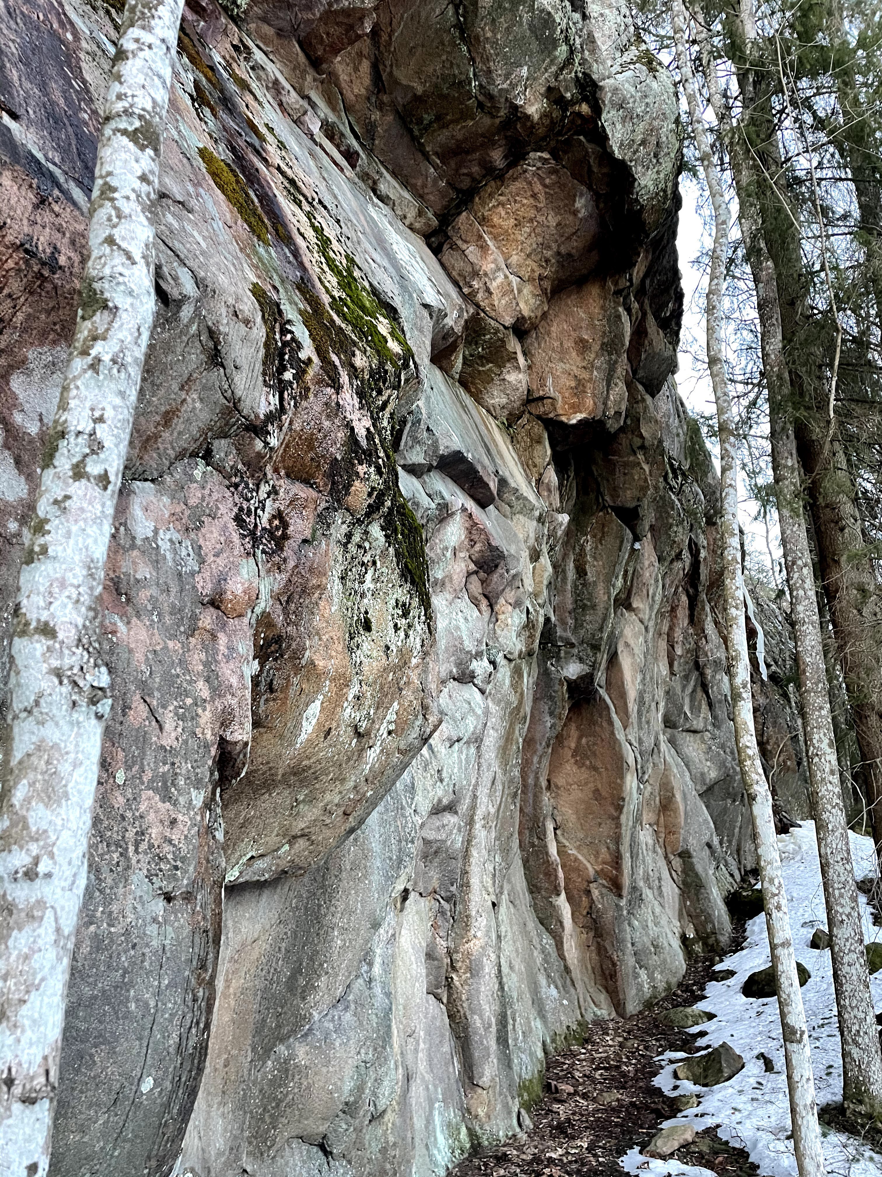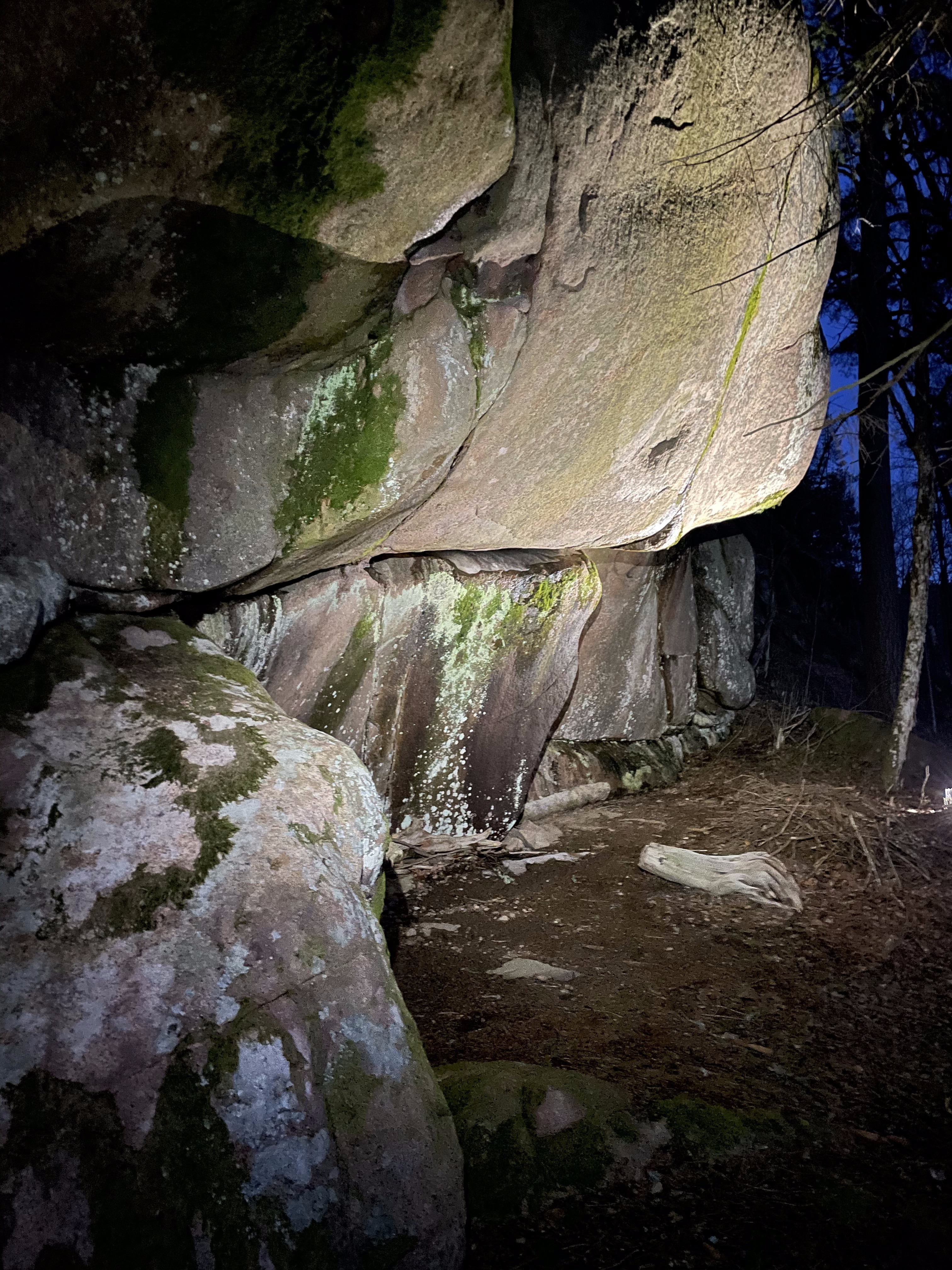 The evening's excursion was to Lohja's Karstu area, in search of caves. The Linnanmäki is a high hill and cliff in Karstu, and the book Suomen Luolat notes that there are two caves on the hill. One was supposed to be inaccessible without climbing equipment. But as usual, the coordinates were inaccurate, so I ended up going around the entire hill, and I think found the other cave plus four other small roof/shelter caves.