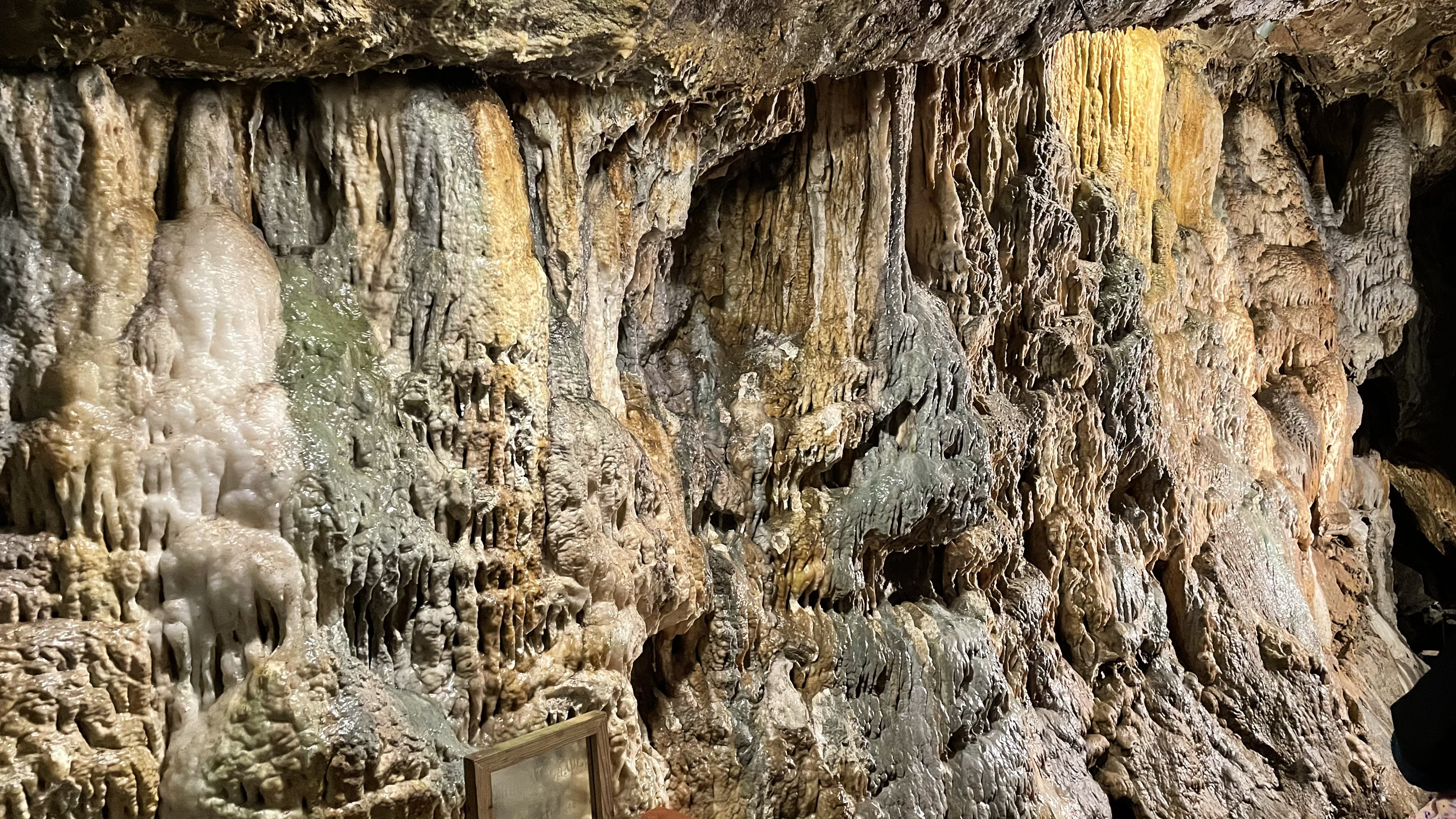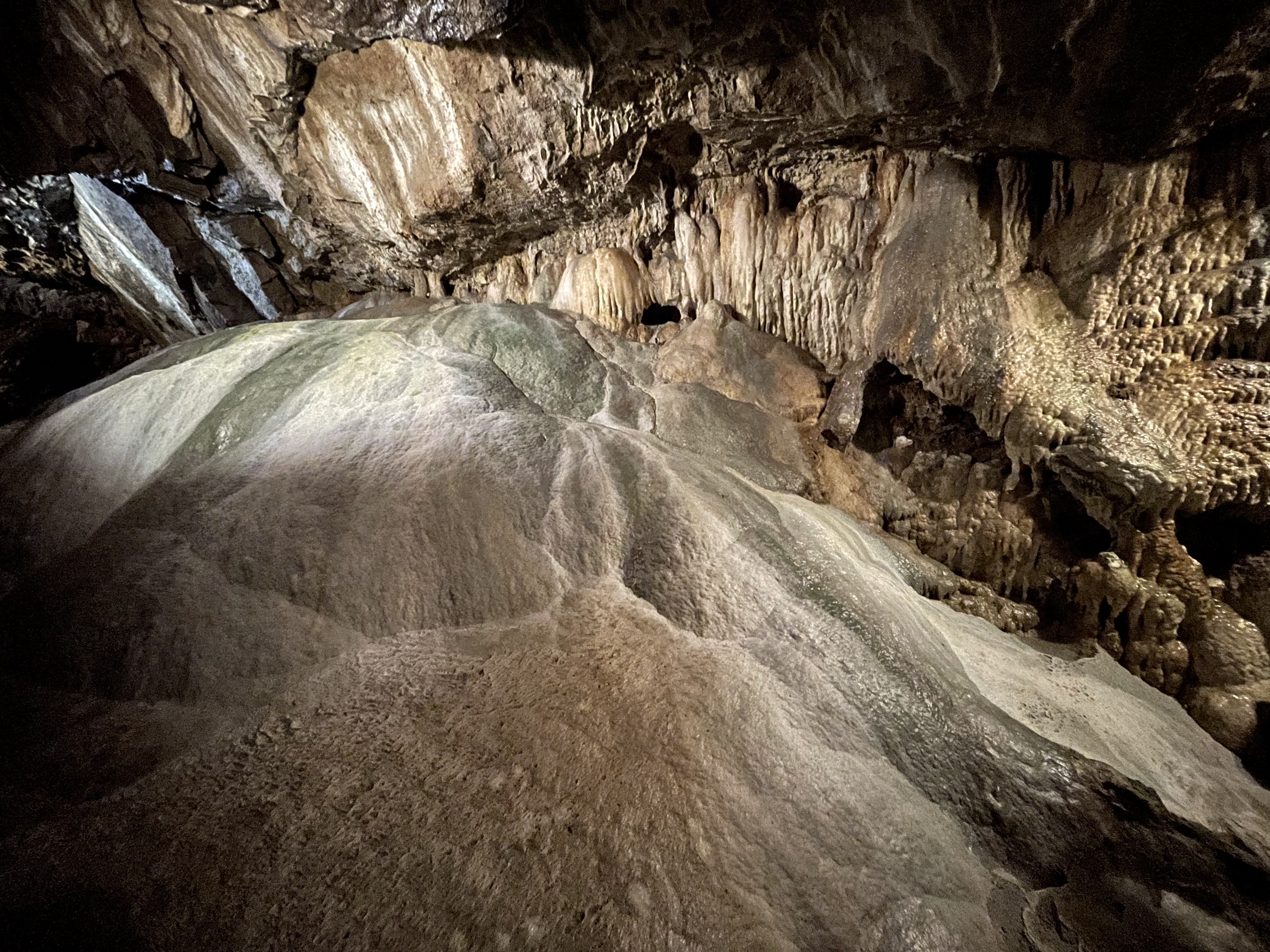 The most interesting room that you can visit is the Crystal Chapel, a site of more than 100 underground weddings. And the site of dance parties in the 1880s... on a wooden platform (!). The room has some stalactites but is mostly covered with flowstone, including a massive light-colored flowstone area that one has to navigate around when moving about in the room.