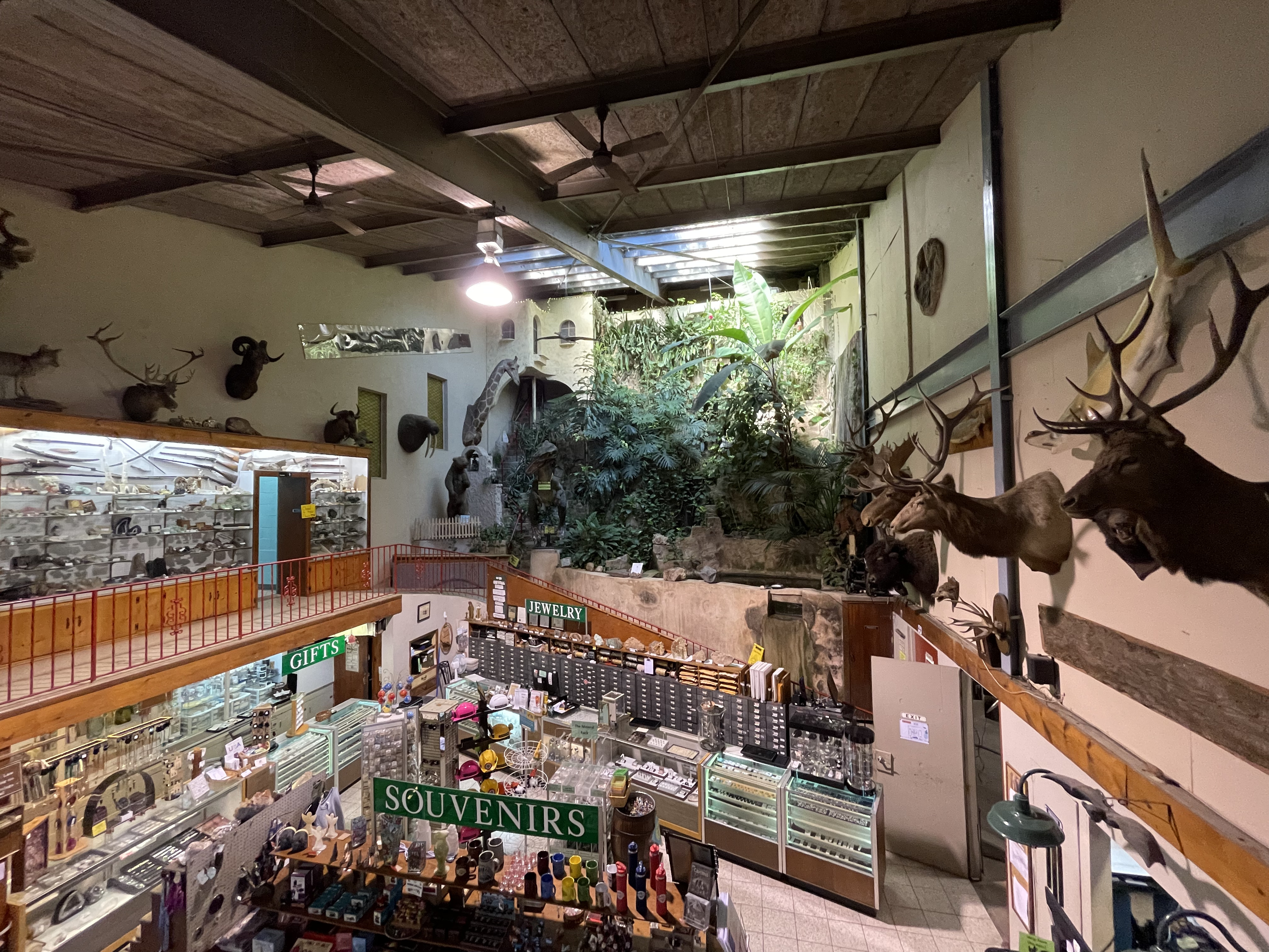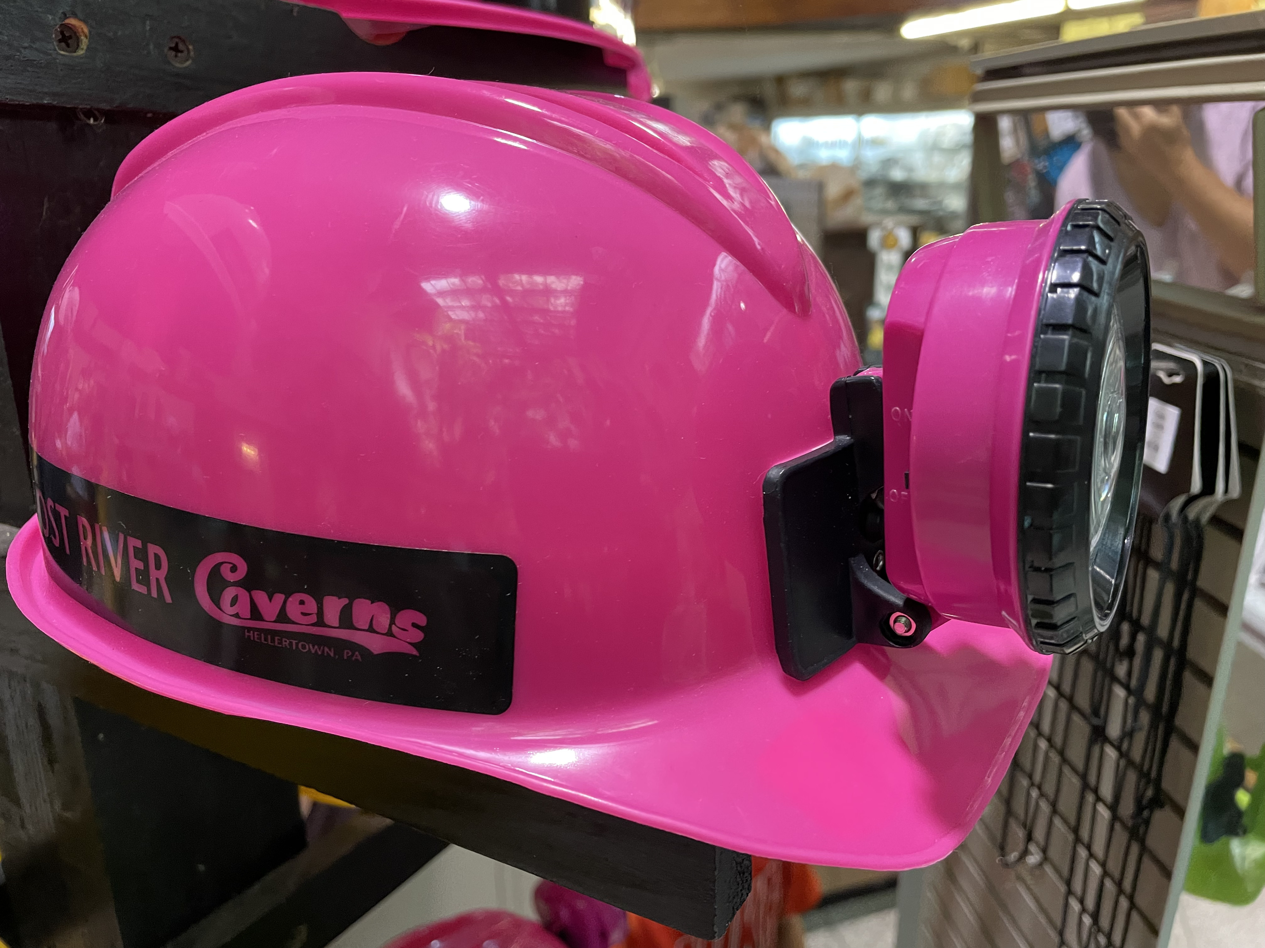The cave ticket hall has a large shop with a remarkable collection of memorabilia and souvenirs from rocks to photographs. And caving "helmets" for kids: