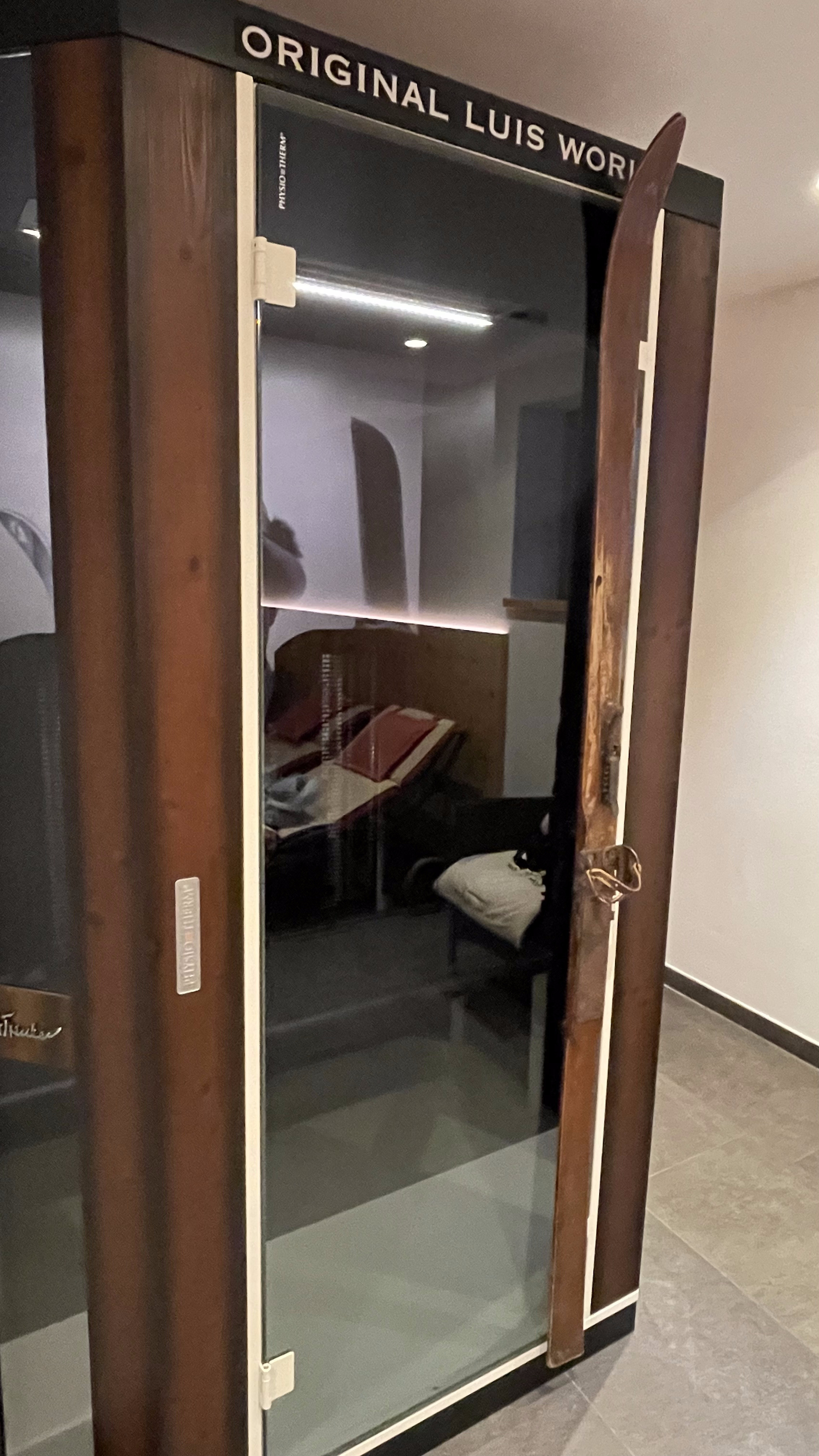 There's a nicely lit Finnish sauna, an infrared sauna box, and a relaxation area. And the infrared sauna door handle is made from an old ski! They do not have a pool though, if you're looking for the ultra-luxurious experience, try the Adler Inn (across the street, same management), the Spa Neu-Hintertux (next to the slopes), or the Berghotel Hintertux Wellnesshotel (between the lifts and the Madseiter, but perhaps the best saunas that I have experienced in the world).