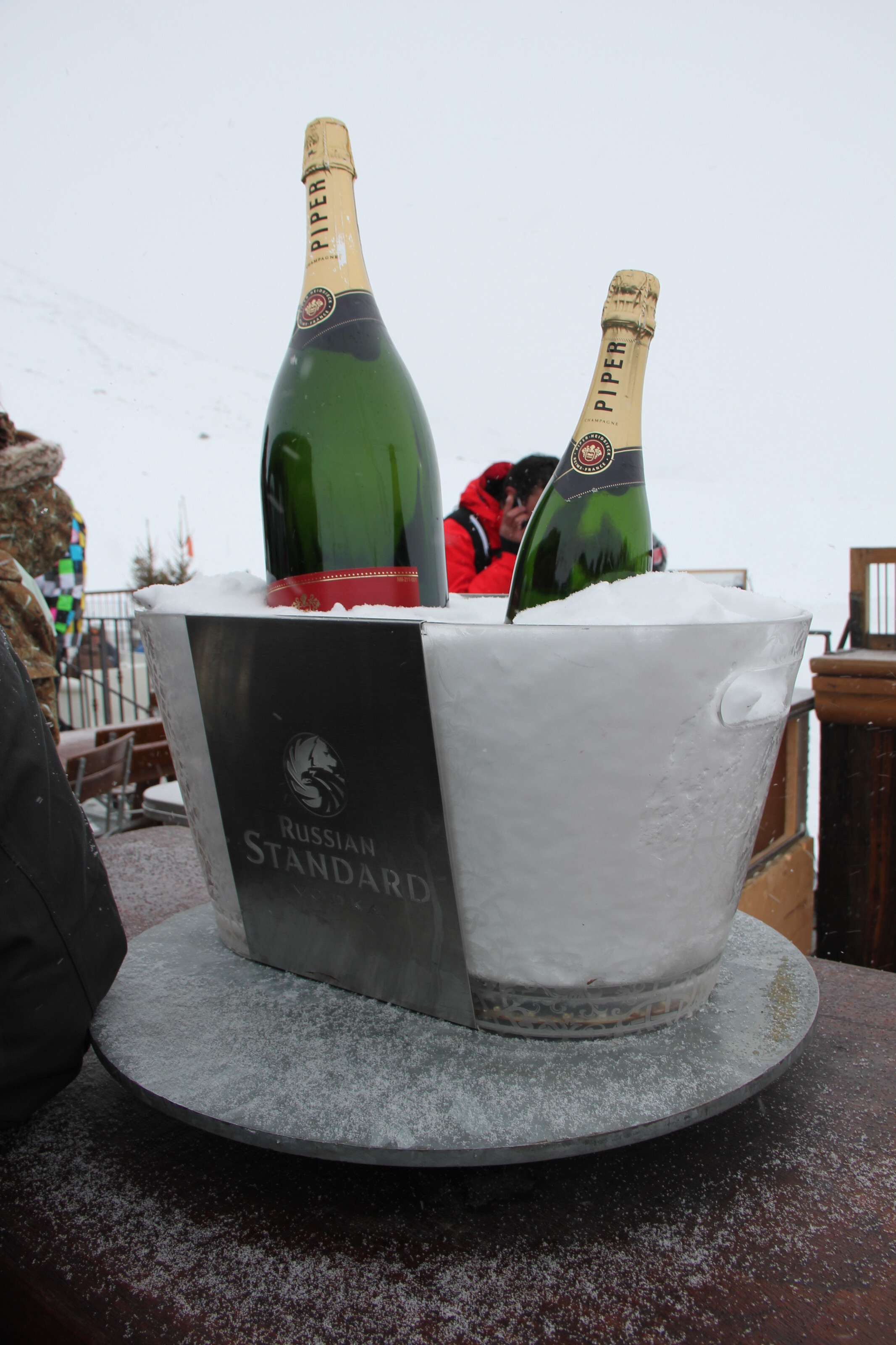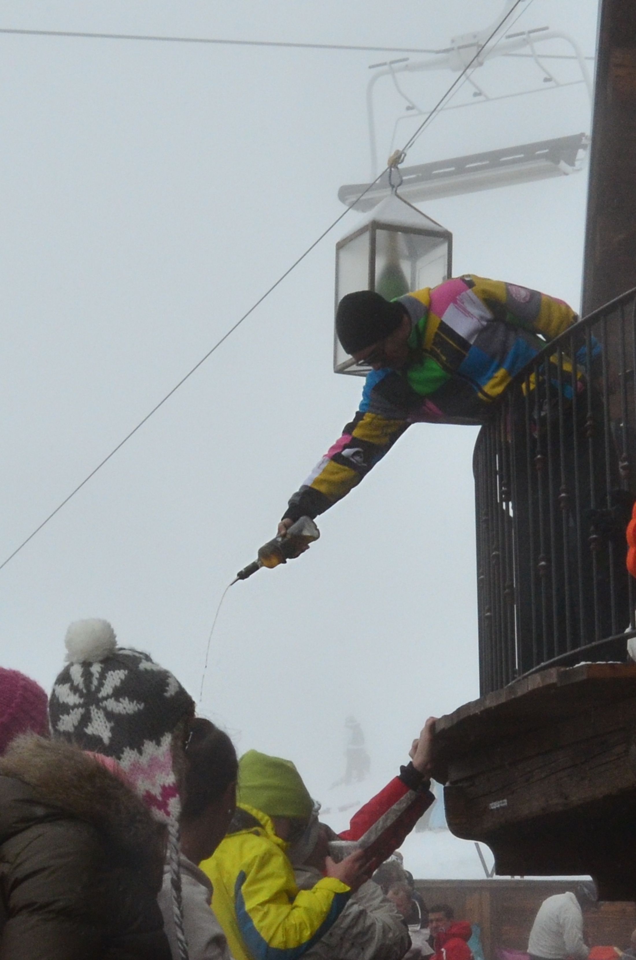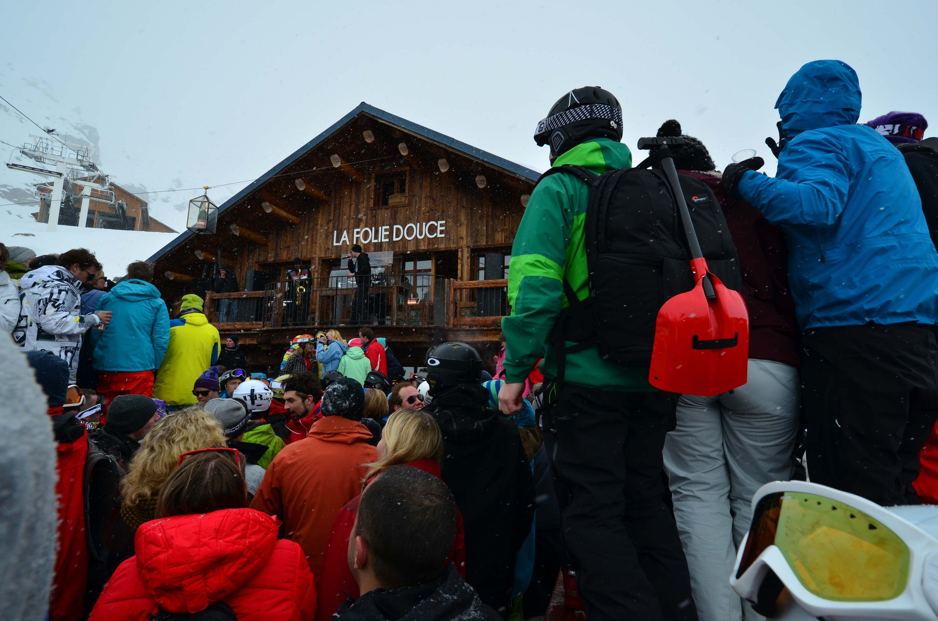 While La Folie Douce is at 2600 meters, the dance floor is in practice at 2601 meters, given that most of the people are dancing on tables. The tables are extremely slippery, however, particularly for ski boots. I was not afraid of falling while skiing on my trip, but I was afraid falling down from the tables. I was glad that I had a helmet on, but I missed my back protector. Oh well, at least I had my big backpack (complete with shovels and other necessary bar gear) with me.