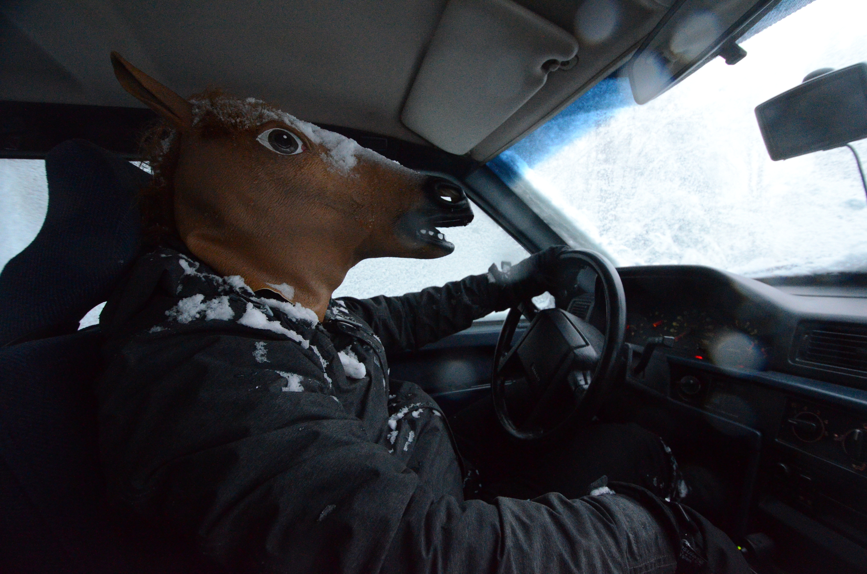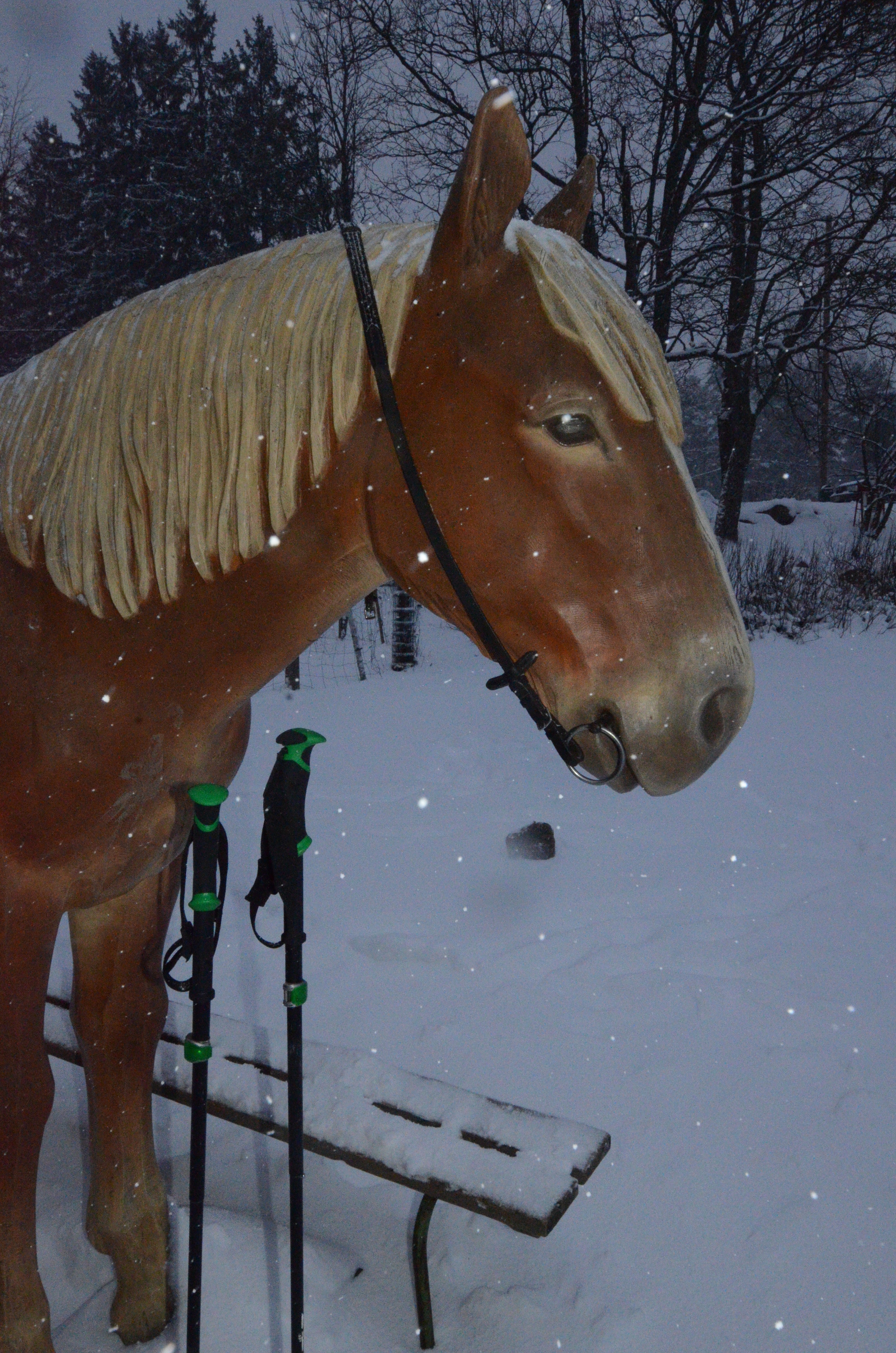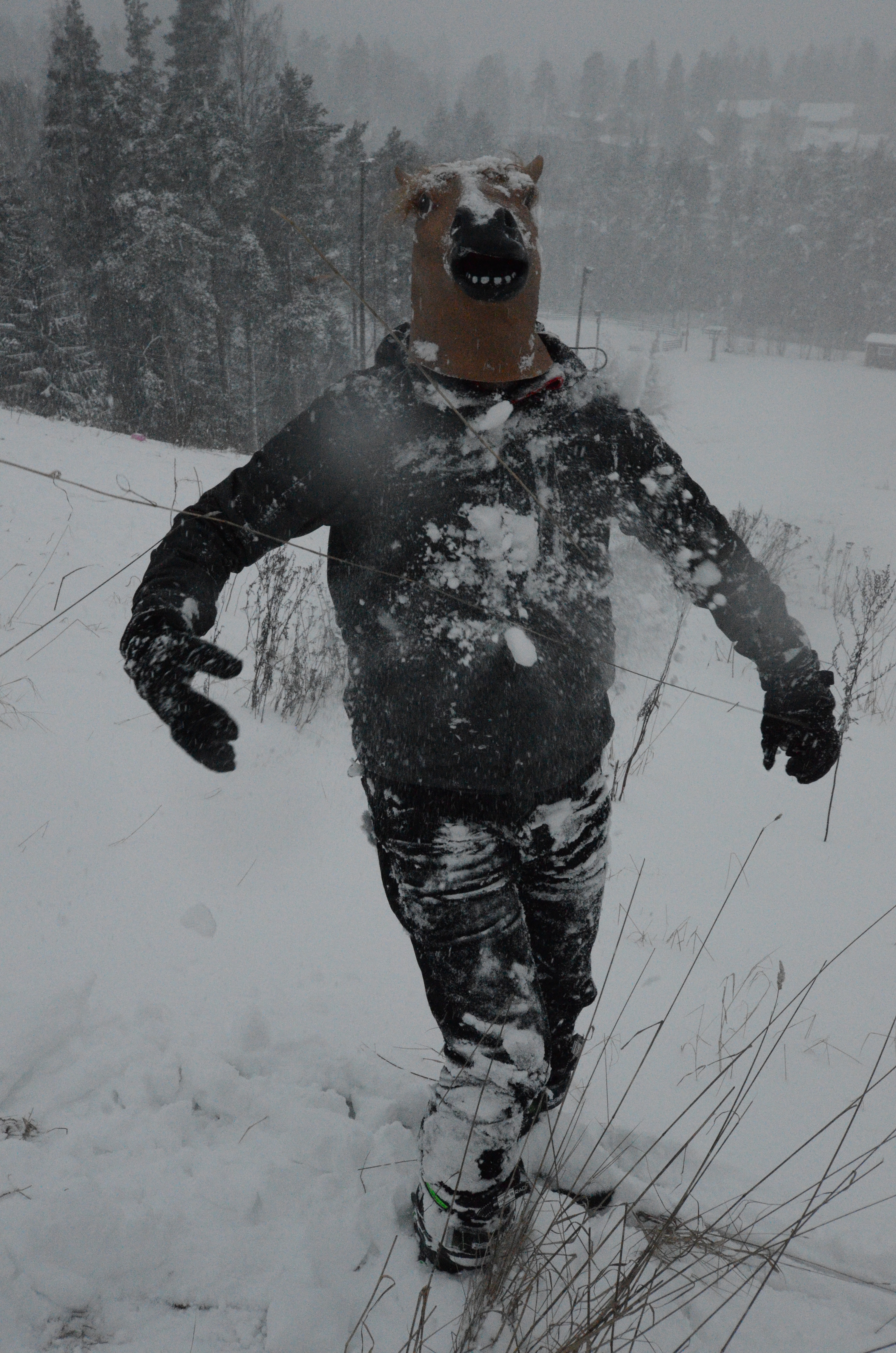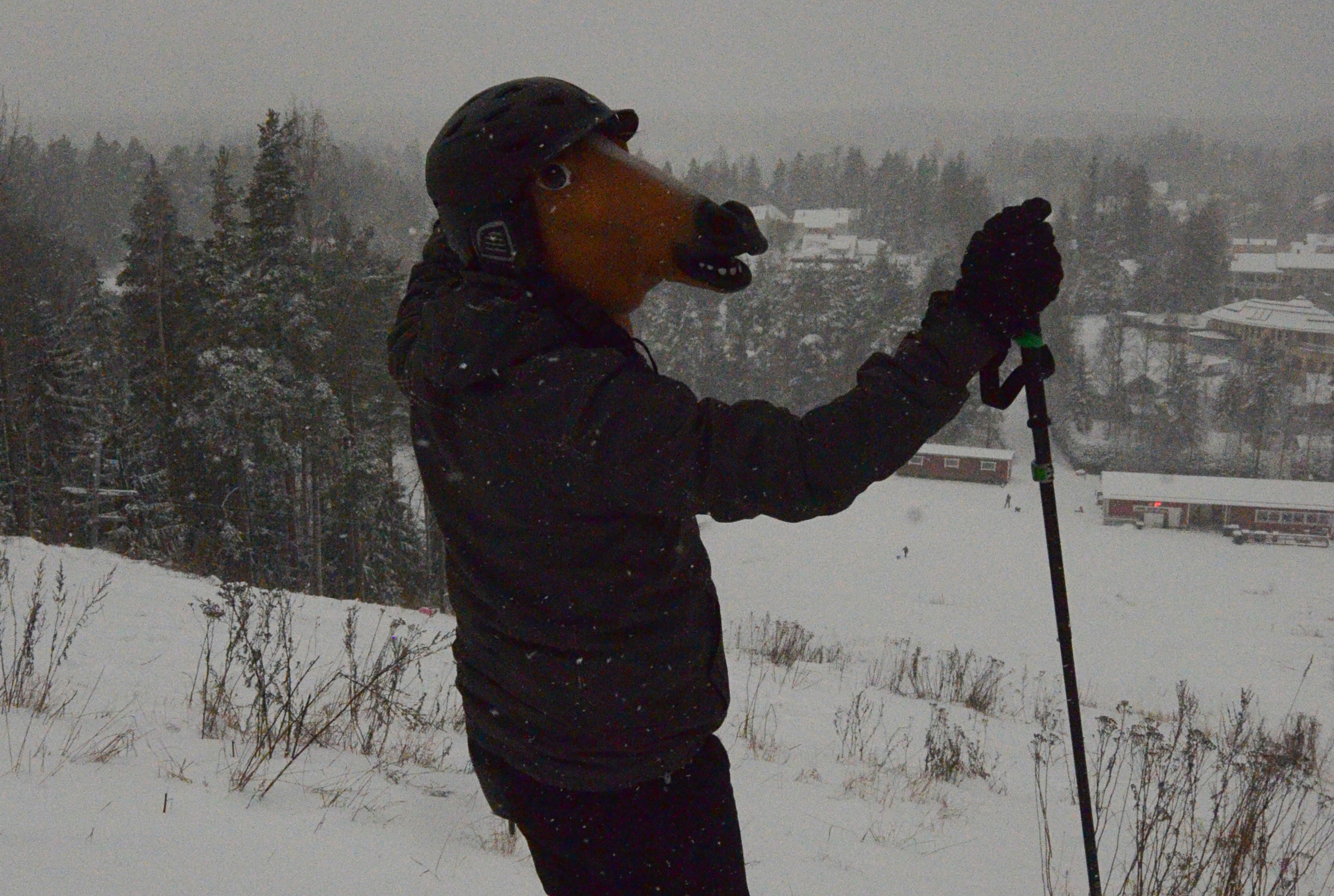 This time we have a guest skier in the blog: the horse head man. According to the Internet meme, he rides on the subway, attends games, and shakes hands with presidents. But can he ski? And perhaps more importantly, who left the barn door open?