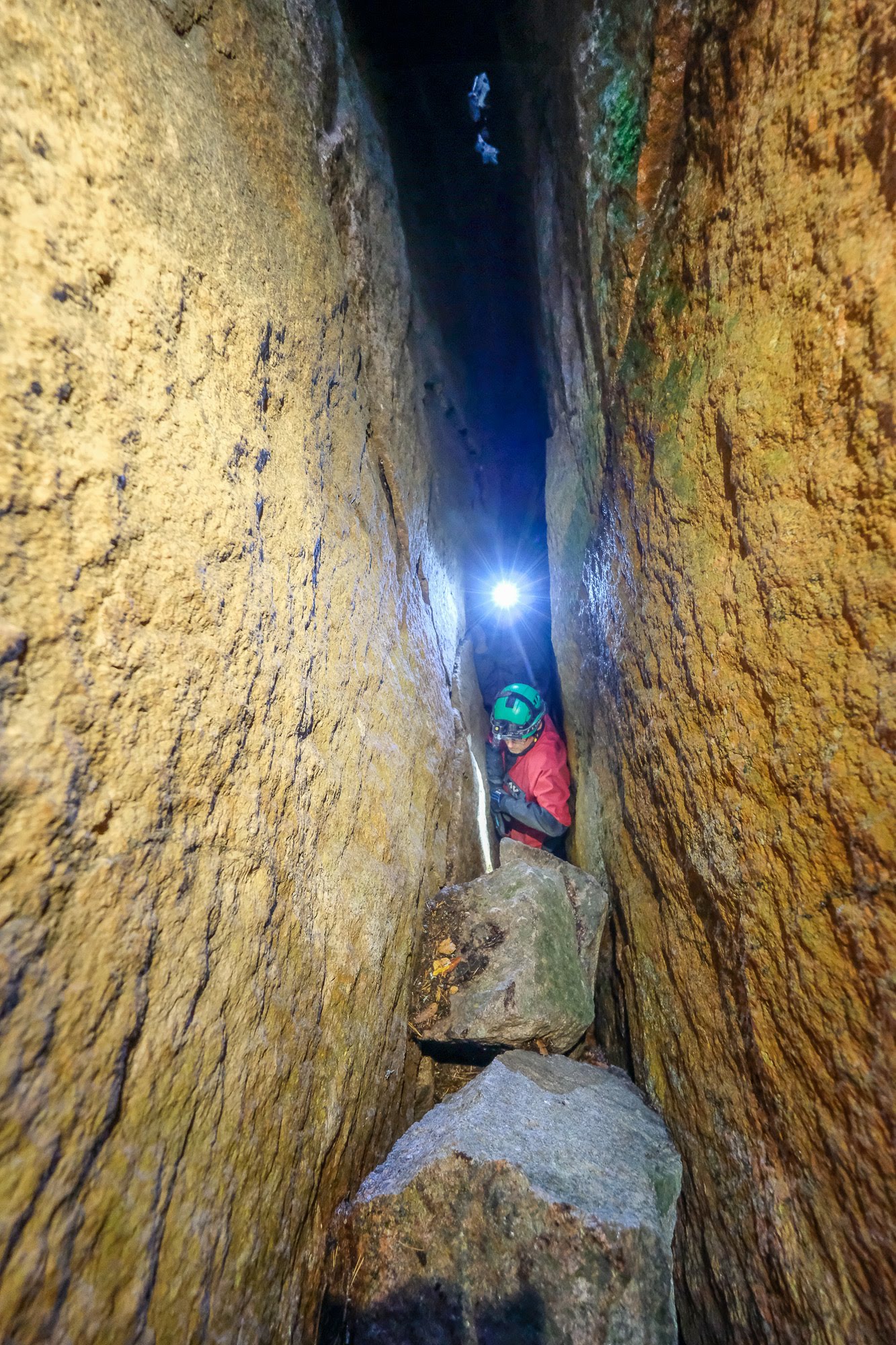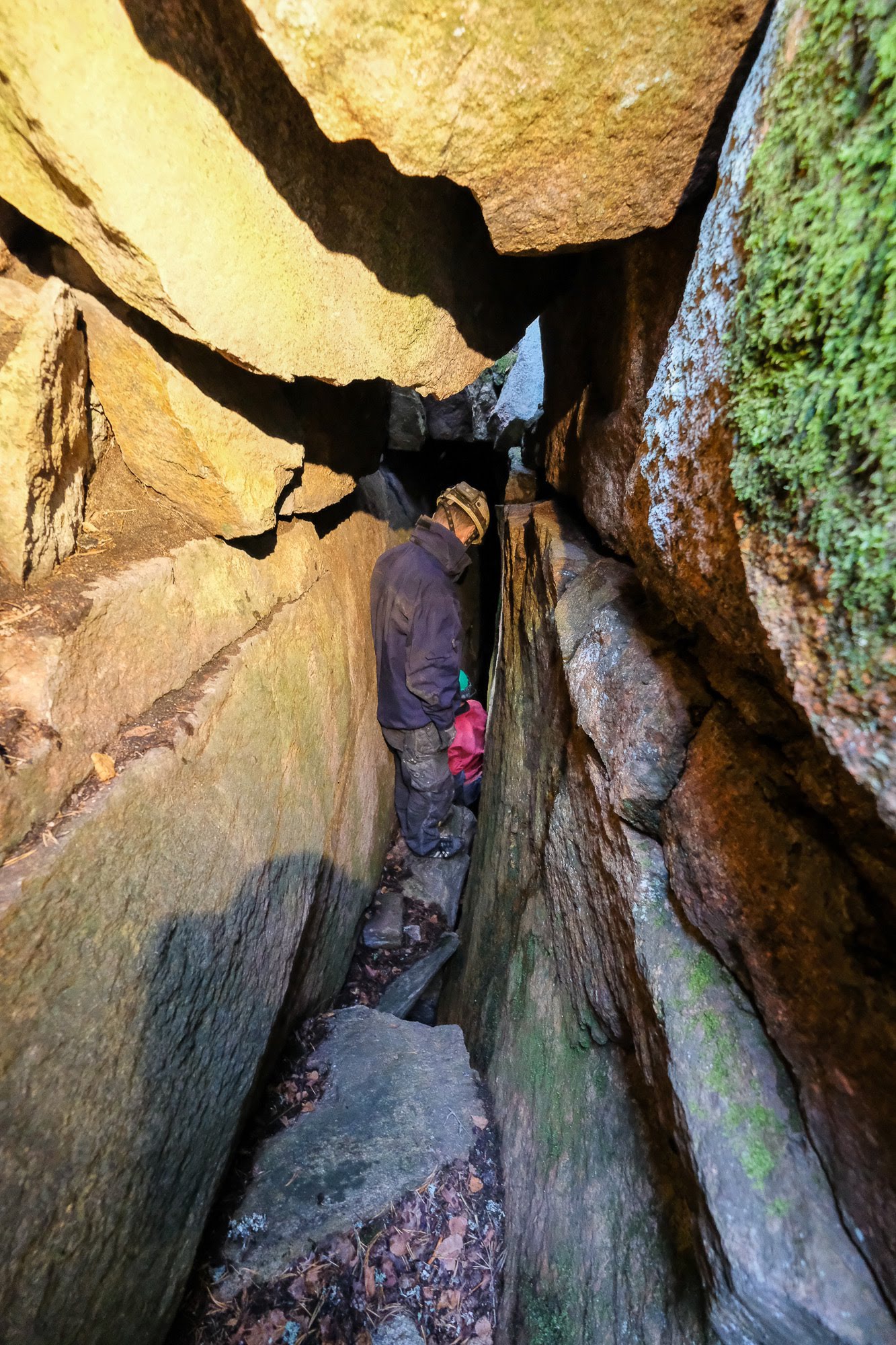The crack is a known but difficult geocaching location. Getting to the end of the crack and the cache means a chimney climb maybe eight meters high, on top of a gradually tightening crack. If you fall... it is not clear that you can get out.