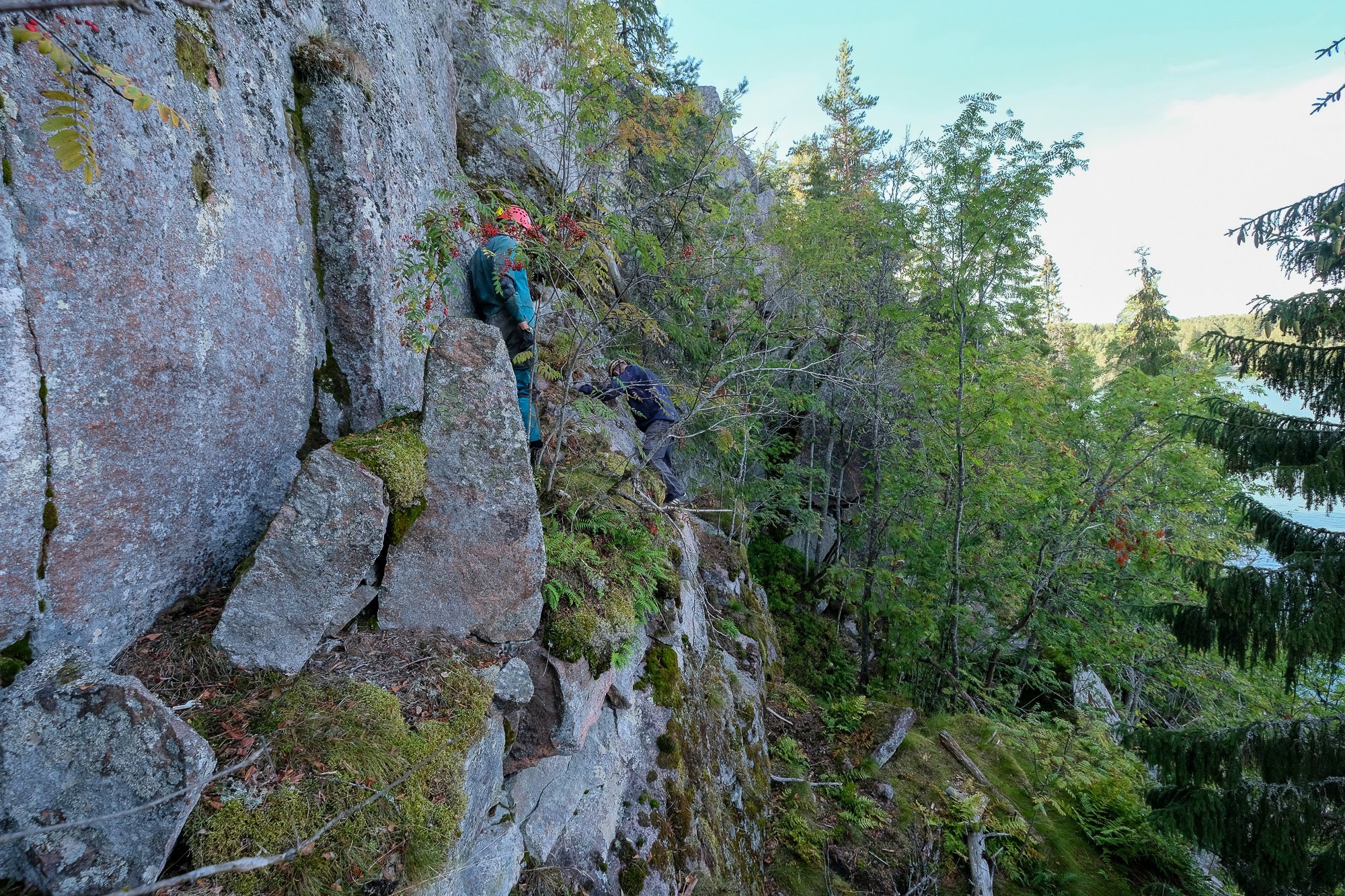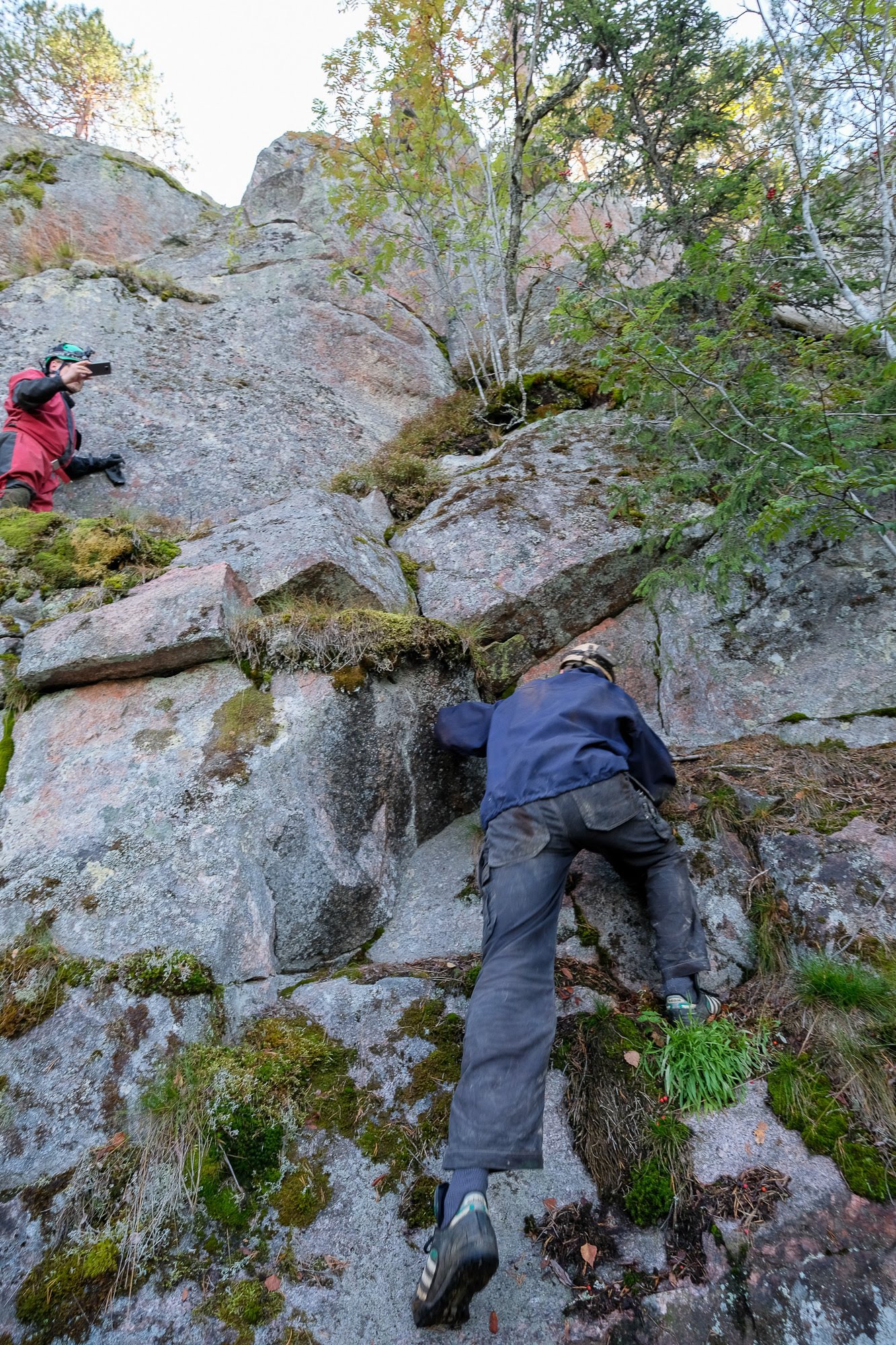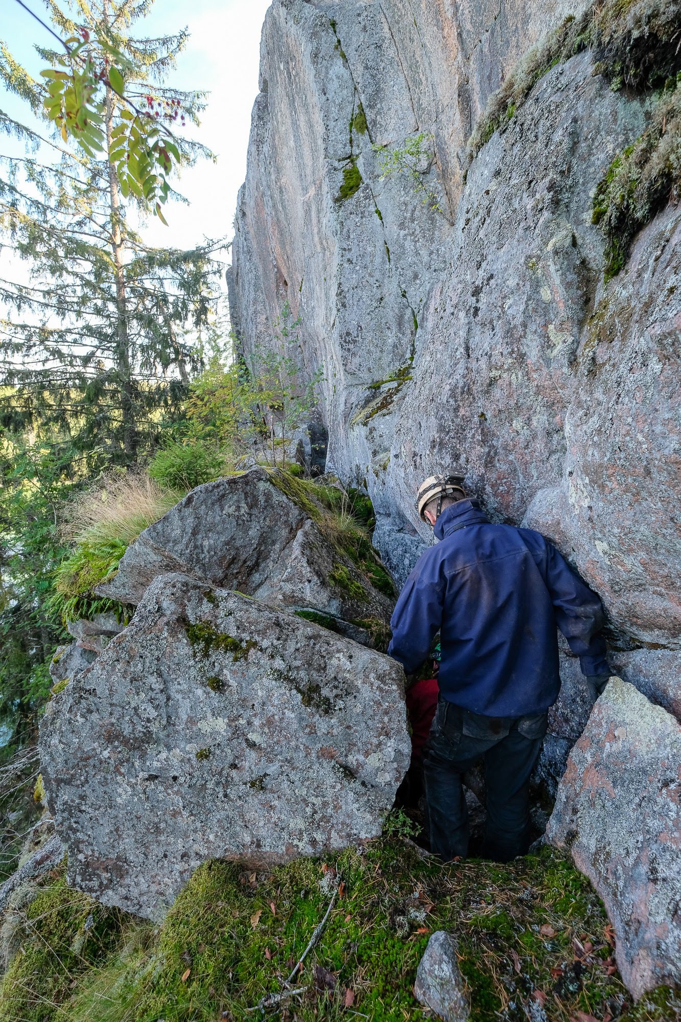 Korkberget is probably Finland's largest cave, with 300+ meters of tight tunnels underneath massive boulders. But, there's also a cliff... and if you climb half-way up the cliff, you will find an amazing crack that leads underground.