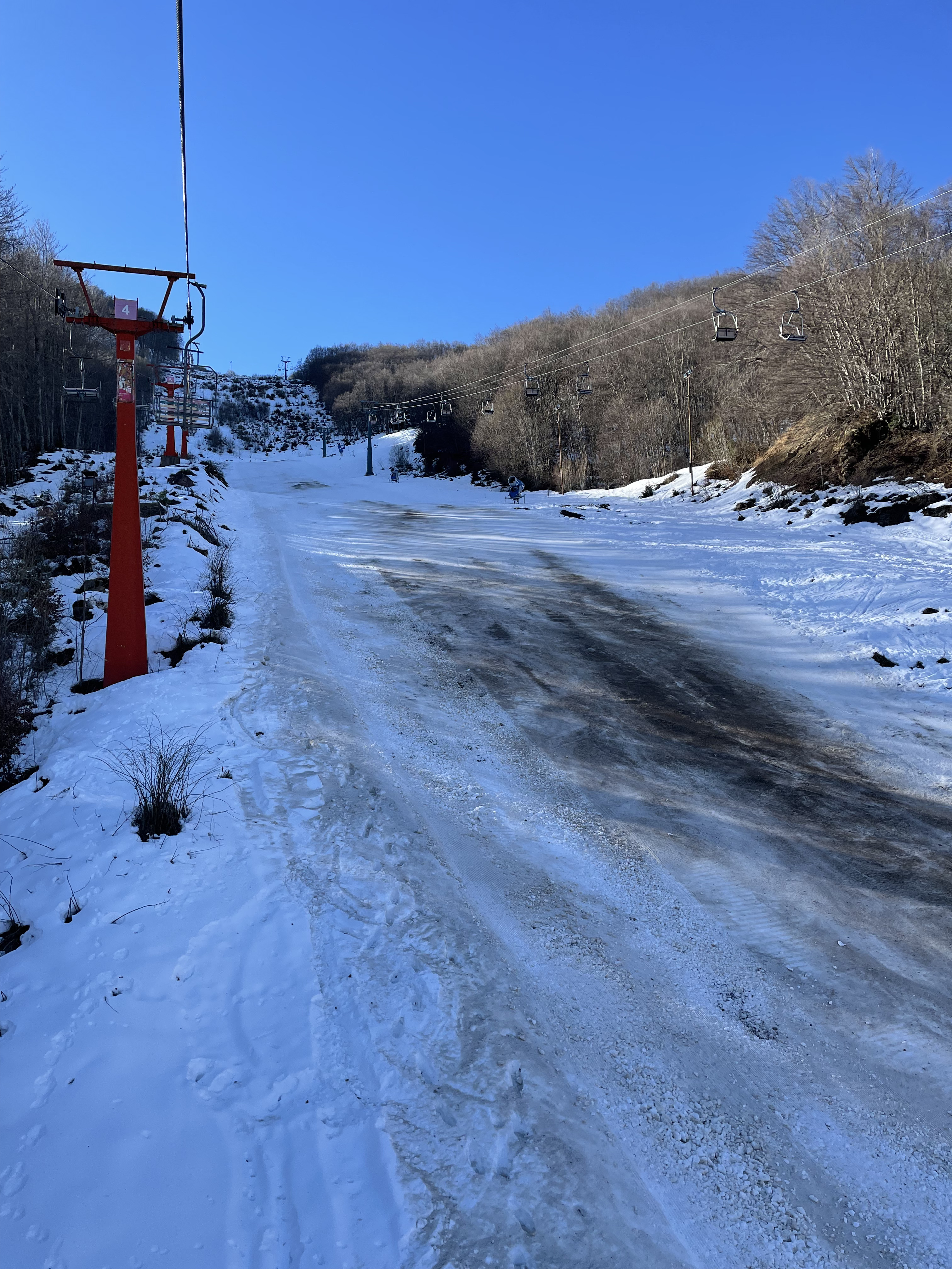 But back to skiing. The ski area map is here (from the resort website). The base is at 1255 meters, and the top at 1878 meters. Nice 600+ meters of vertical then! The bottommost part of the slopes is basically mostly narrow valley runs, though the last part just before the lifts is a nice, steep run (slope #1 in the map). It happened to be totally iced over when I was there. It was difficult to ski, had to stay on the sides to find some grip. And I helped someone less experienced to get down... slowly, by side stepping.