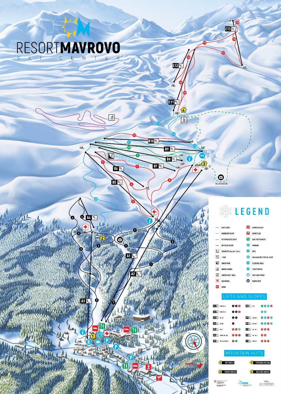 Mavrovo ski area is, unsurprisingly, in the Mavrovo National Park, the largest one in North Macedonia. Mountains in the park reach the 2700 level, the highest being 2764 meter at the Korab peak. The ski area itself resides at the south end of the Mavrovo Lake, an artificial lake create by a large dam, which also buried an old church under the water.