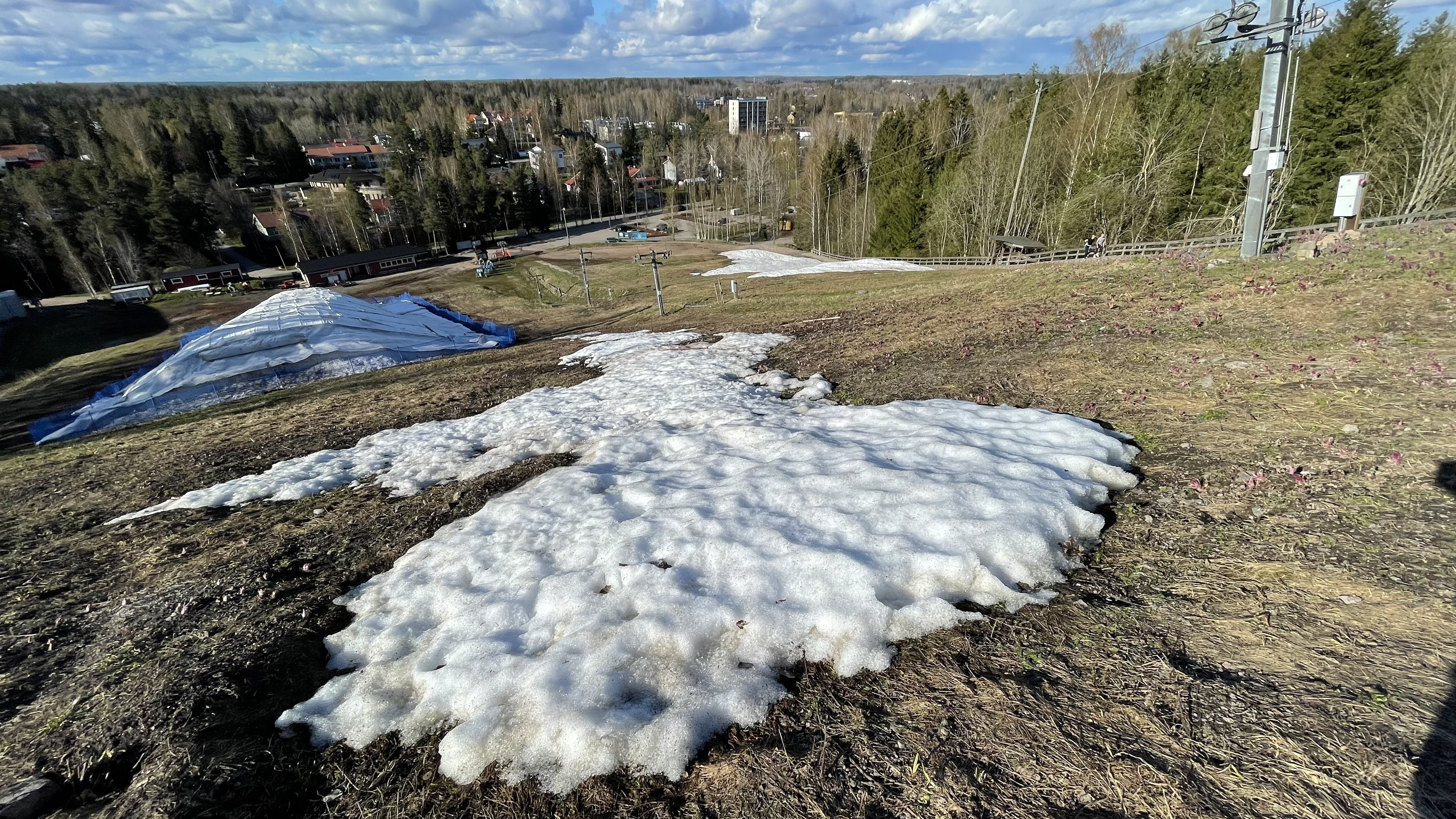 Much of the snow on the Kauniainen ski hill has been stored again for next year, but some is left outside the covered pile as well. It is quickly melting, but even on the upper part there is enough to ski several turns. There's a thicker snow cover near the bottom, but that was further away from where I parked, so I skied the upper one. It was also steeper :-)