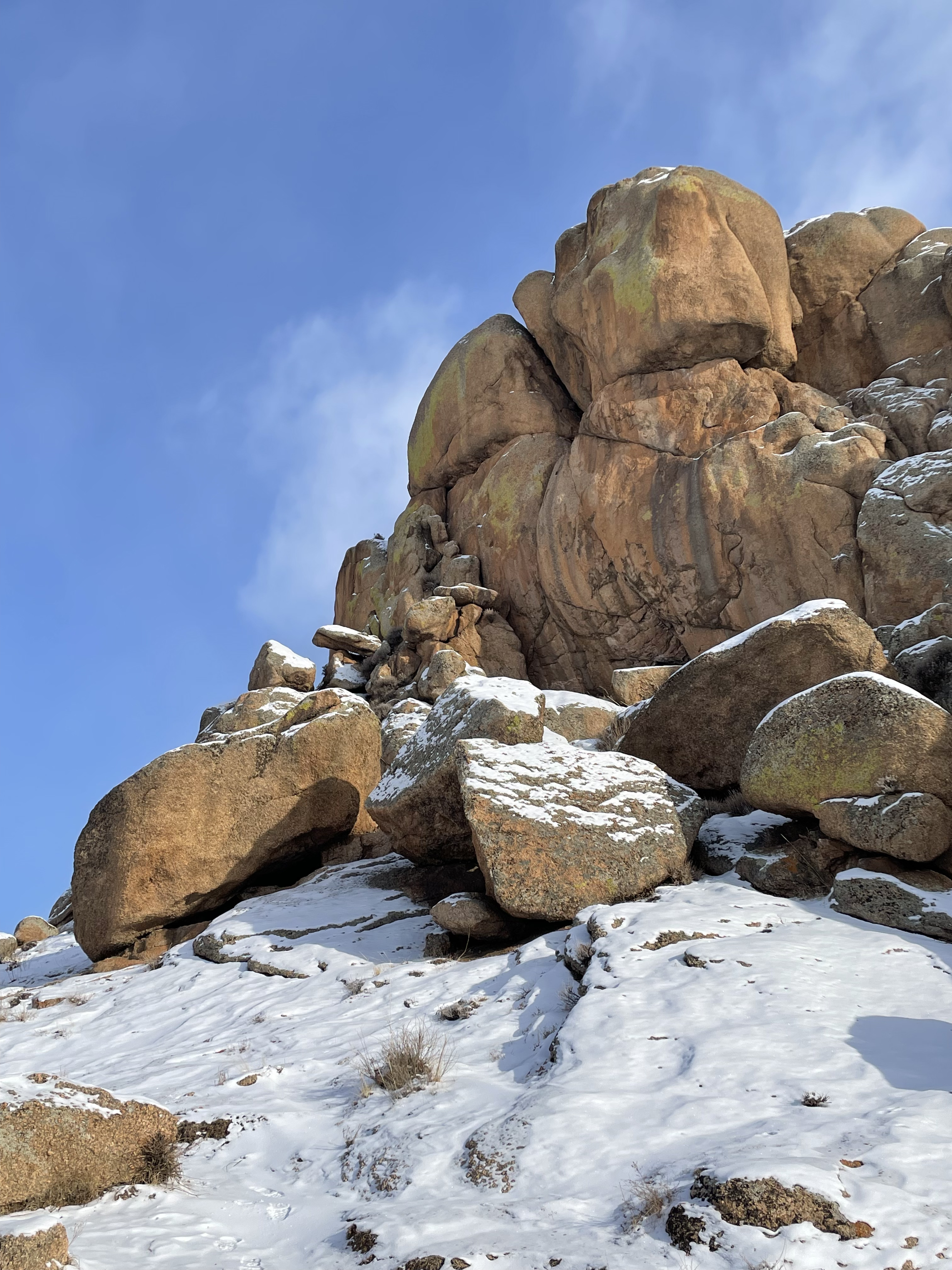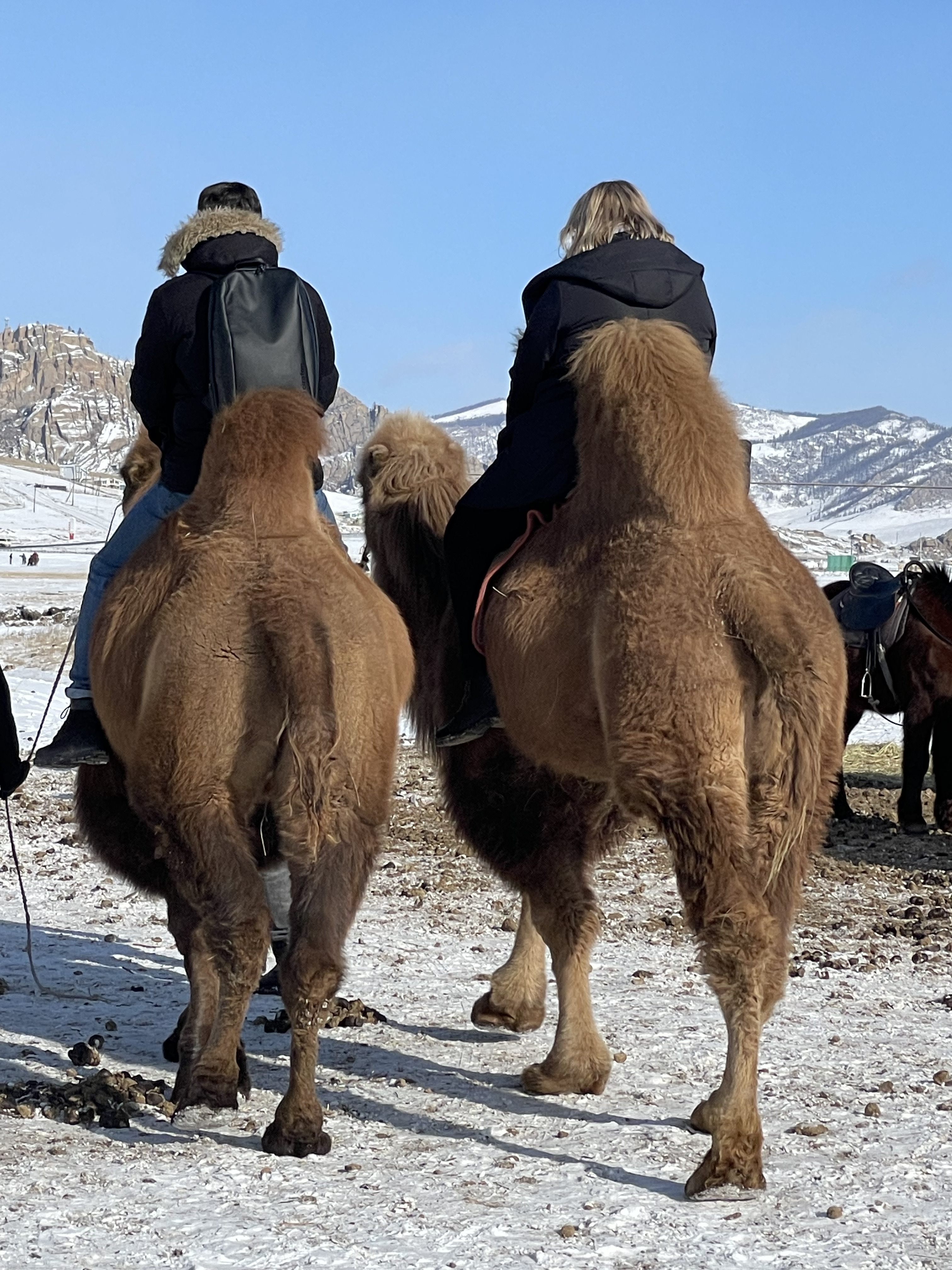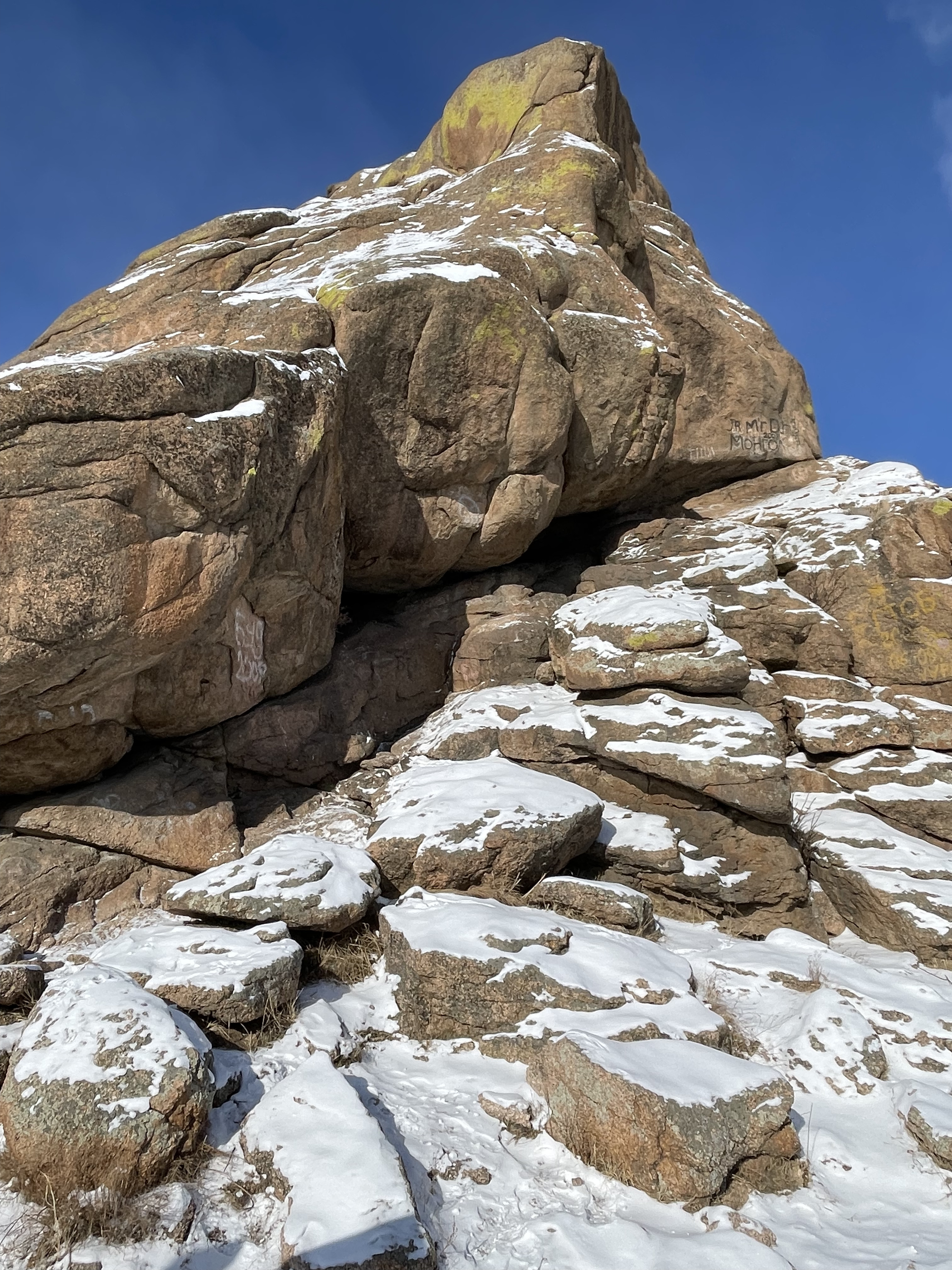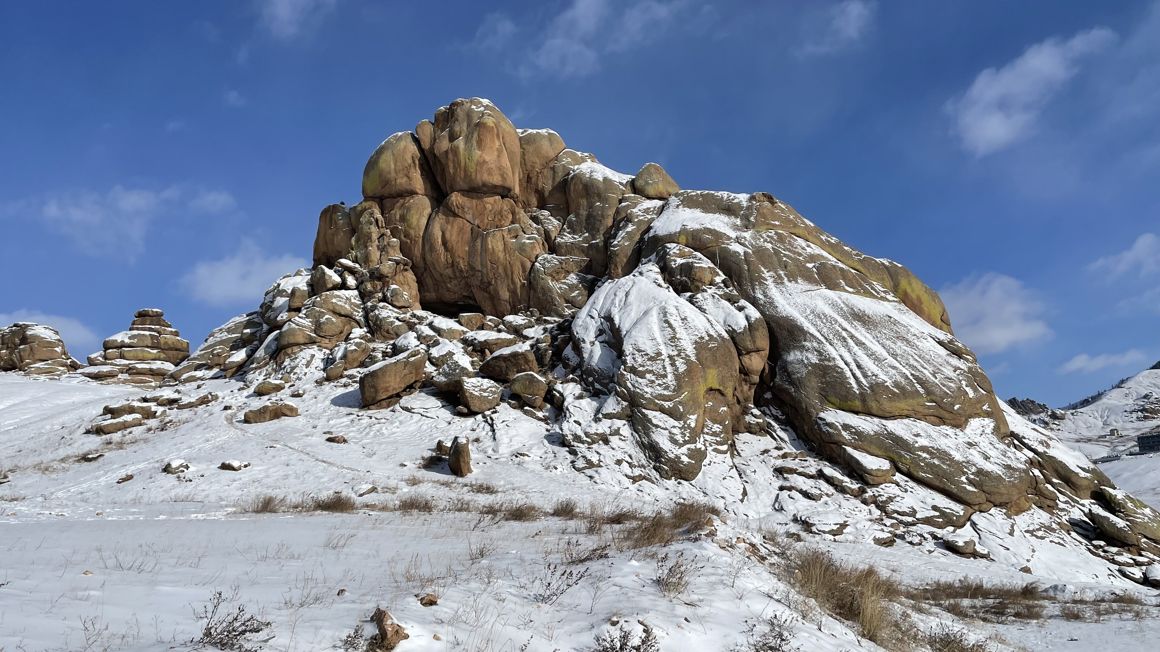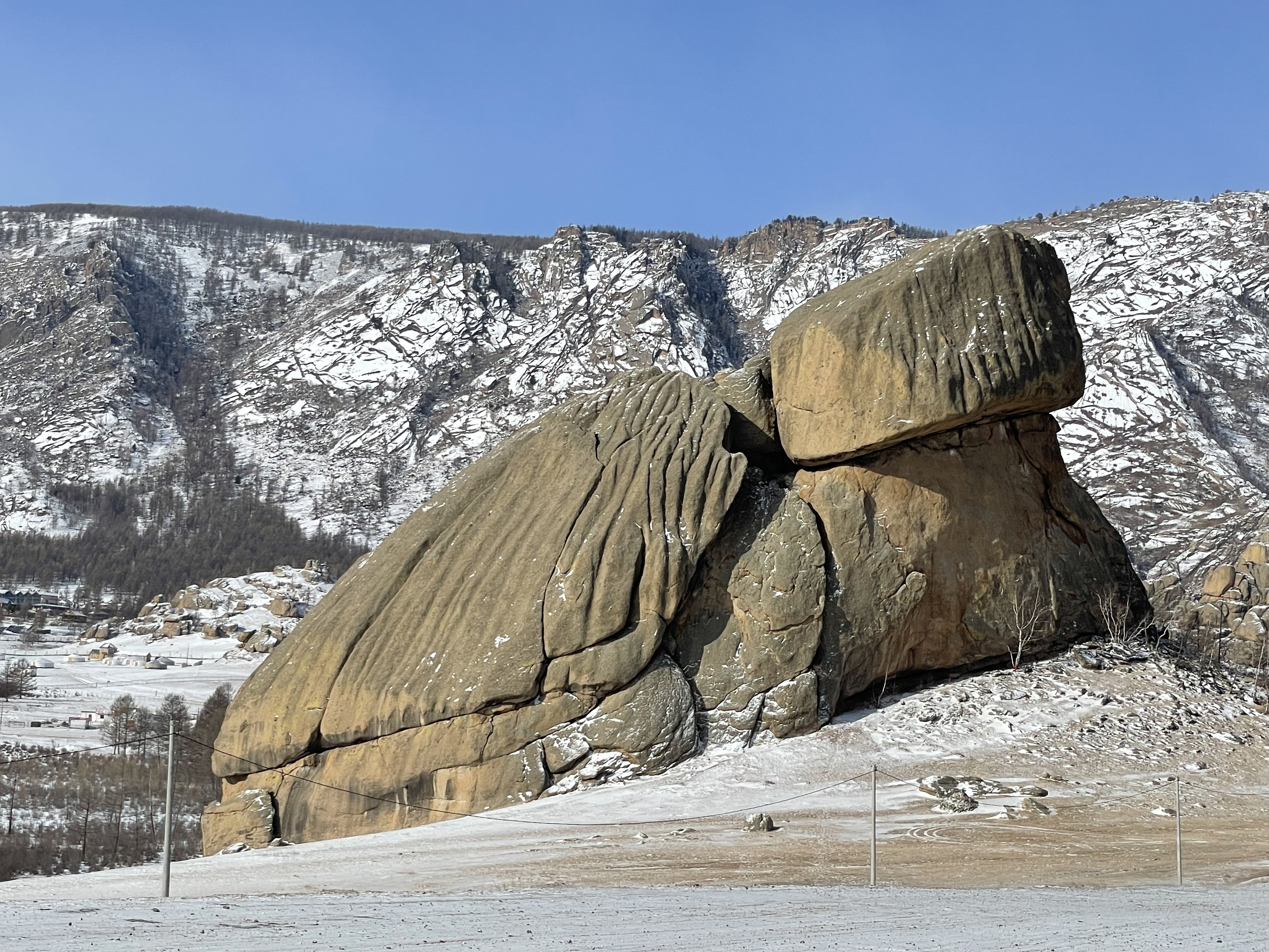We also visited the Turtle Rock, a massive turtle-shape rock. Or a mountain, really. That too had a small cave-like space in a corner of the rock, in a crack between the different rock parts. To get to this crack, one has to climb up the right side of the rock until you find the crack. In the winter this was a bit challenging, as the snow and ice made again everything quite slippery. And the rock is very large. The coordinates for the Turtle Rock are: N 47.907703 E 107.422819.