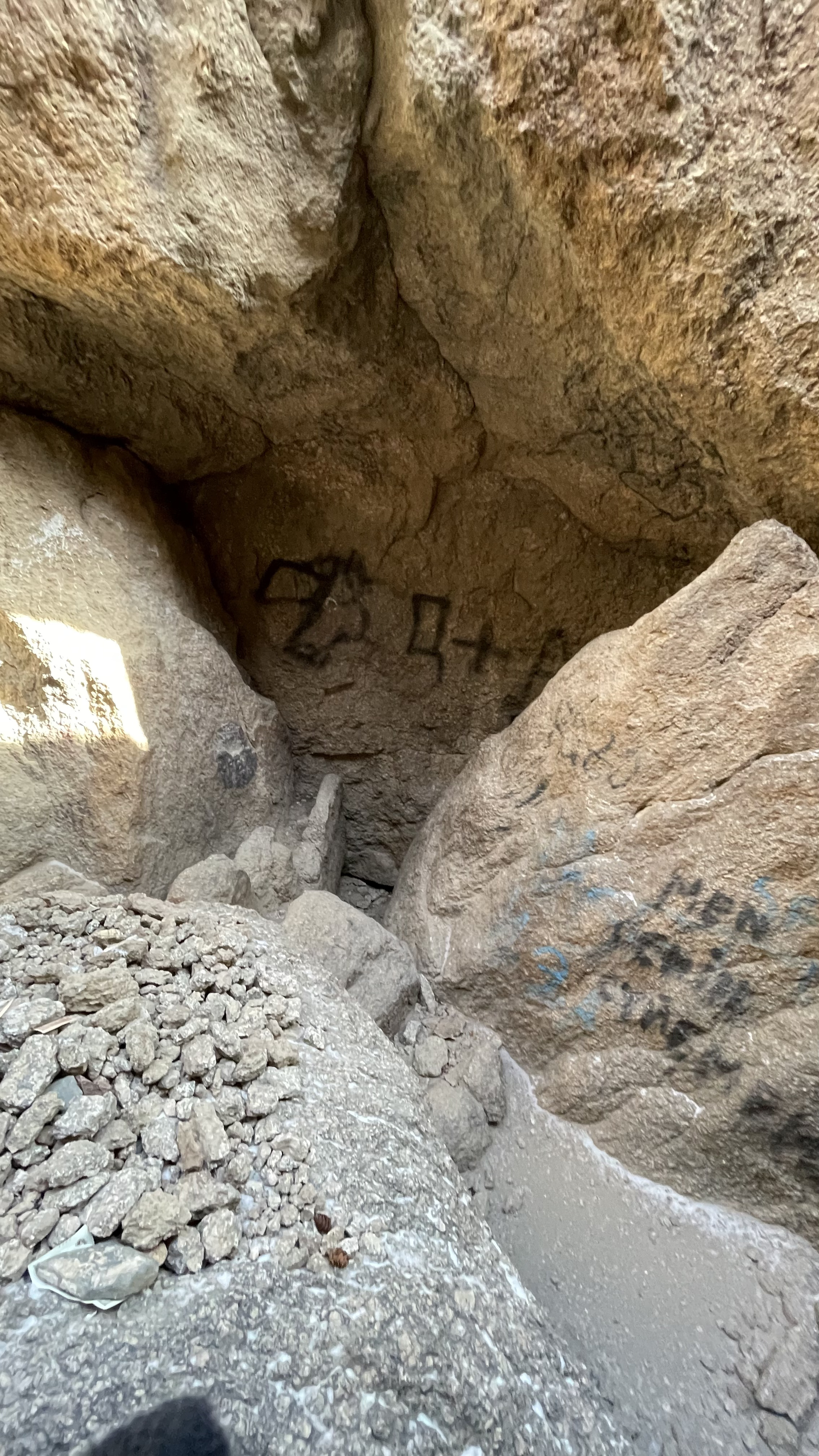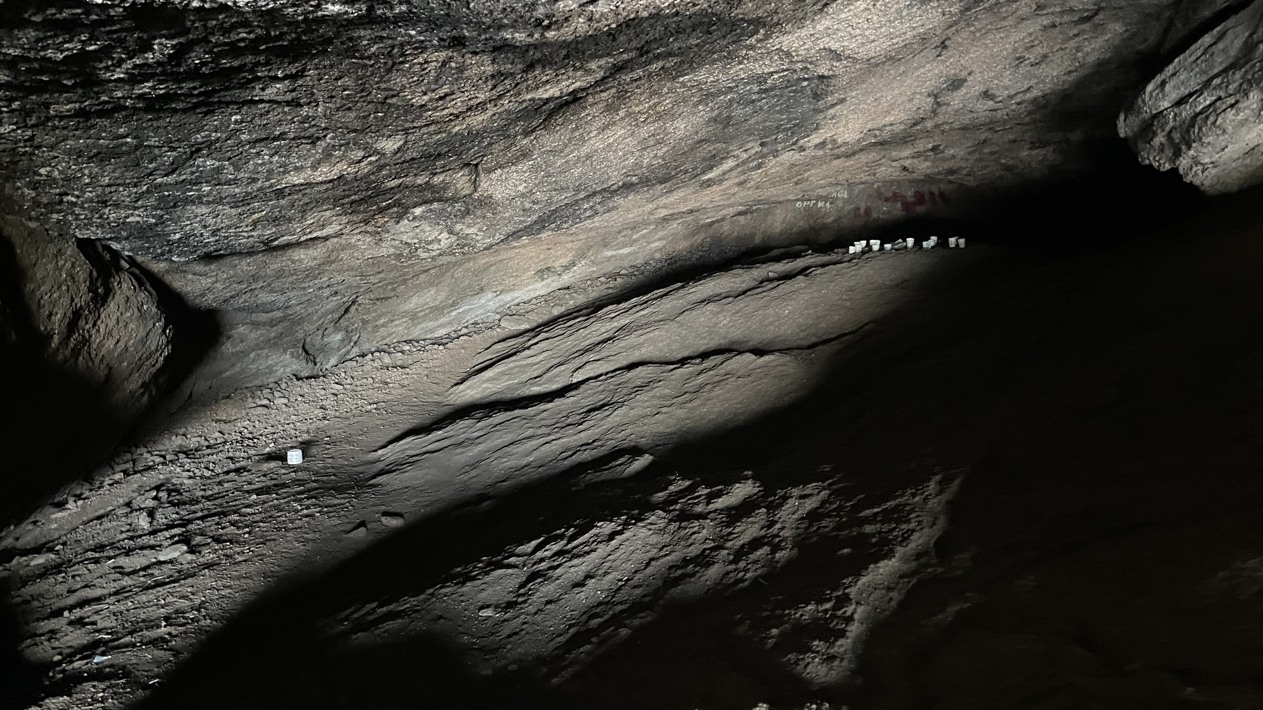 Here's the cave entrance from the outside, the cracking going horizontally up to the right: