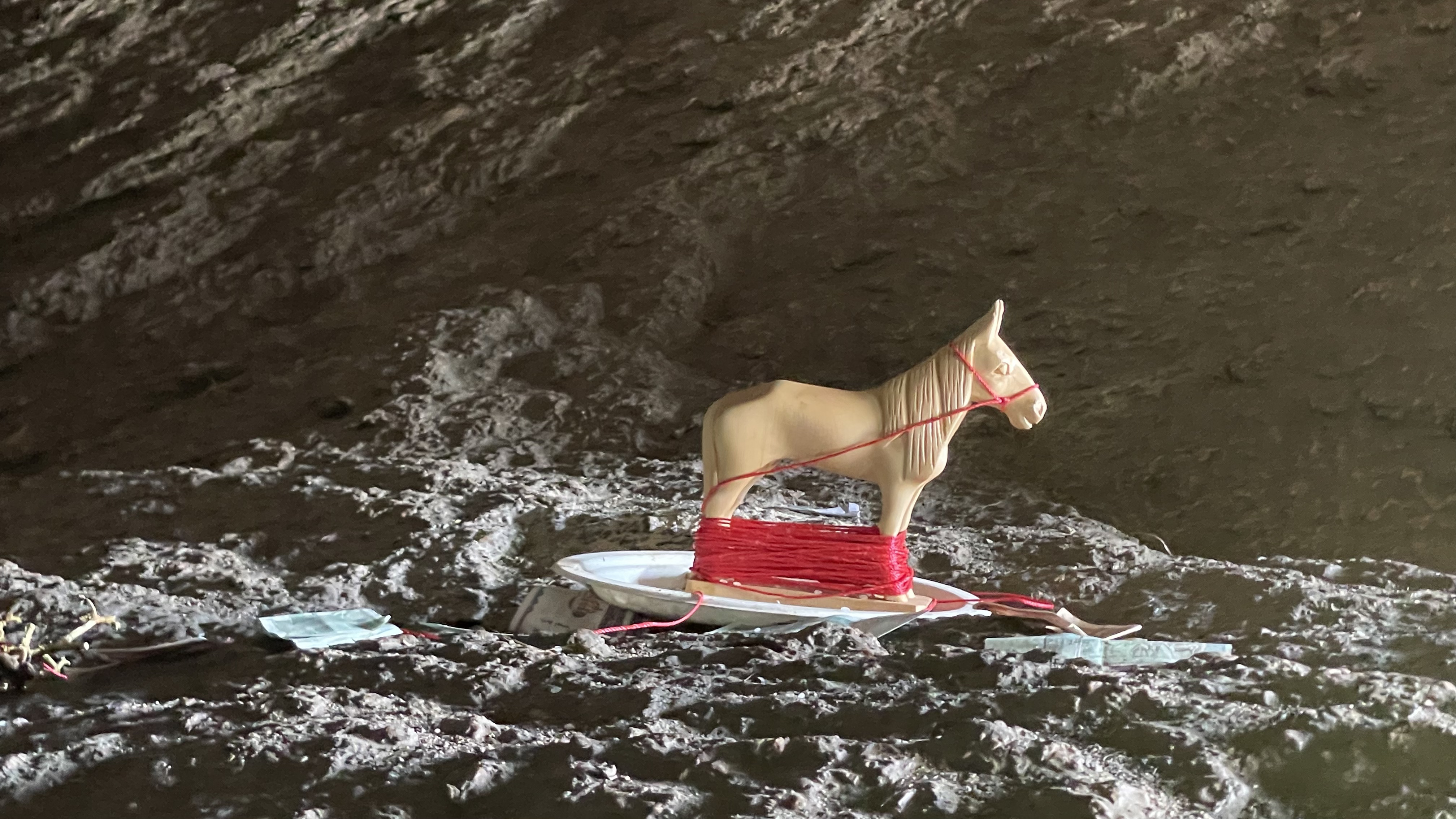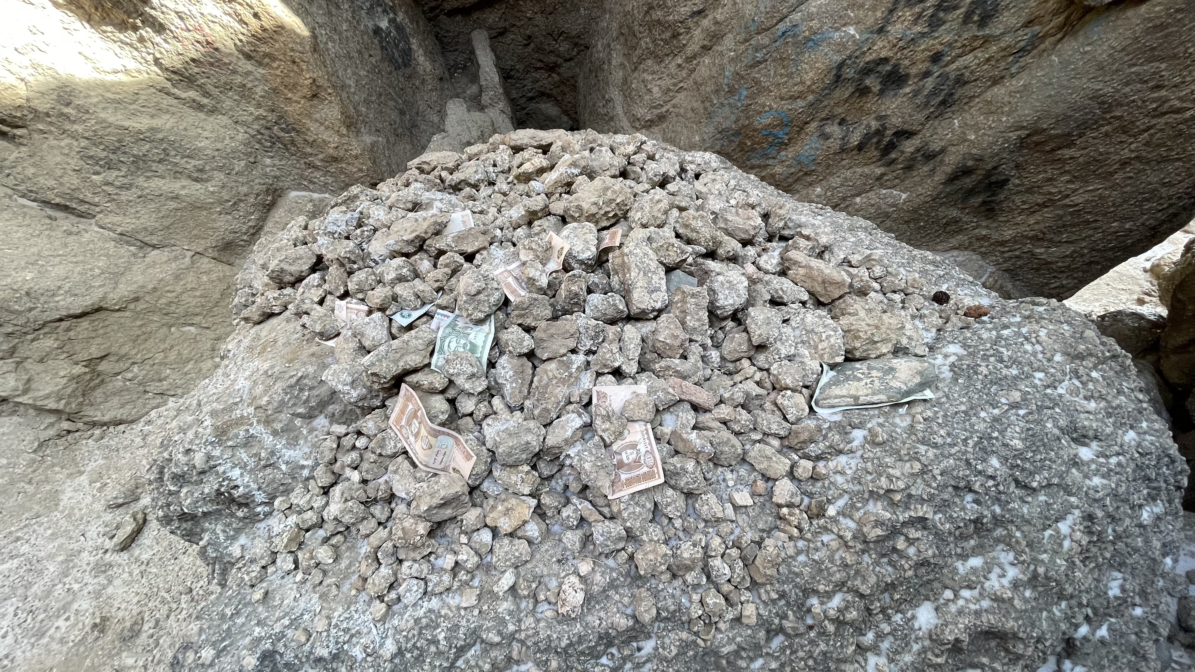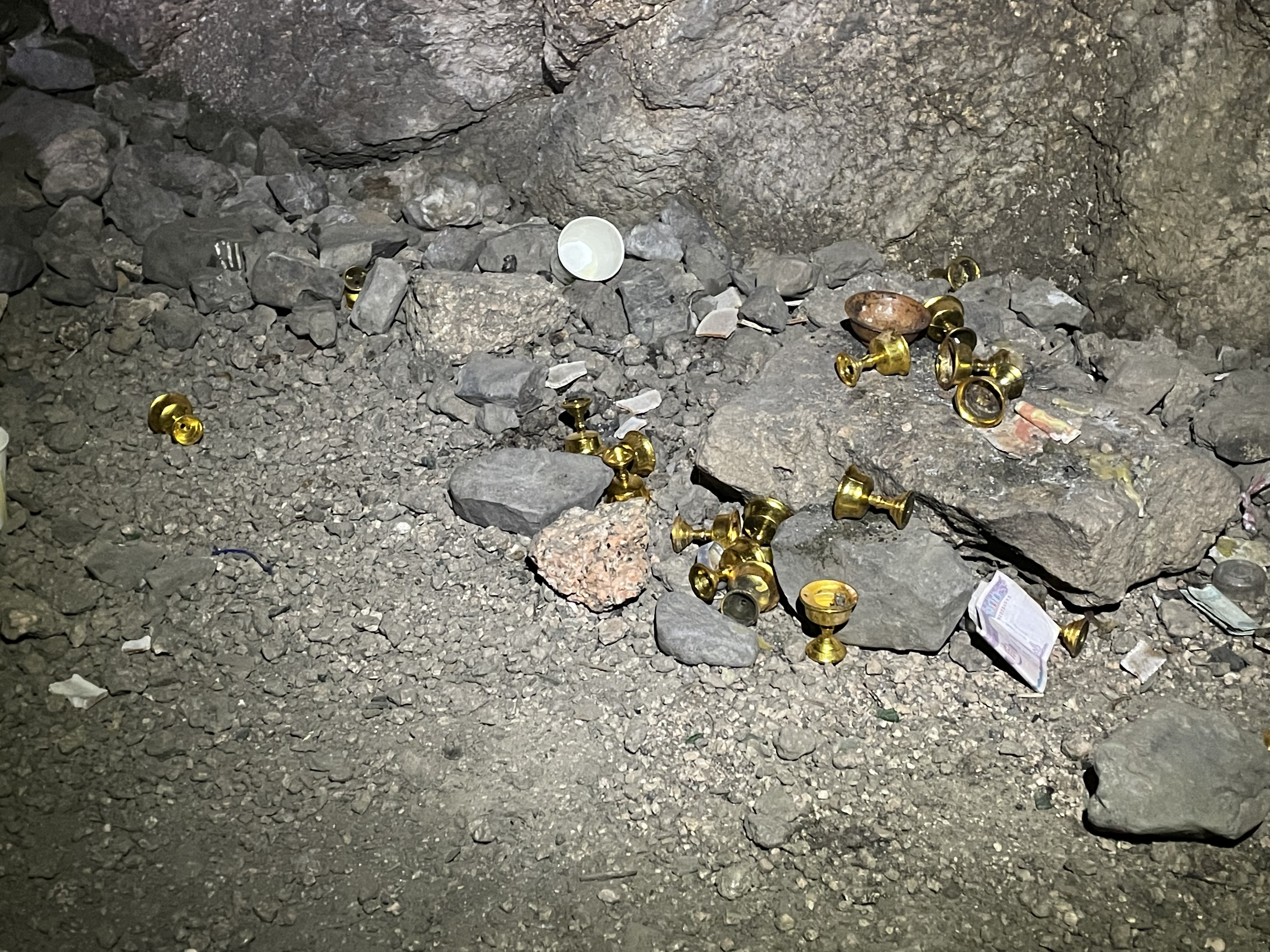 The main cave continues for 28.26 meters, so it is quite sizable for us Finns who have been used to tiny caves :-) Inside the cave, as is the tradition in Asia, people have brought small gifts: candles, cookies, a small toy horse, paper money, ... and even gold-colored goblets. While the entrance is just rock, further in the cave there's sand and dirt on the floor as well. The cave gets pretty low though in the end.