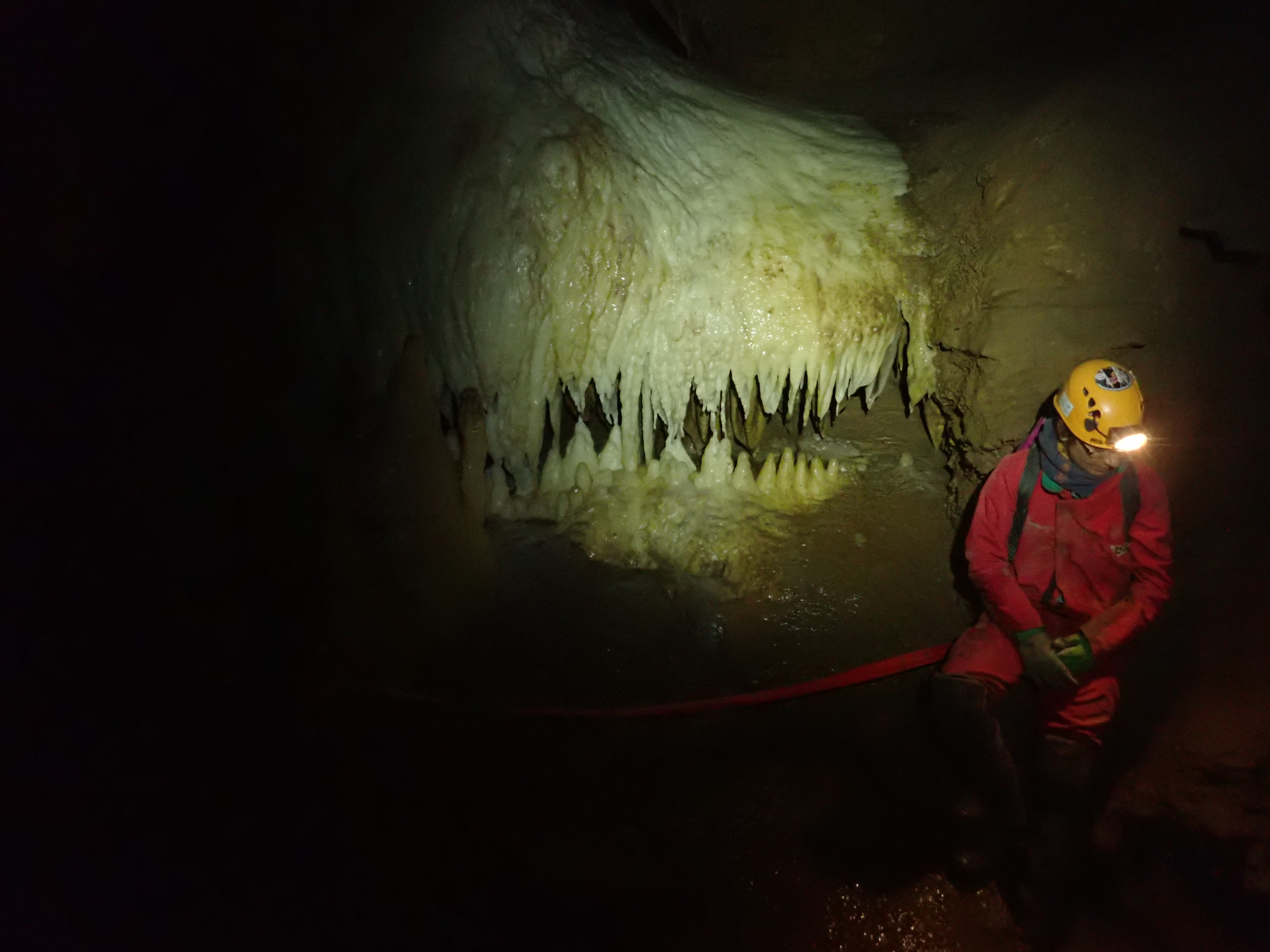 Our tour was quite varied. Entering the cave brought about the most challenging squeeze of the trip on the first few meters. Then we continued through various descents (nervously not belayed) until we reached one of the six rivers crossing through it at the level -64 meters. Following the river on a narrow but high passage you can reach the monster room with the white stalactites, but there are varied cave forms throughout the cave: