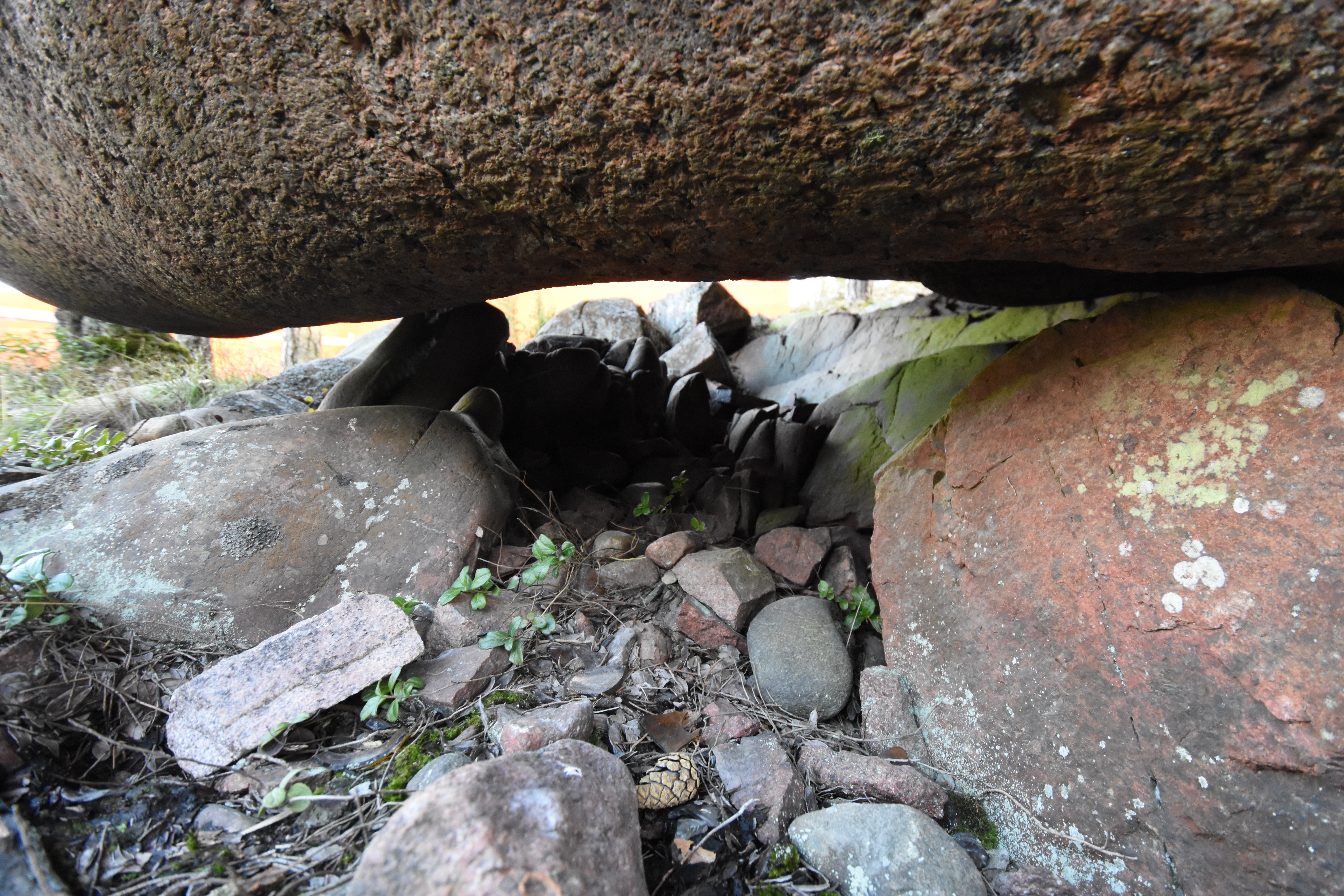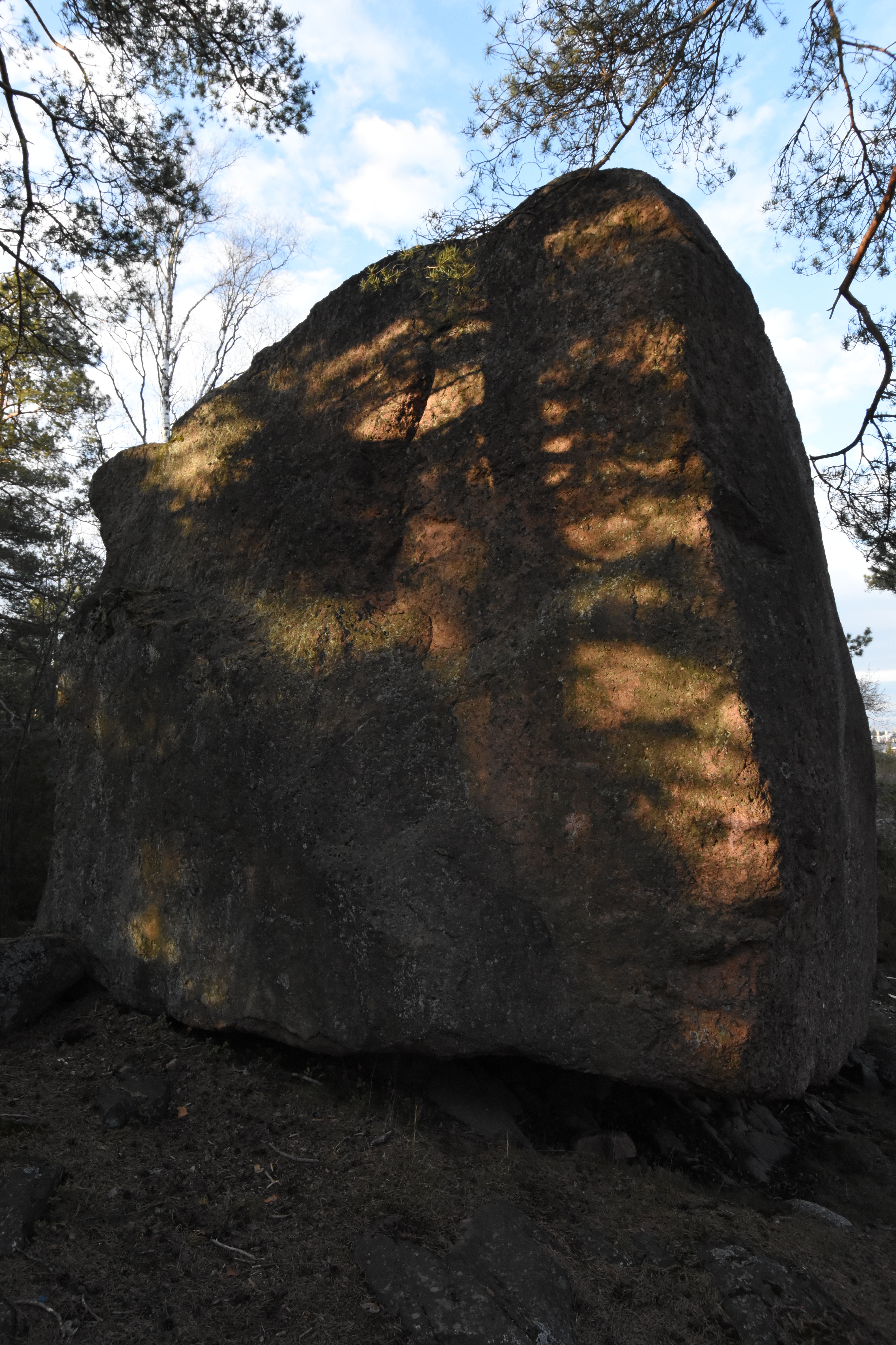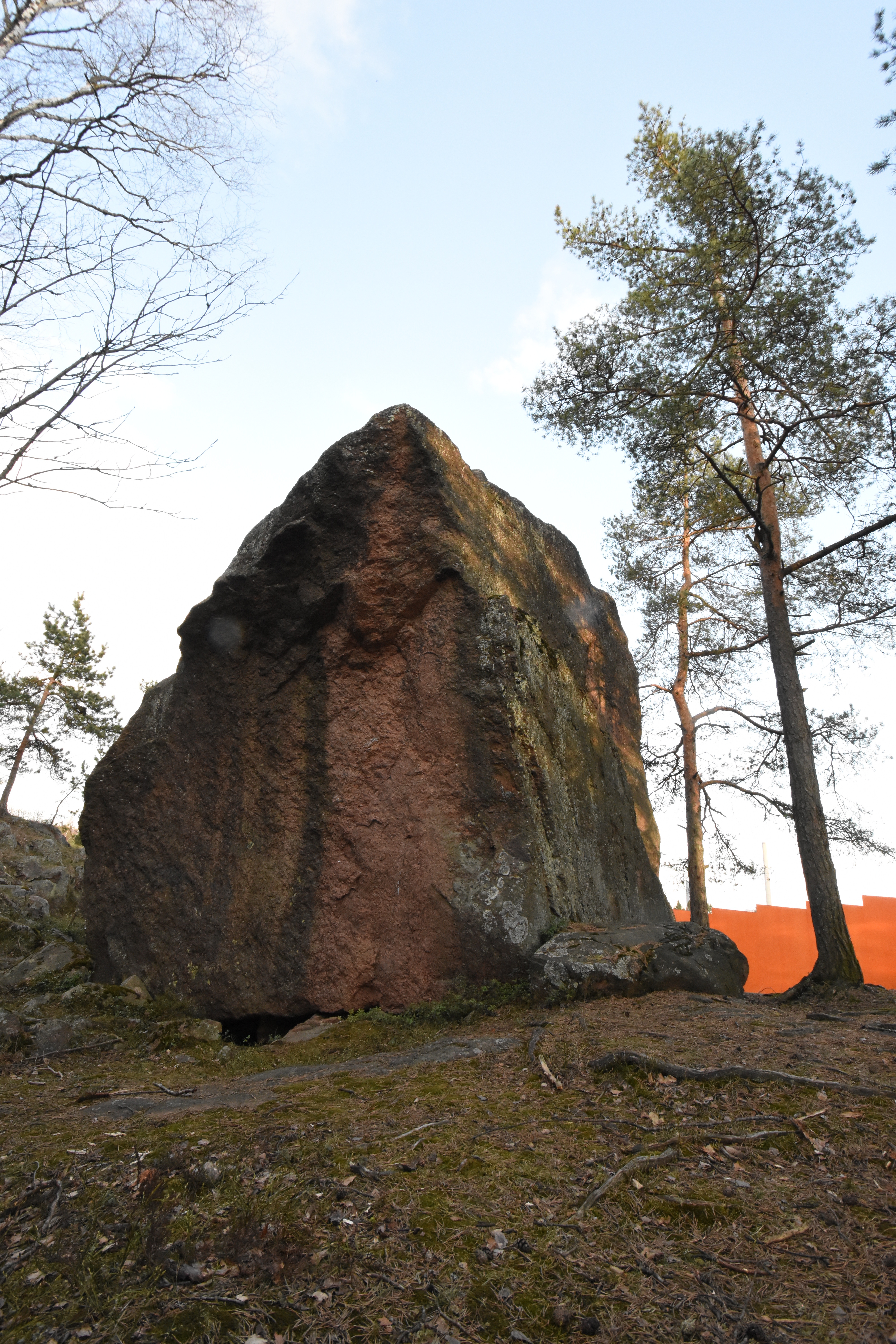 The boulder is here: N 60.15680902 E 24.70615906. There's a bit of space underneath, maybe could be called a cavelet (small cave, not classified as a proper cave).