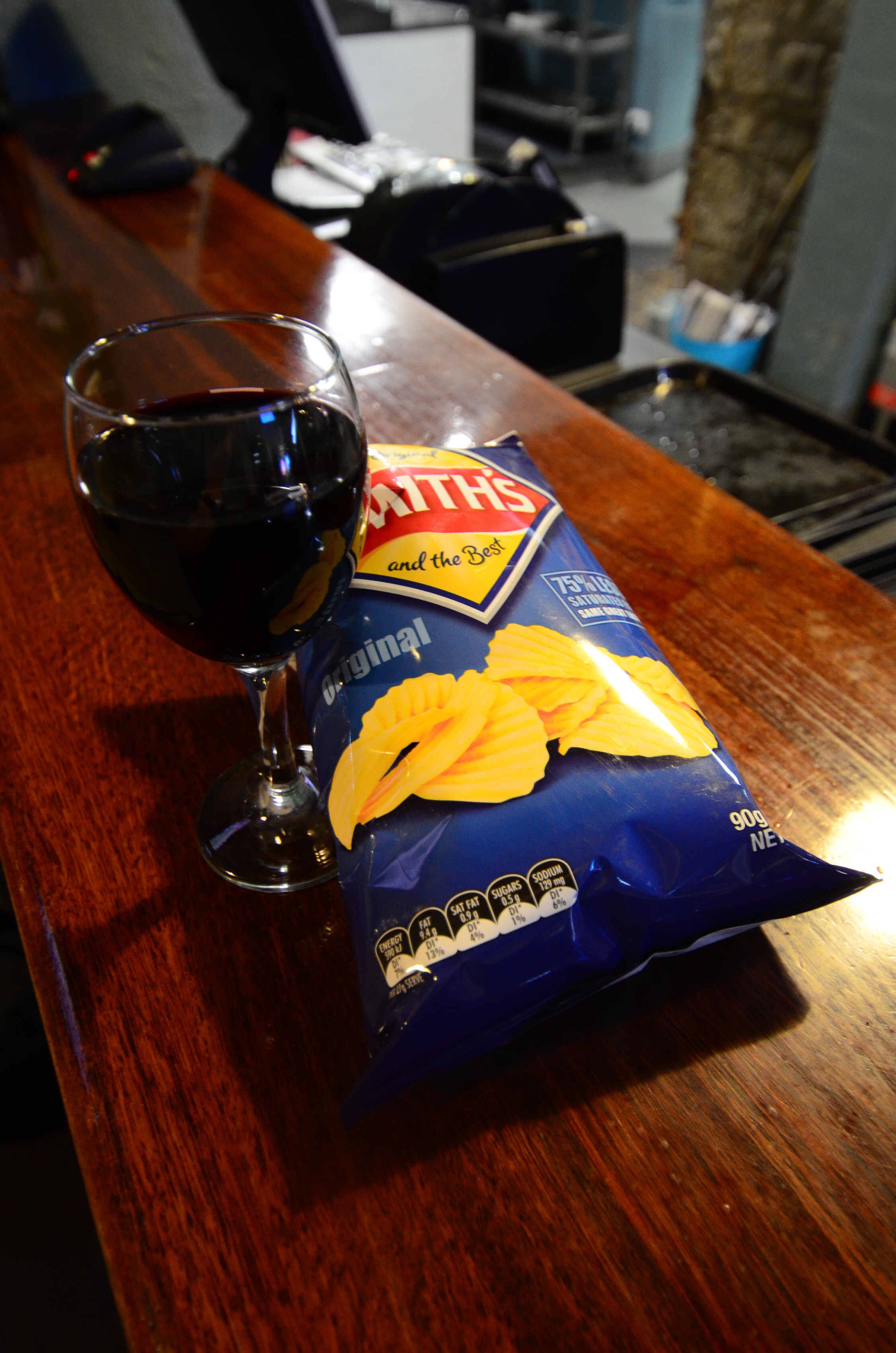 We stayed the night before our ski day at Mansfield, Victoria. This is a tiny town in the middle of nowhere, and due to our late arrival at 10pm there wasn't even food available. Here's my dinner, a glass of wine and chips: