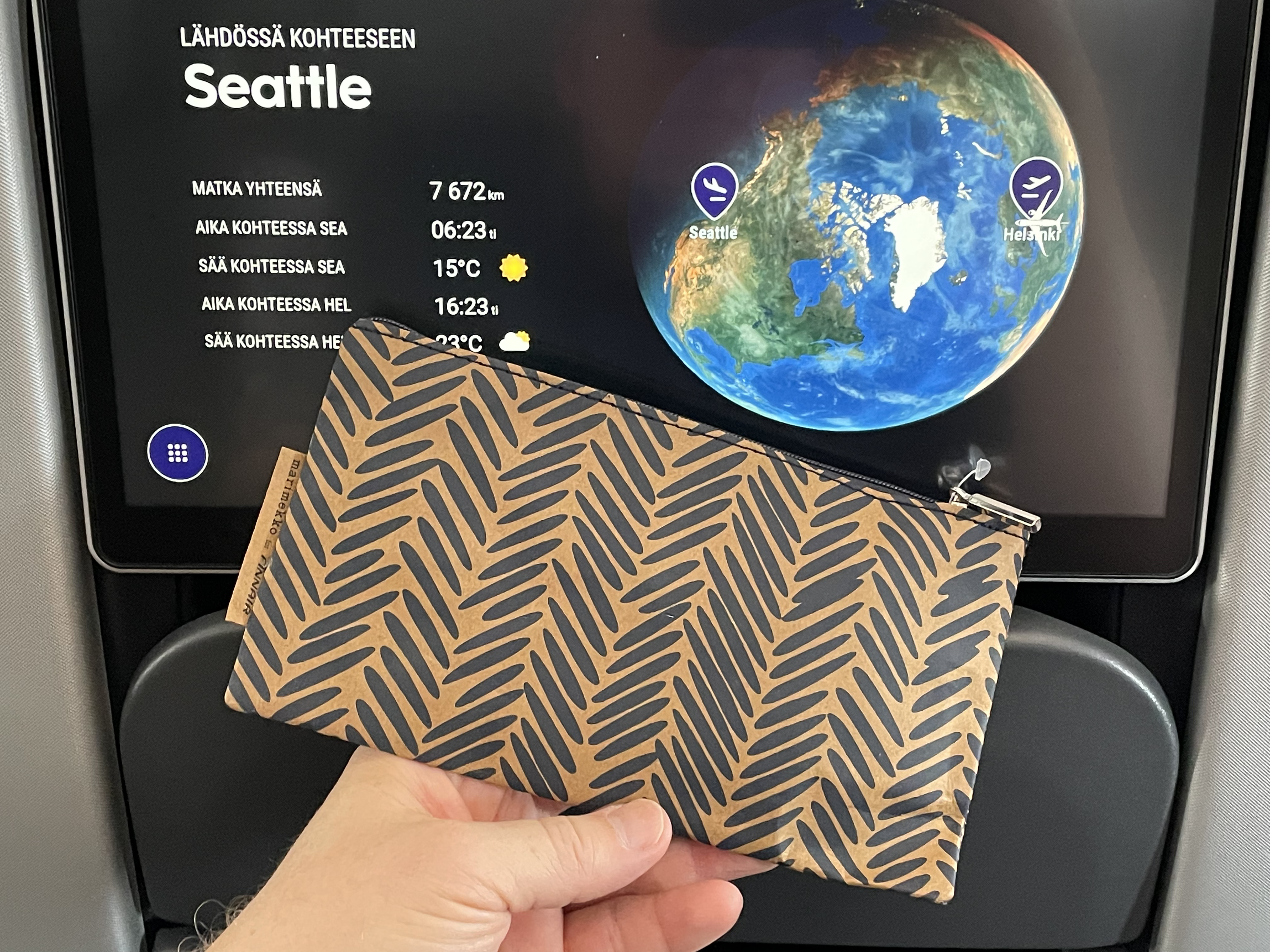 I managed to get a (small) upgrade to an economy extra seat in the Finnair plane. Nice, the seats are slightly wider so that I can actually fit in. Used my two last Finnair European vouchers to do that. To my surprise we also got one of the Finnair's Marimekko pouches with earplugs, eye covers, etc. on these seats. Nice touch.