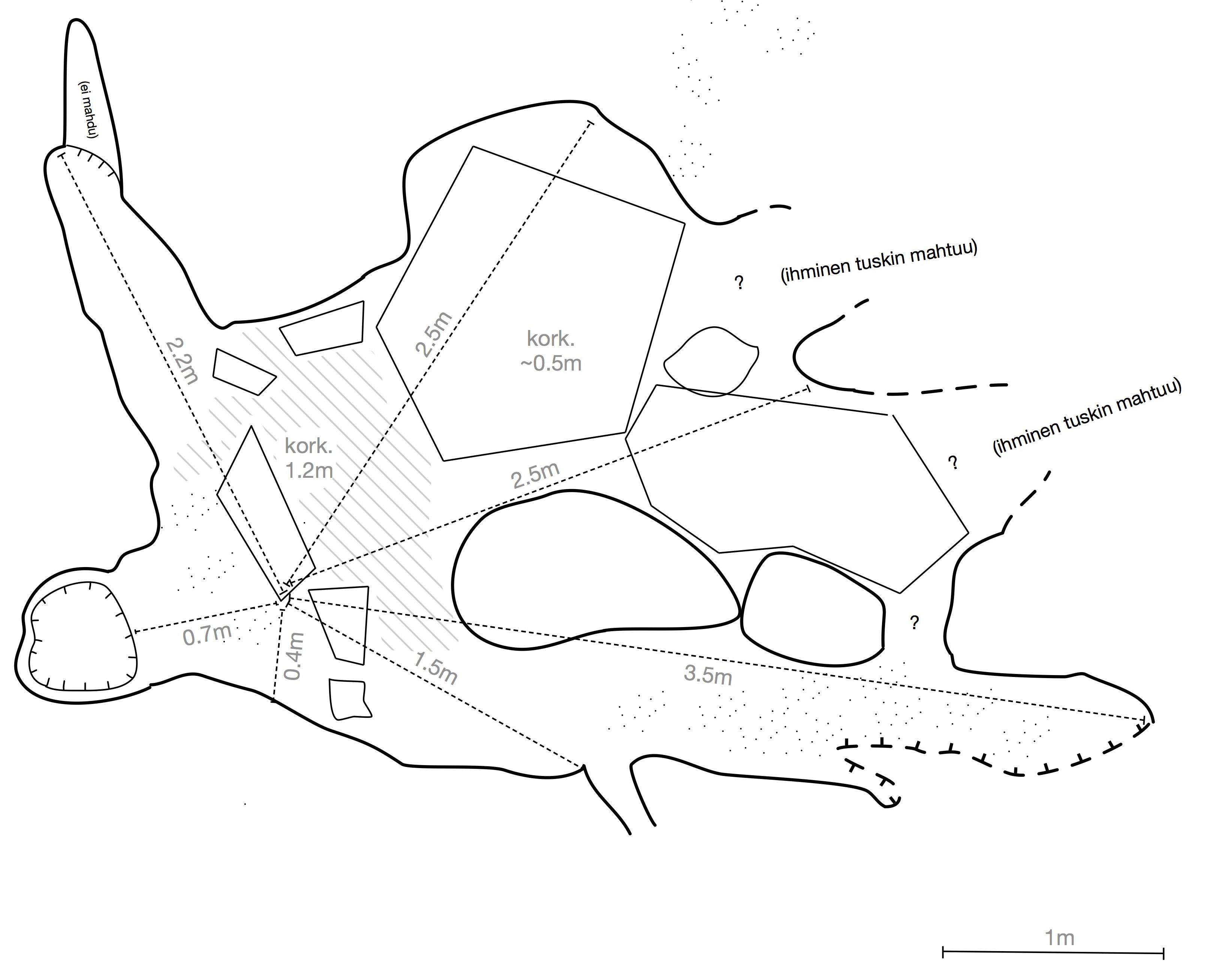 Oddly, the book of caves in Finland ("Suomen luolat") does indeed list caves in this location, just that it calls them "Kattilajärven onkalot". Kattilajärvi is a lake a bit further away, behind some other lakes, so the name confused me. Particularly when there are cliffs and boulder fields also in Kattilajärvi.