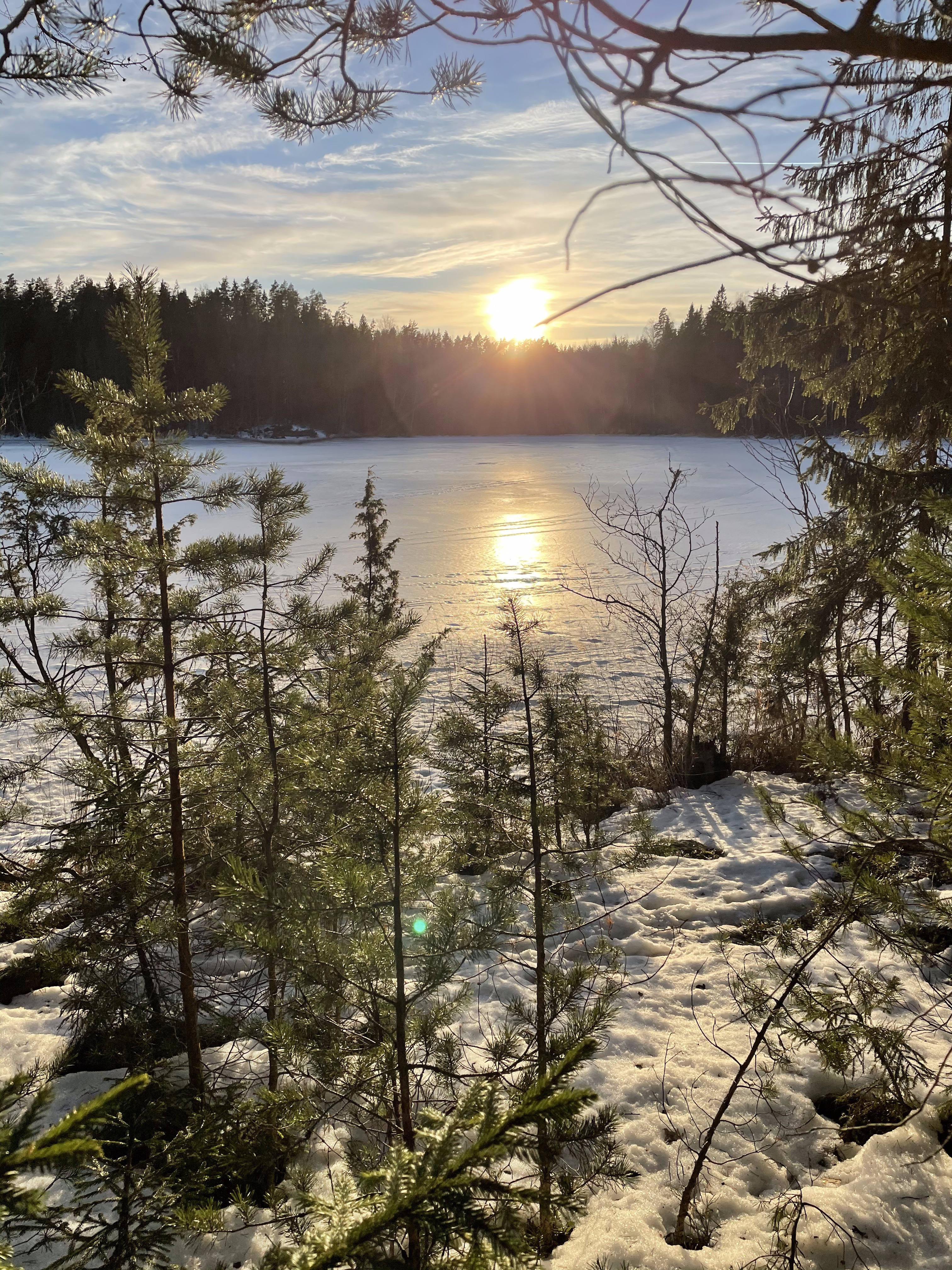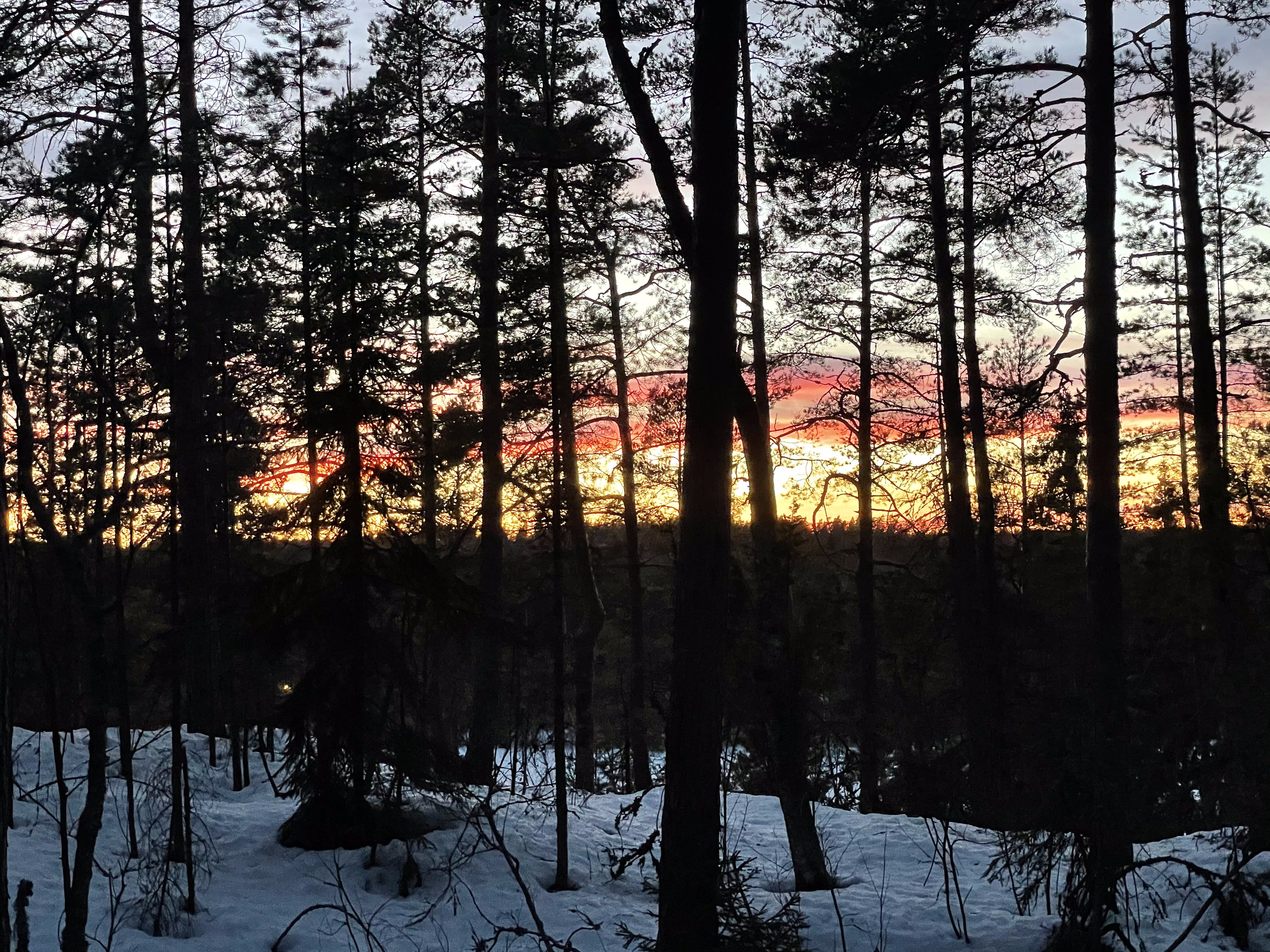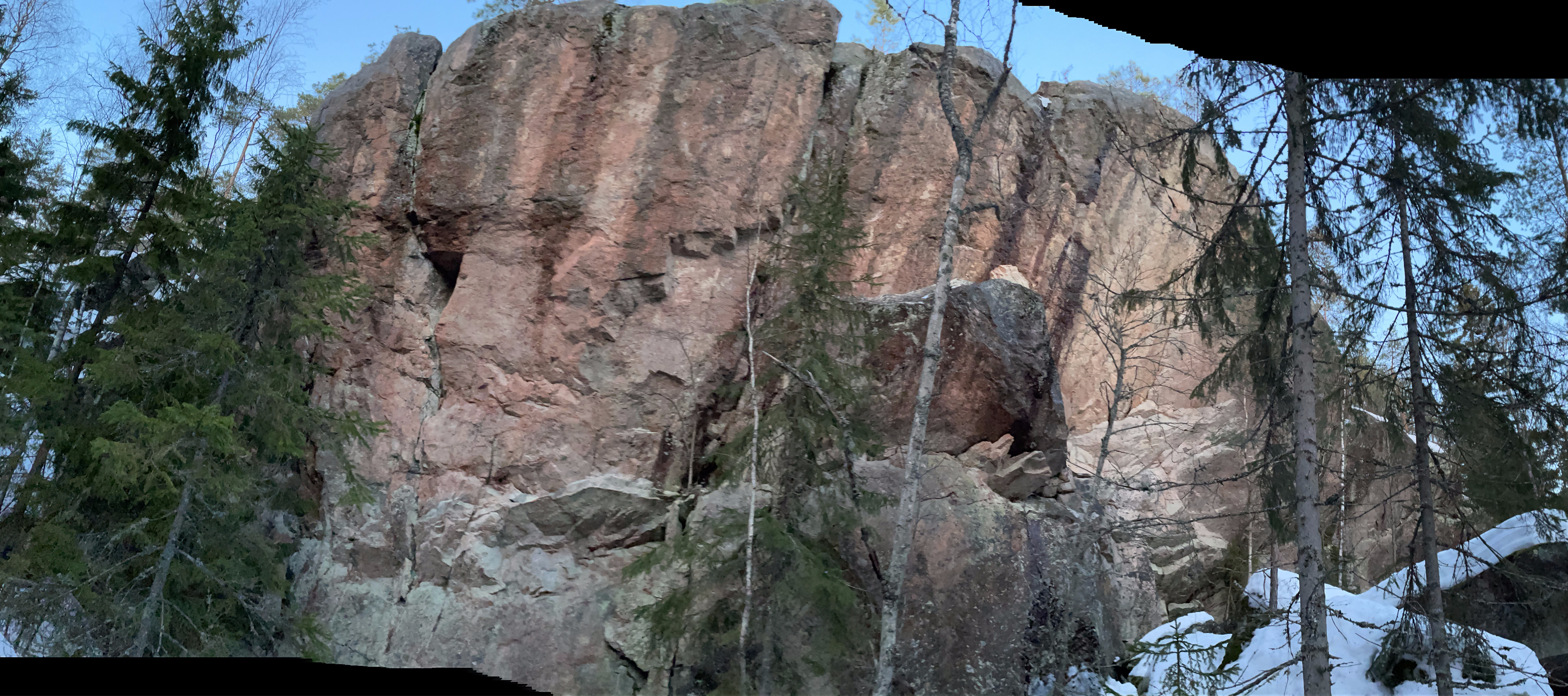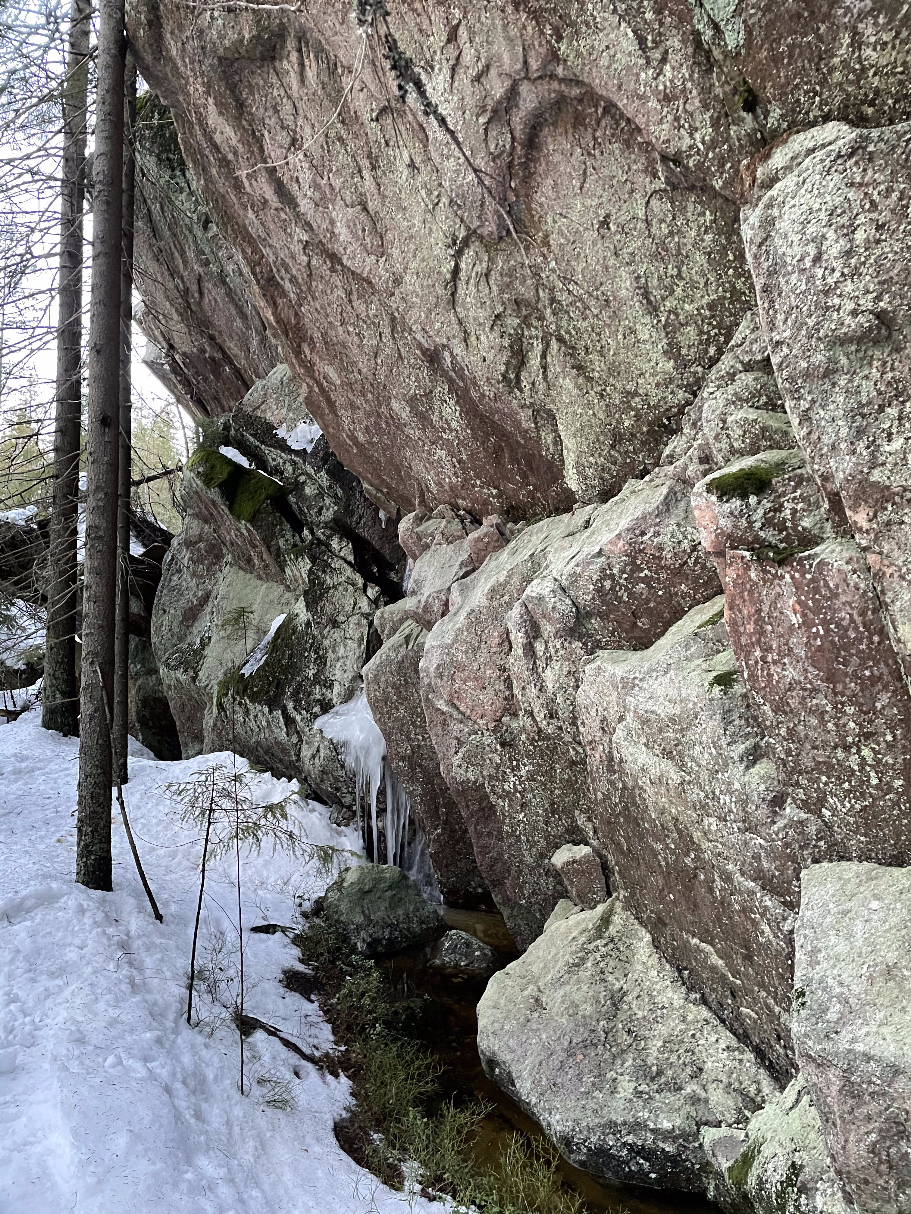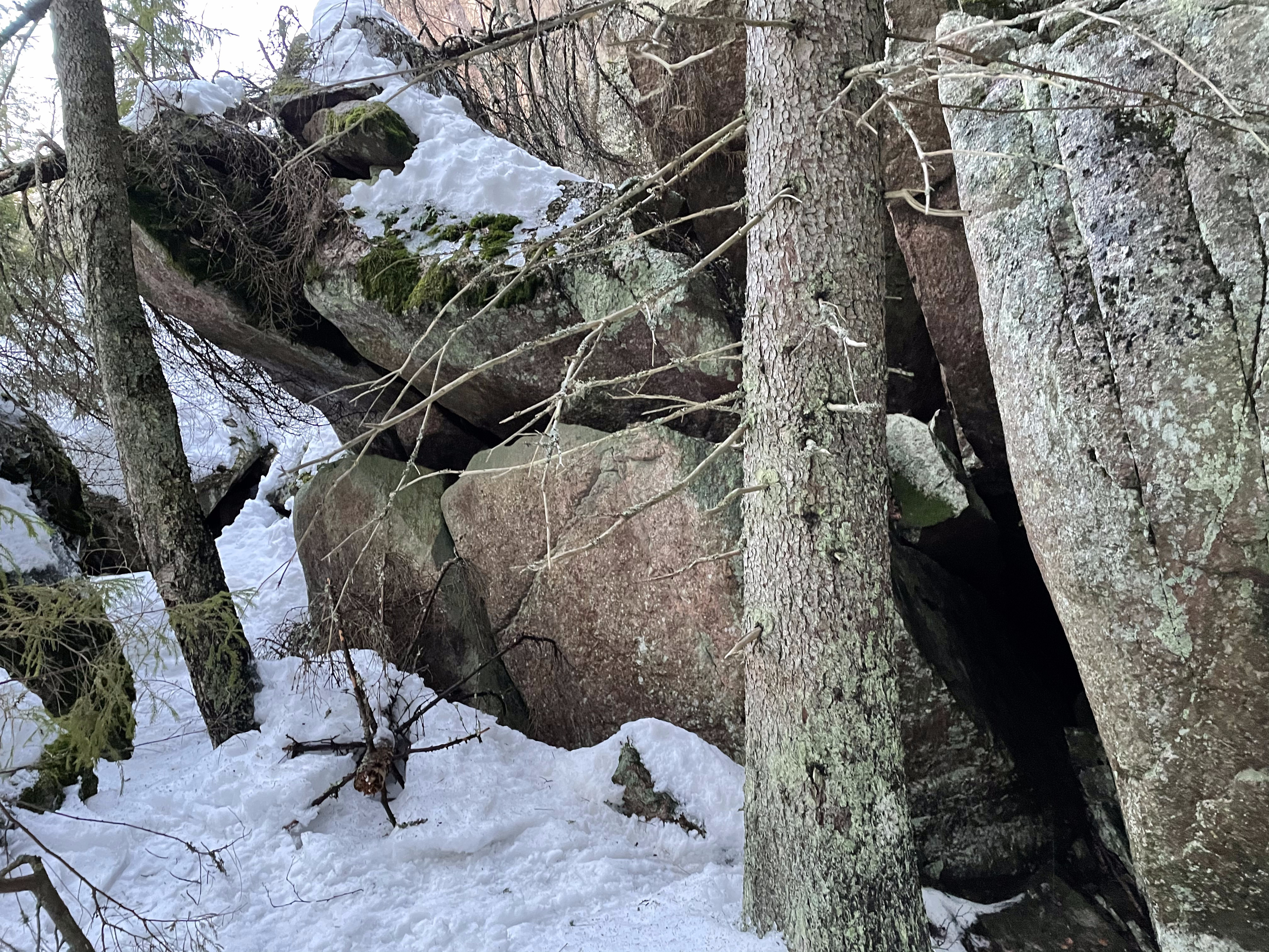 I was hiking around on my snow shoes, going around lake Kattilajärvi in Nuuksio. I was there for the sake of a nice walk in the winter weather, but also wanted to check out the many cliffs for possible caves. I've been here before, and saw for instance a wonderful roof cave. But then I came across a big cliff with a number of caves, not reported by others as far as I can tell.