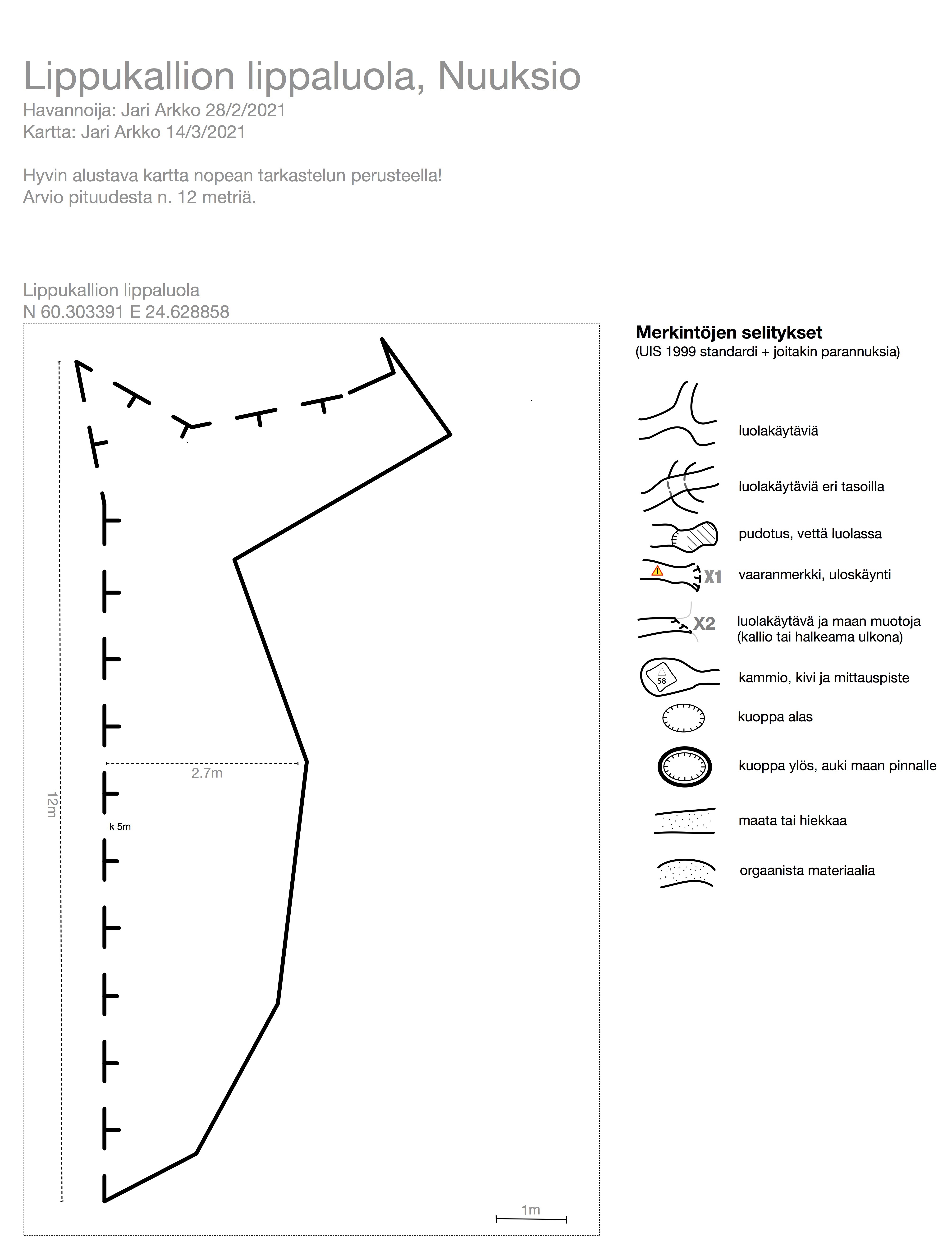 The shelter cave is at N 60.303391 E 24.628858. A simple cave map of the shape of the shelter/roof can be found here, also shown below: