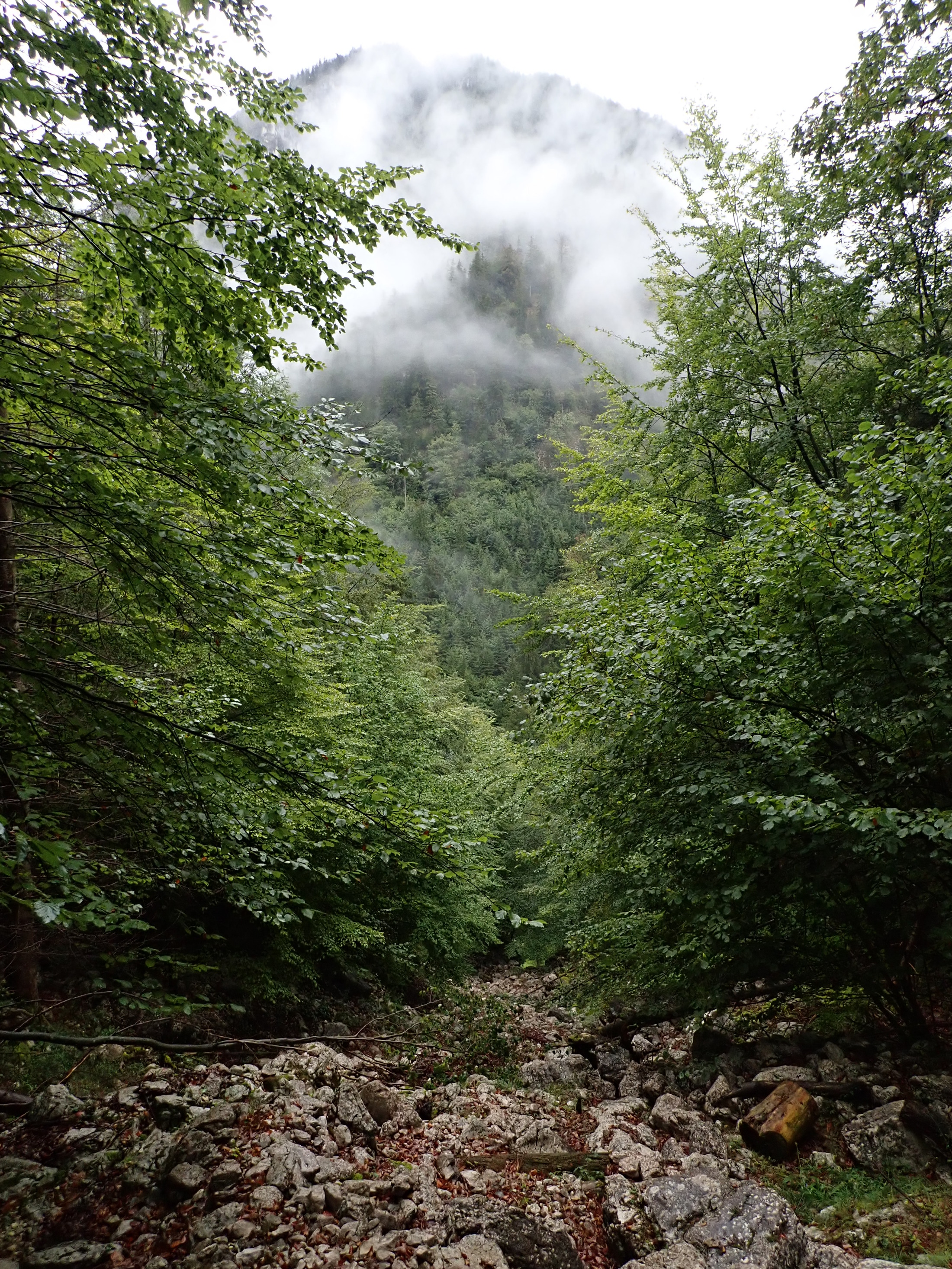 Did I say trail? Obviously there is no trail. For this cave, we needed to hike up a bit over 200 meters on a steep riverbed. And while the rain had stopped, all stones were wet and slippery. And loose; we had to be careful to not cause a rock fall. And sure enough, we did not cause a rock fall but next to us in the forest we hear rumbling noise. We catch a glimpse of a rock speeding down. I look for the sides of the gully we are on, to find a safe spot in case we are the target of the next rock. Fortunately, there is no more rock fall.