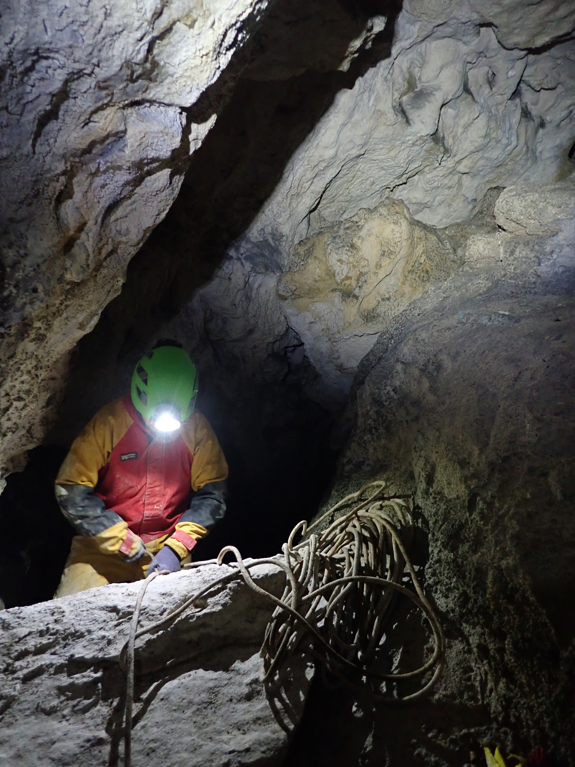 Getting to the lower parts is not easy for me, however. The other end of the cave forms a pit that one has to descend with rope. Which I had not done before... but it turns out that it wasn't so difficult. We reach the wet bottom of the cave, with fine clay mud and moonmilk covering most surfaces. And then climb up, with the rope being needed only for a part of the ascent.