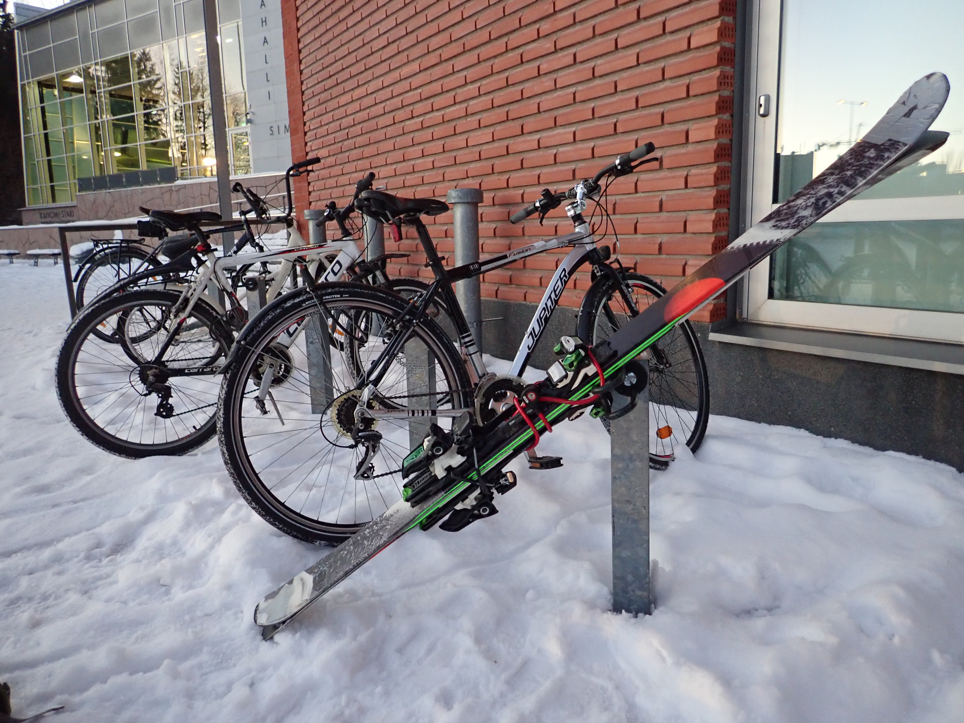No car, no skilift, no problem! My car is broken, but fortunately, since I live in the world's happiest town, I can walk to the ski hill, ski down to the bus stop, take the public transport to the public swimming pool, and lock my skis in the bike rack. And return by train.