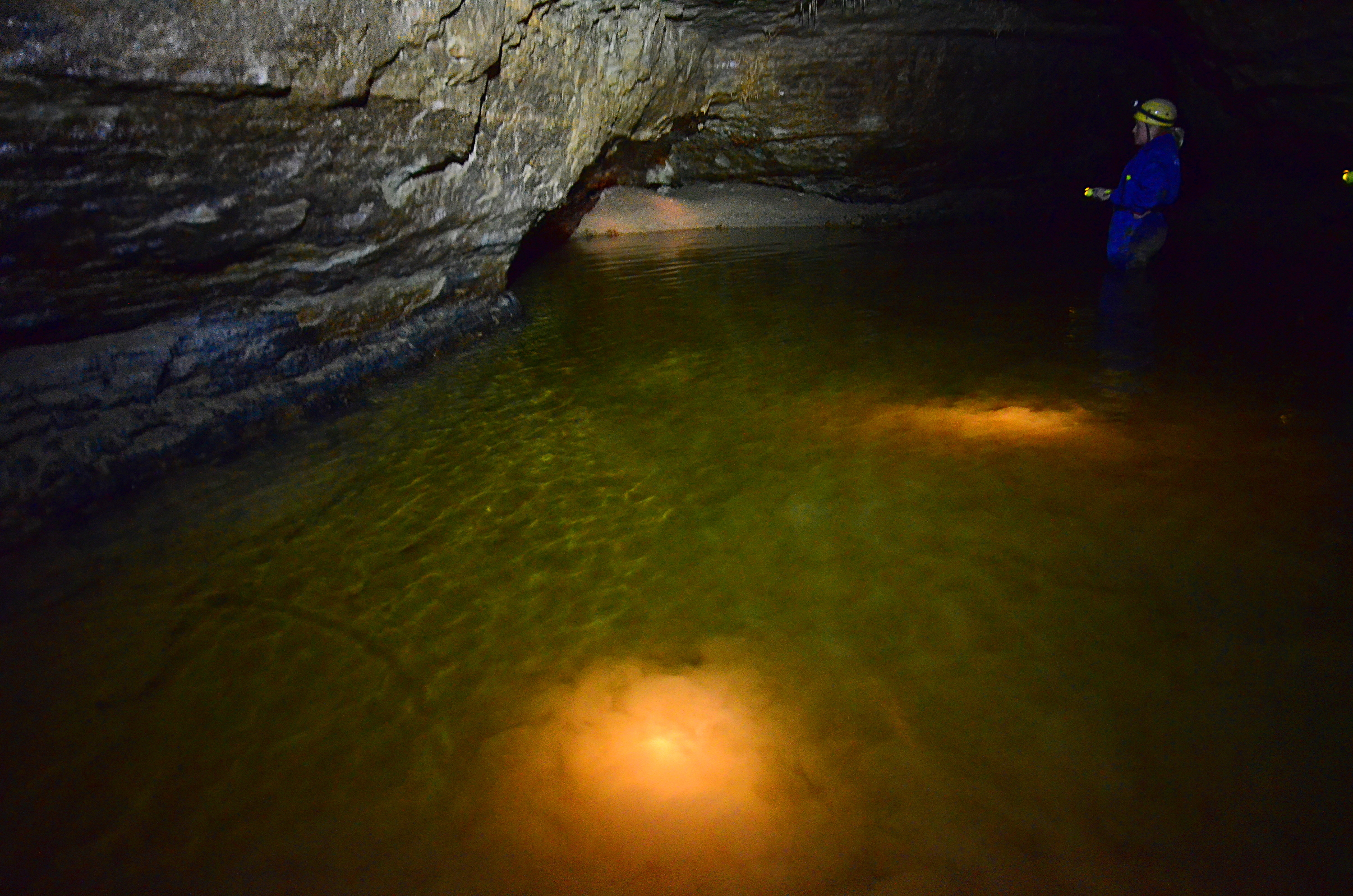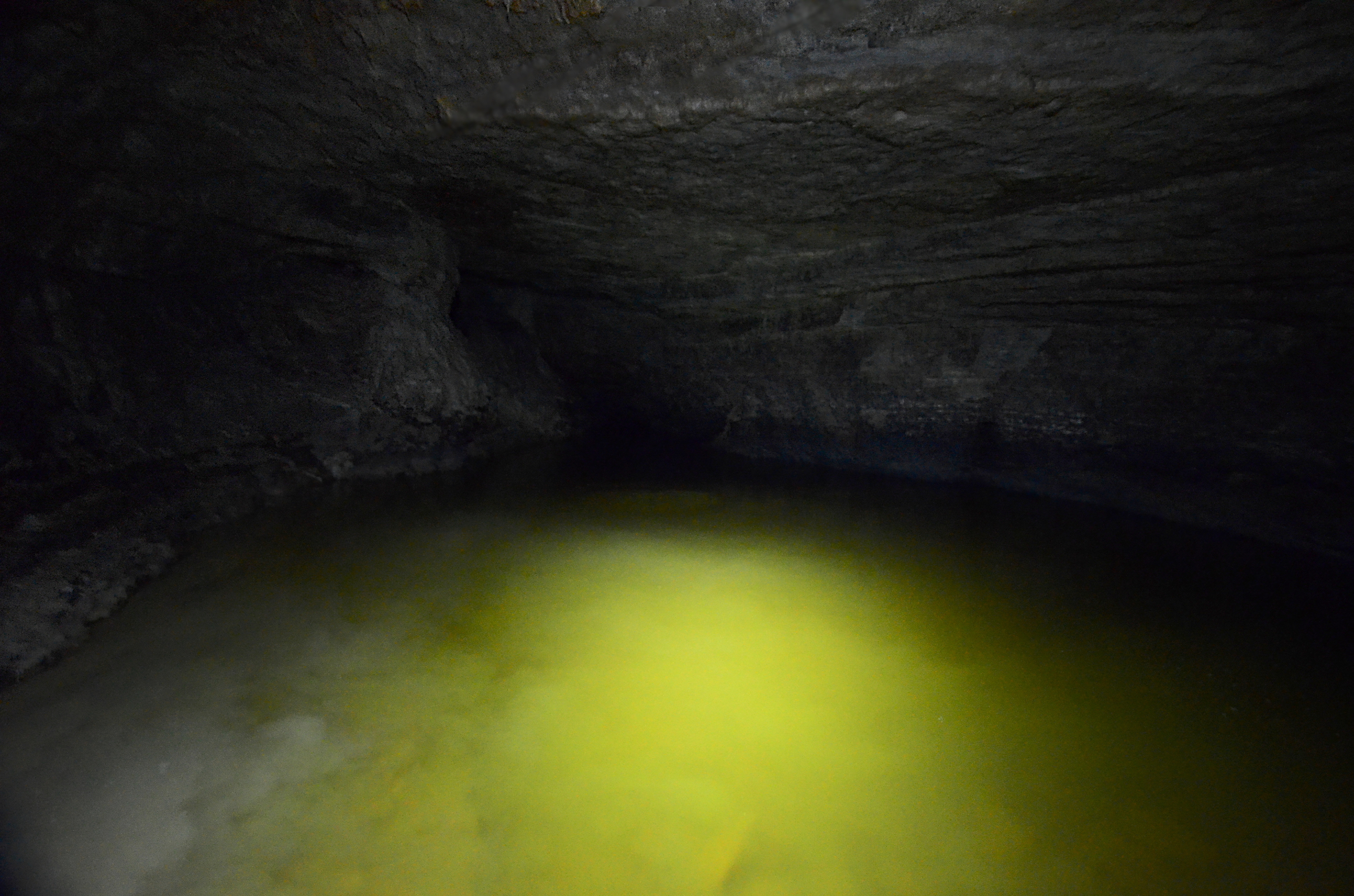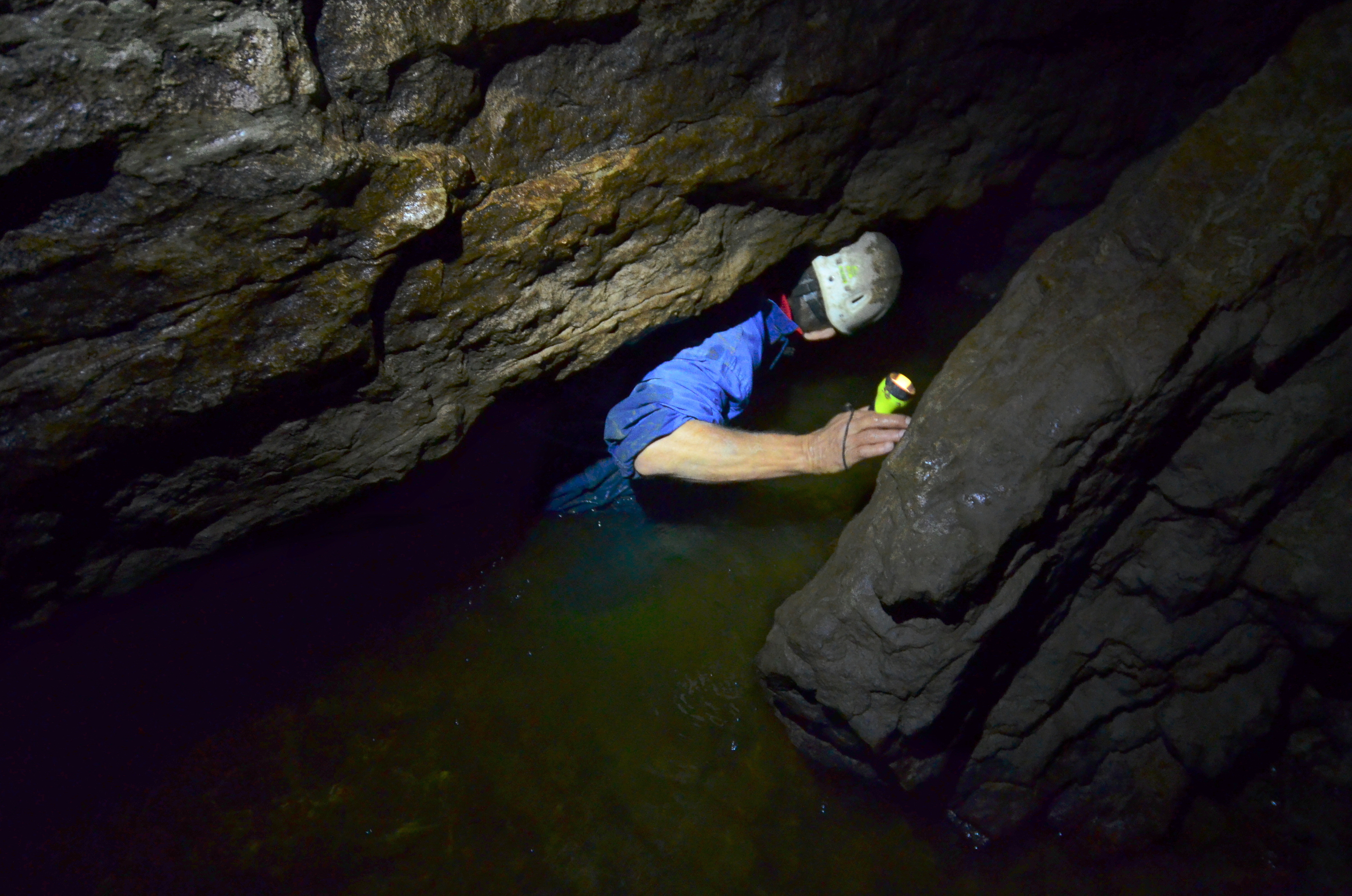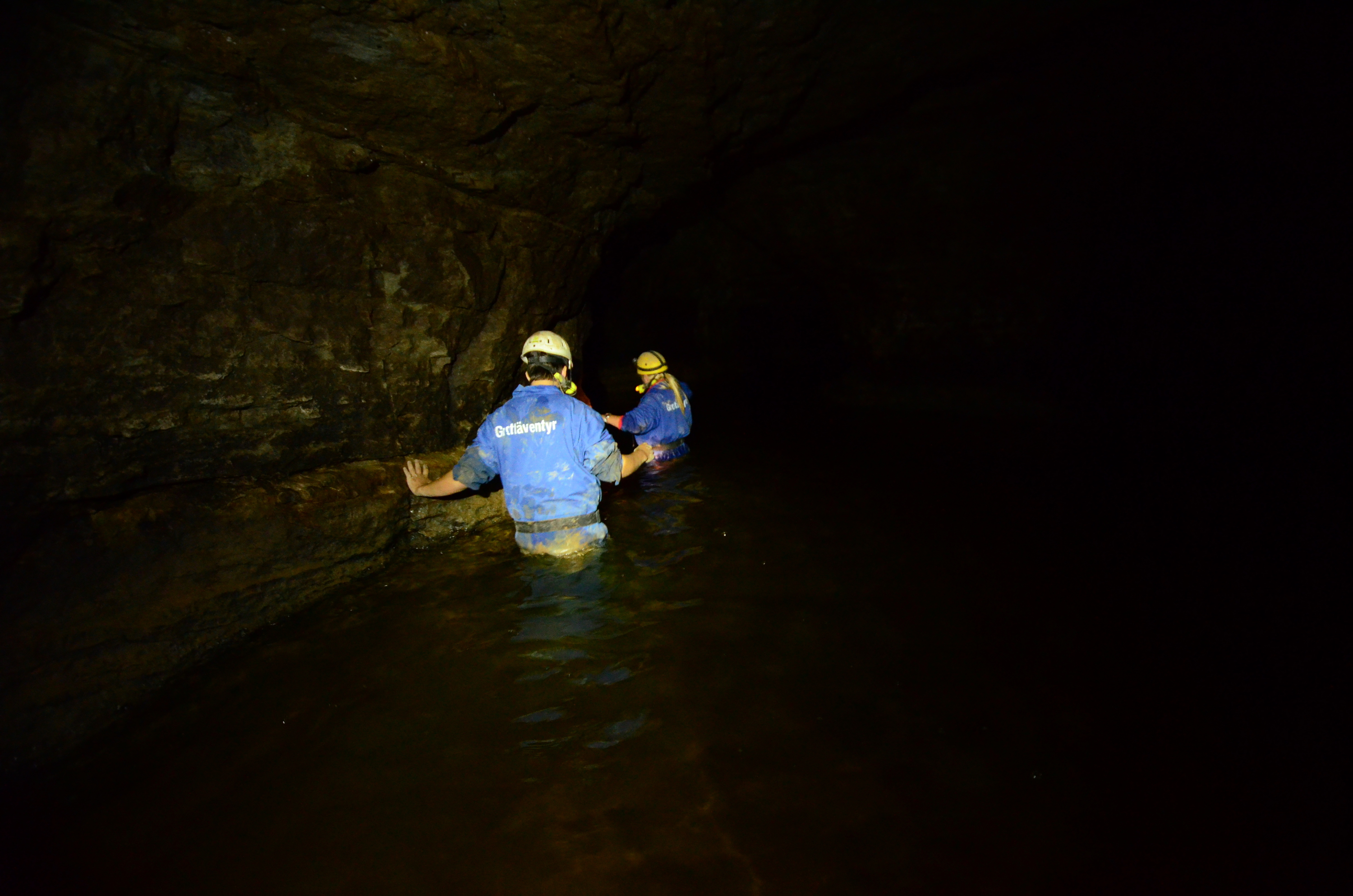 We used wade-fishing pants, high enough to reach our armpits. But they were not high enough to protect us completely from the water, as it was too deep in places. In a couple of points we had to either jump a few meters or swim. This would not have been such an issue, but doing that while carrying two cameras was a challenge for me. In some other points we held on to rocks on the tunnel walls to keep ourselves afloat. In another case we had to move on our bottoms along a small underwater ledge in the tunnel wall.
