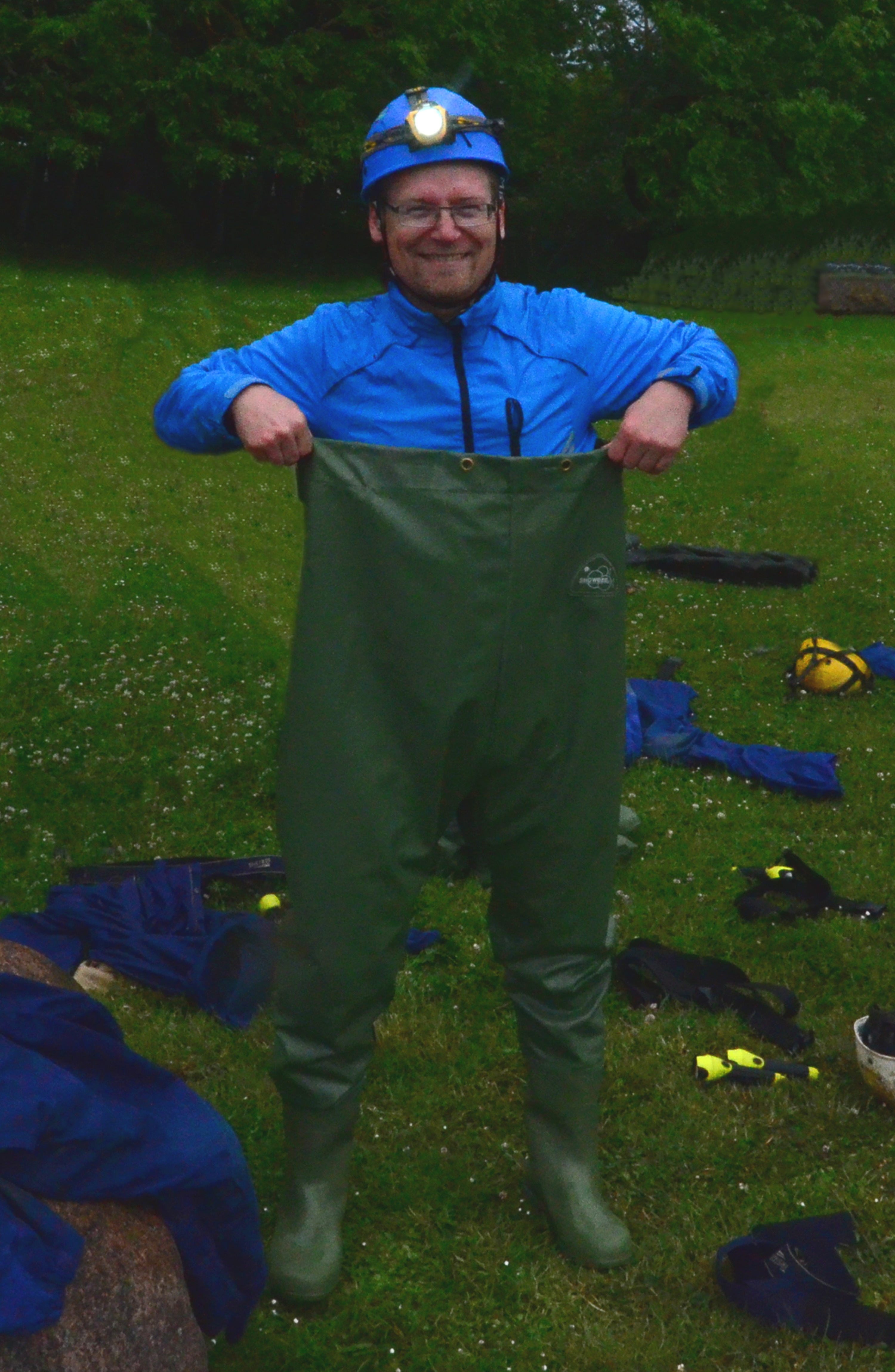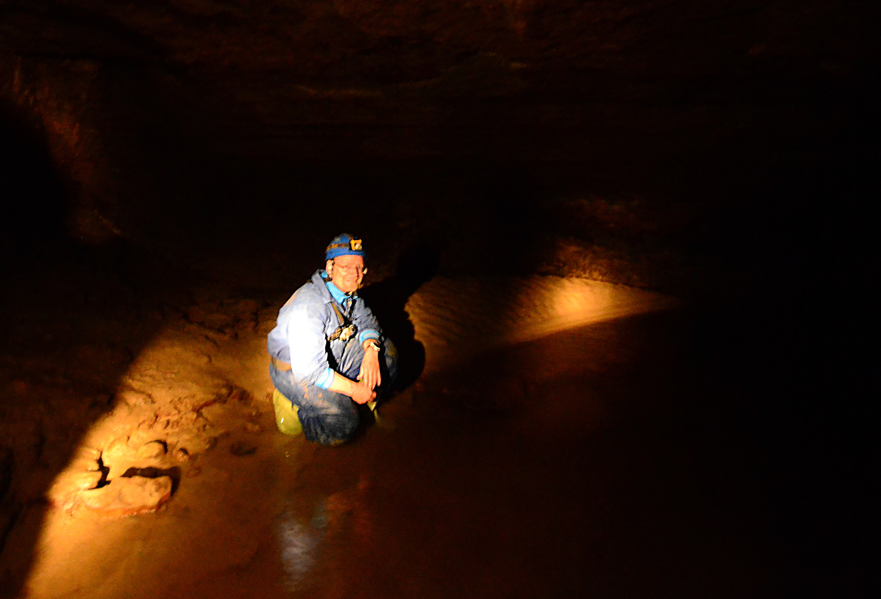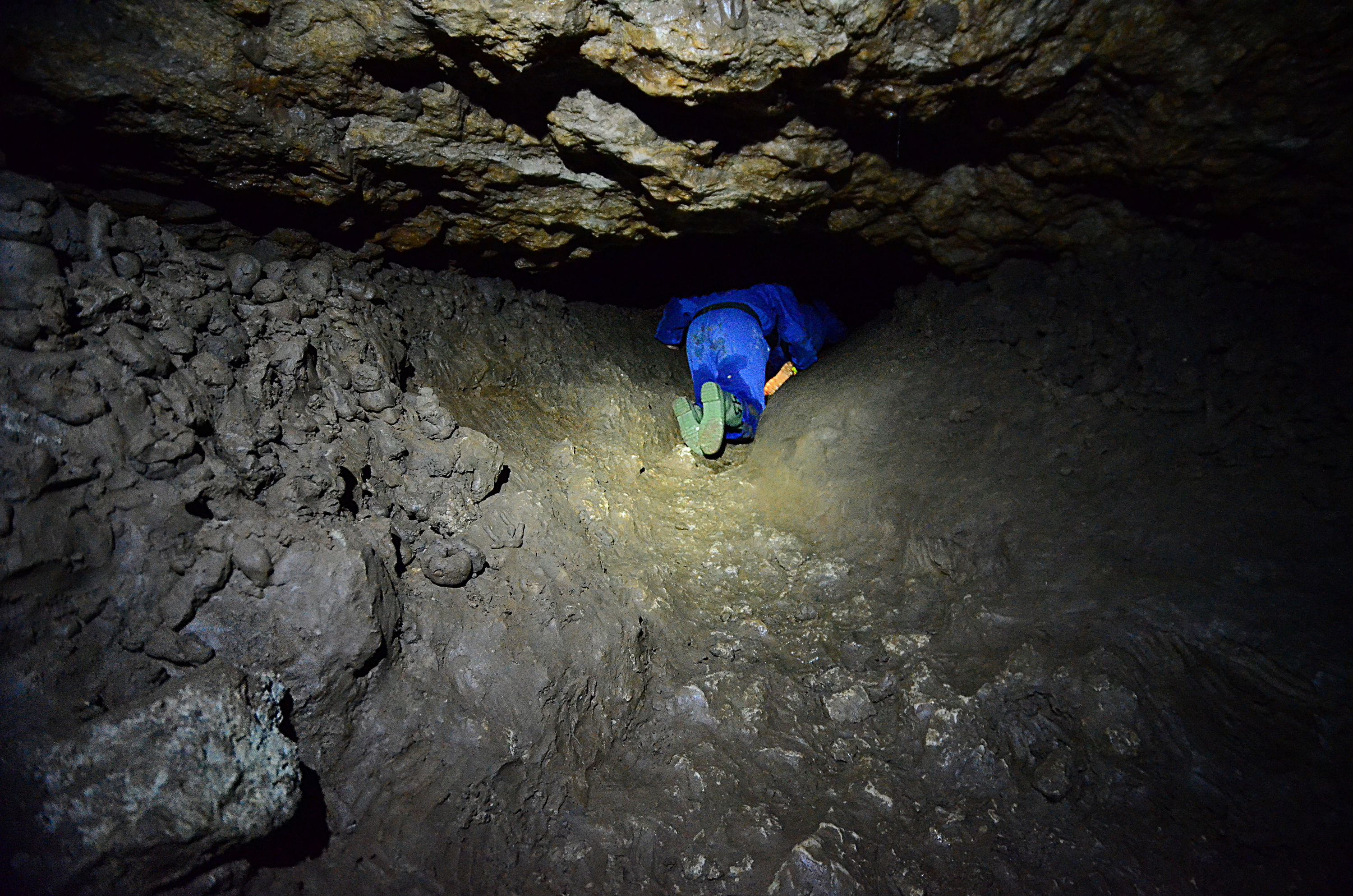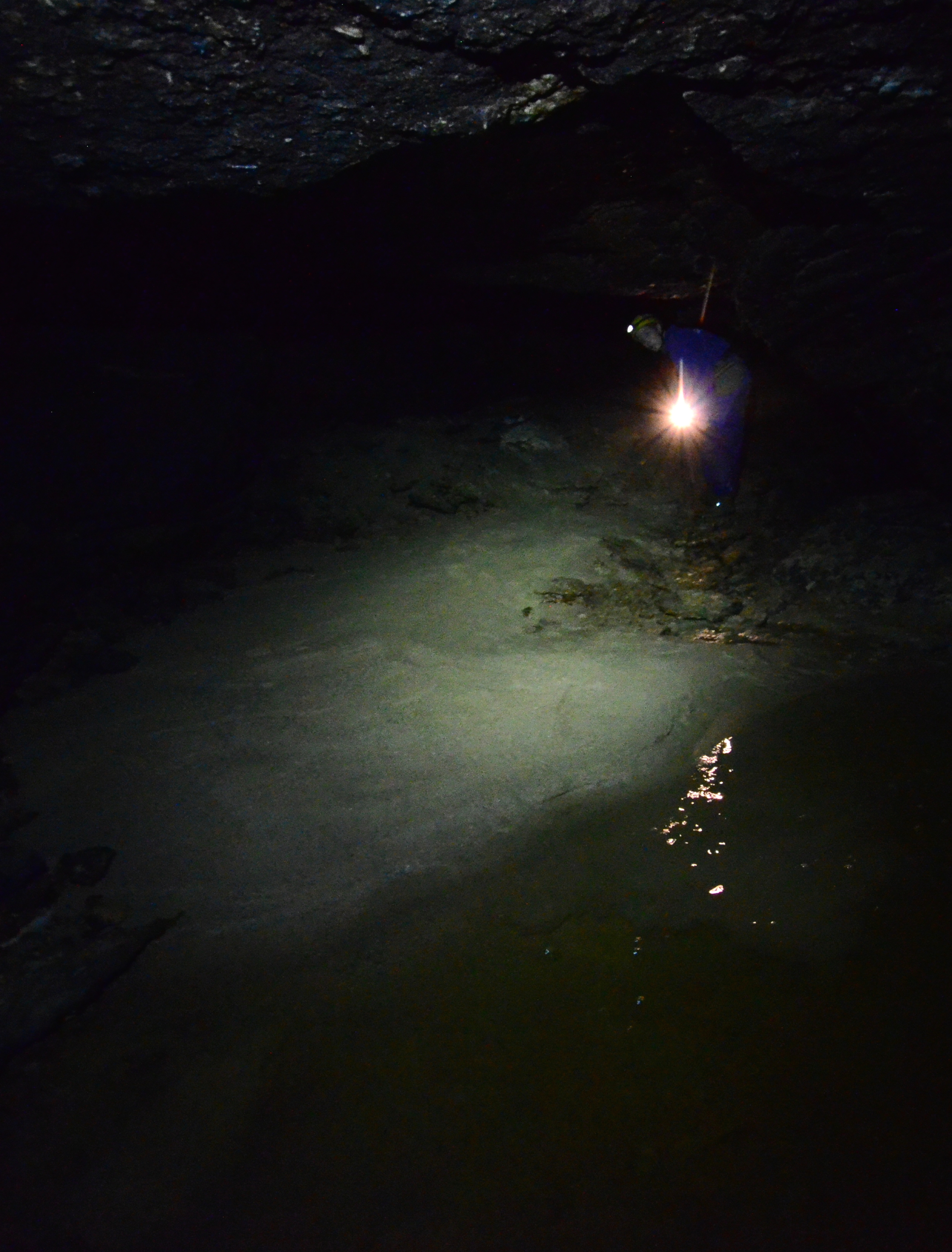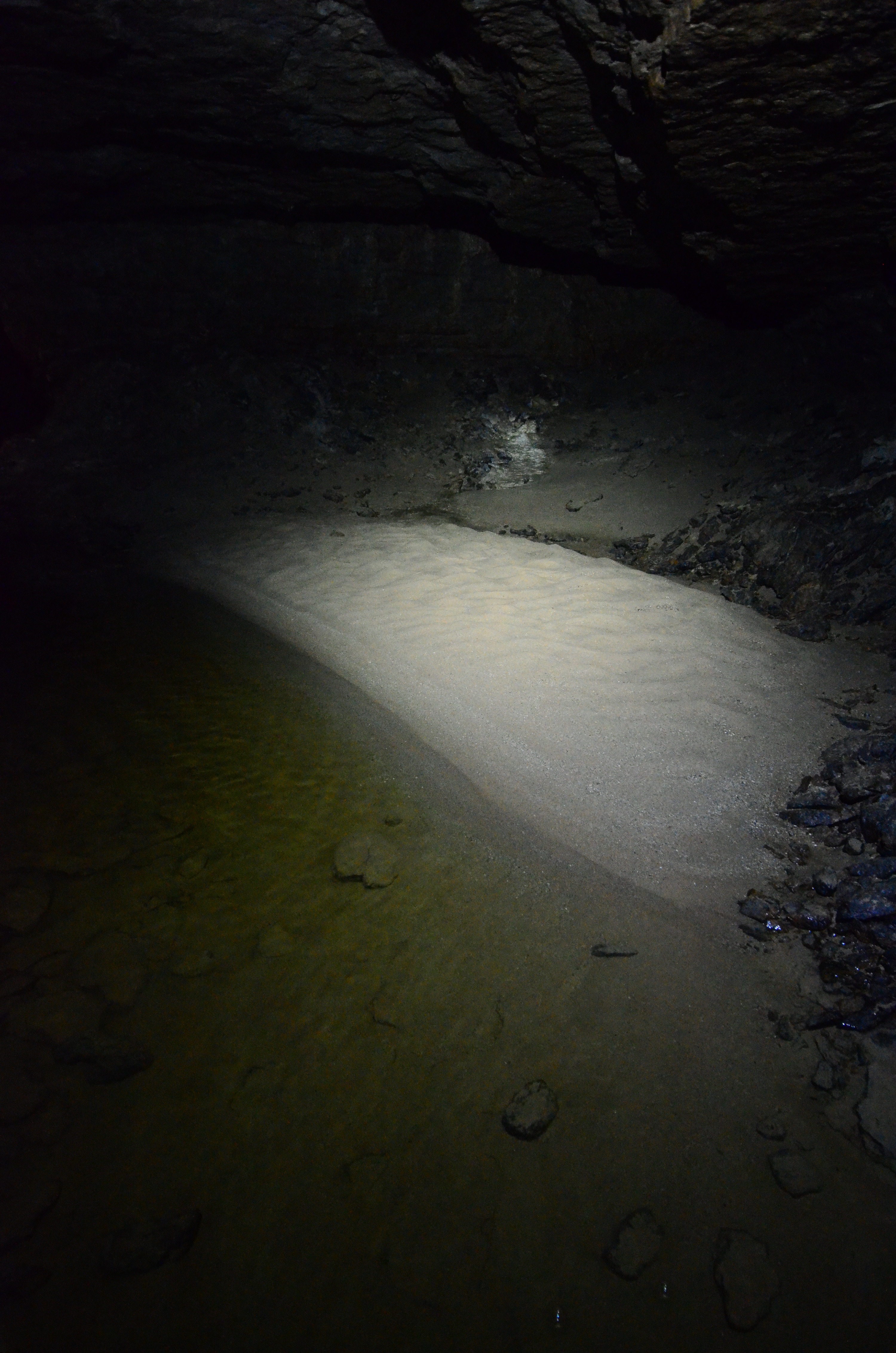 We used wade-fishing pants, high enough to reach our armpits. But they were not high enough to protect us completely from the water, as it was too deep in places. In a couple of points we had to either jump a few meters or swim. This would not have been such an issue, but doing that while carrying two cameras was a challenge for me. In some other points we held on to rocks on the tunnel walls to keep ourselves afloat. In another case we had to move on our bottoms along a small underwater ledge in the tunnel wall.