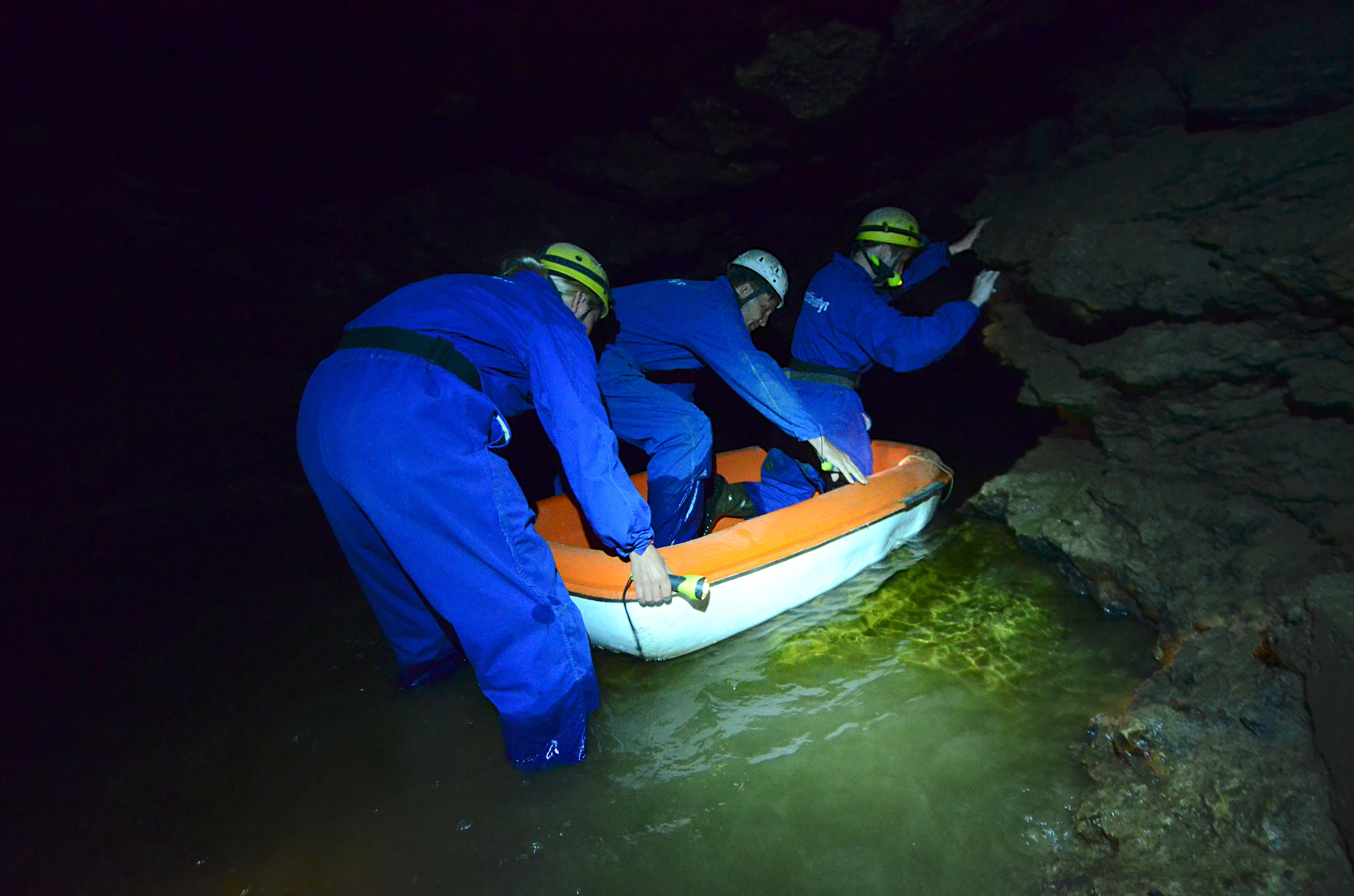 The route that we can take begins on small boats. They are easy to manoeuvre into the cave, as we can grab hold of rocks in the tunnel walls and pull ourselves forward. But then the going gets a bit tougher. The cave ceiling drops so low that we have to lean low - and lean to different directions to avoid capsizing the boat. Once we reach the end of the boat trip, we climb over rocks, and continue our journey on foot, wading through partially water-filled tunnels, climbing, and even crawling.