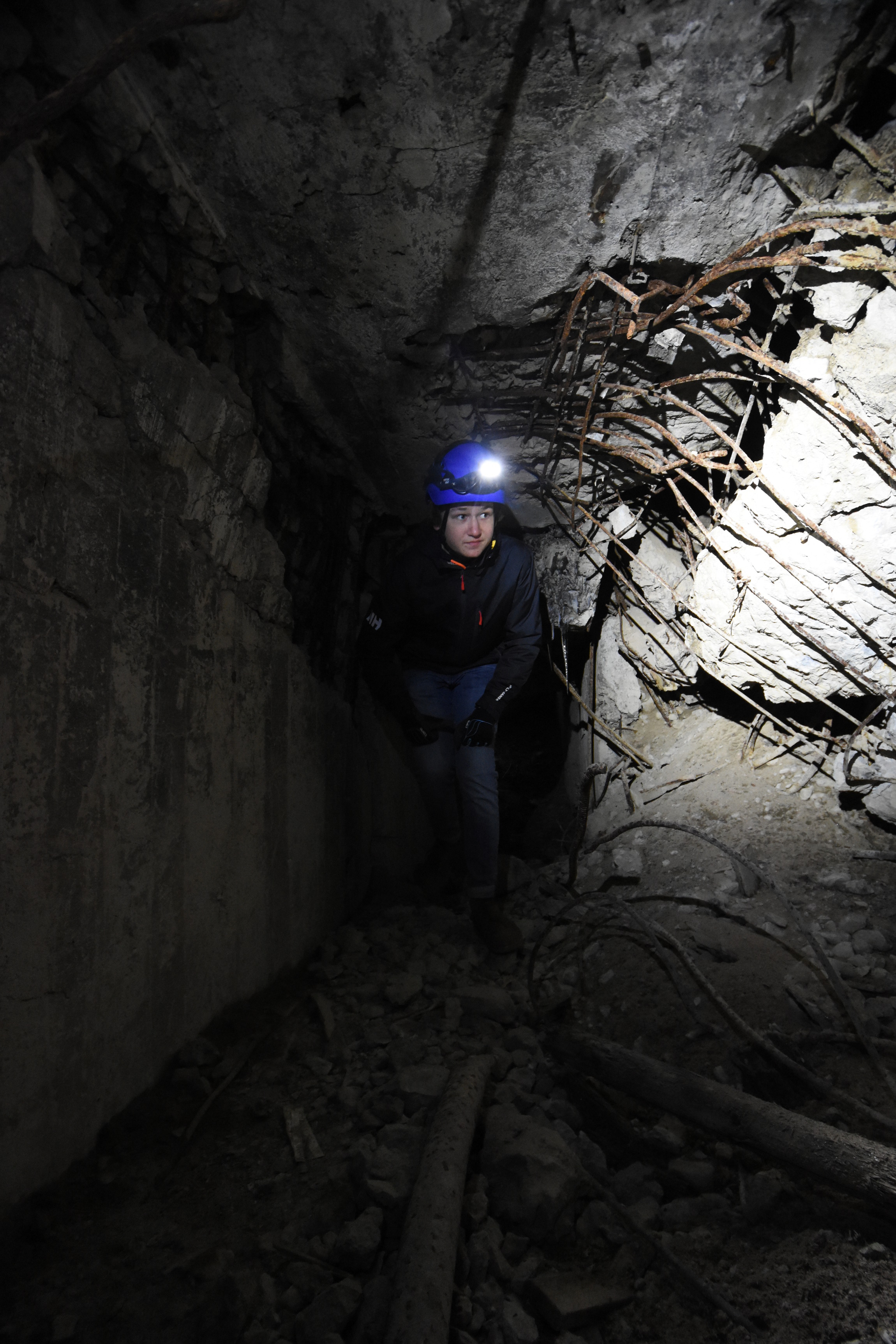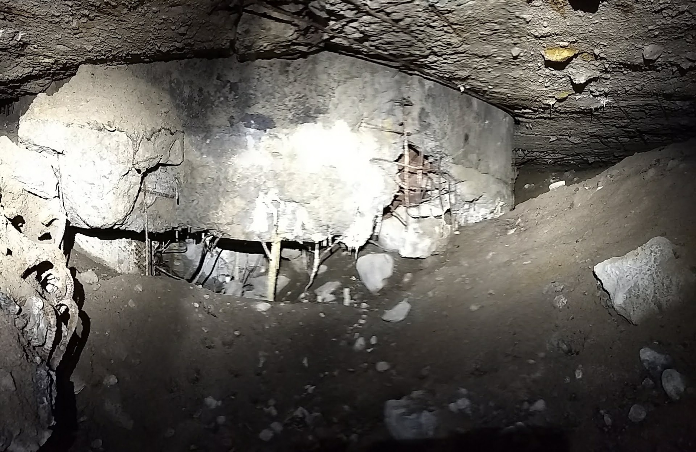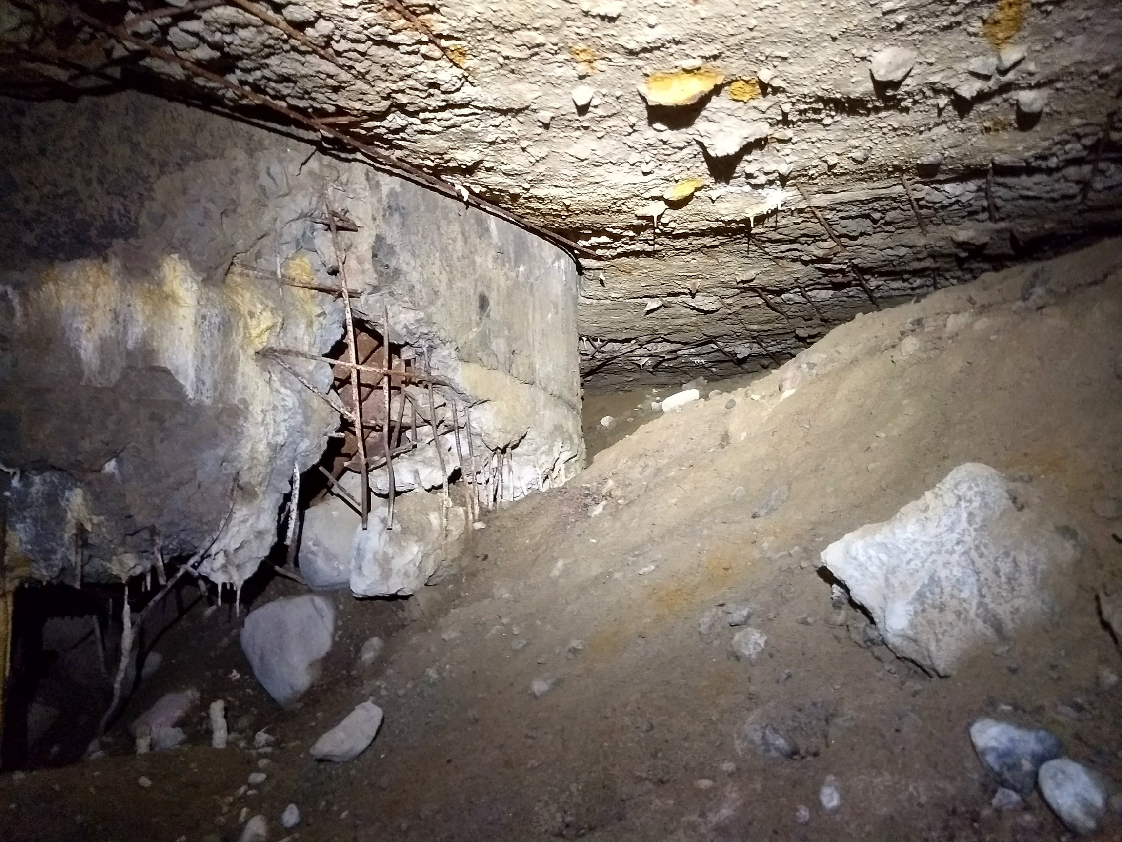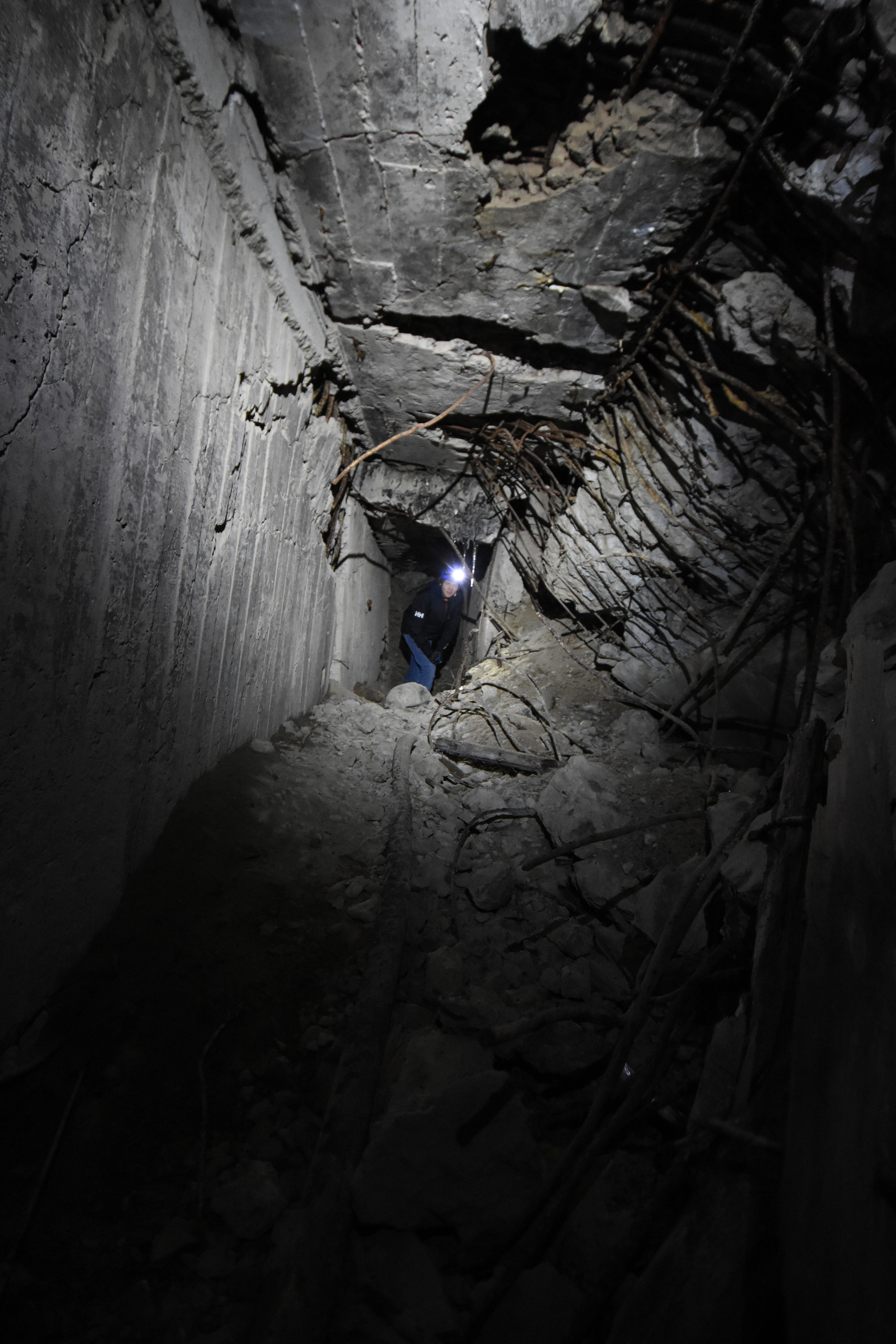 It is easy to go maybe 10 meters from the entrance tunnel, and you can peek towards the rest of the structure. But actually getting to the rest is the difficult part. There's nothing except a wall on the right side, the side where one would expect to find more rooms leading to the air shafts. On the left, towards the gun tower there's hanging floors/ceilings and twister rebar. I was able to sneak through an opening to take some of the pictures in this blog article, but it didn't feel particularly safe to go further.