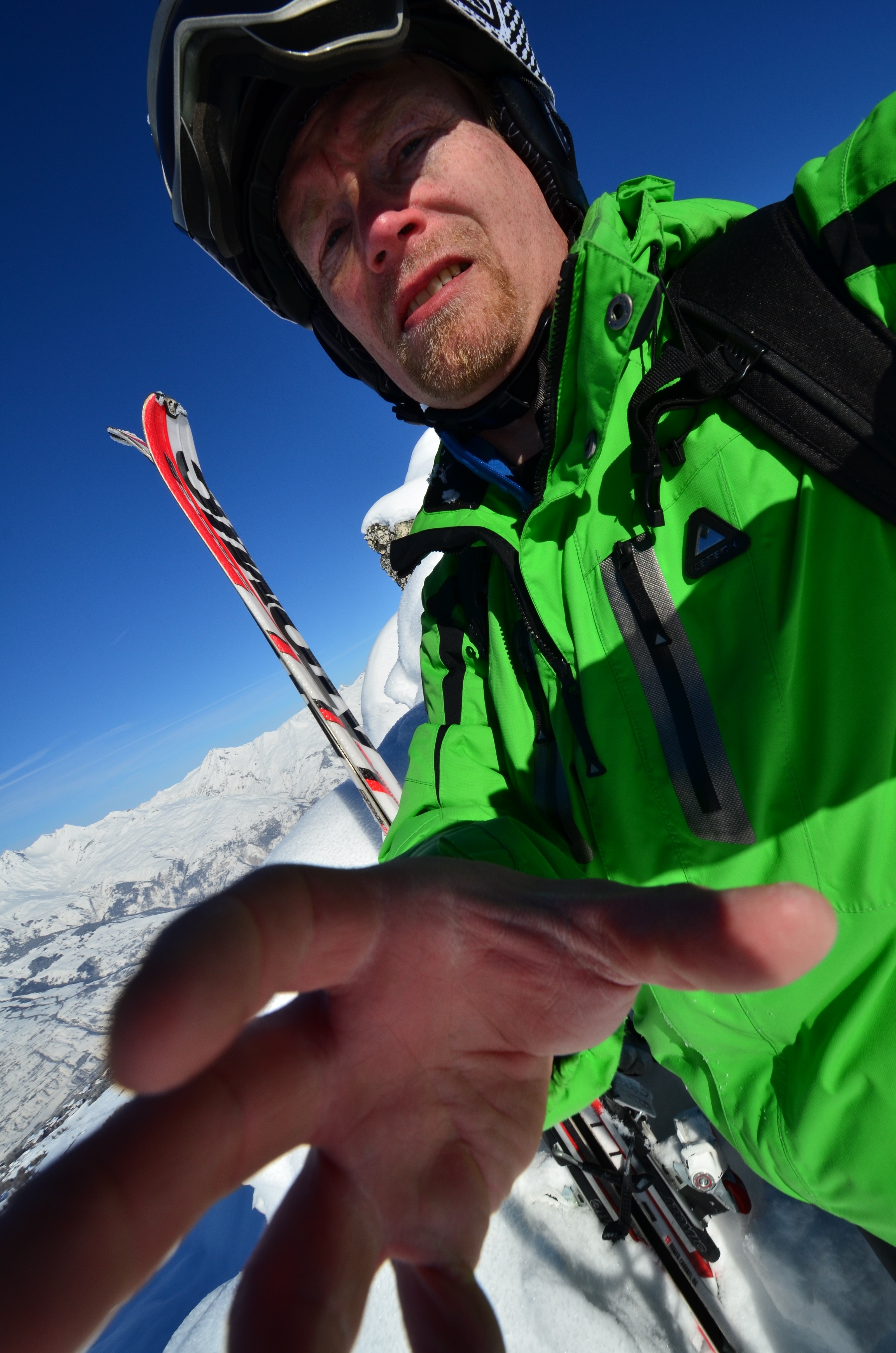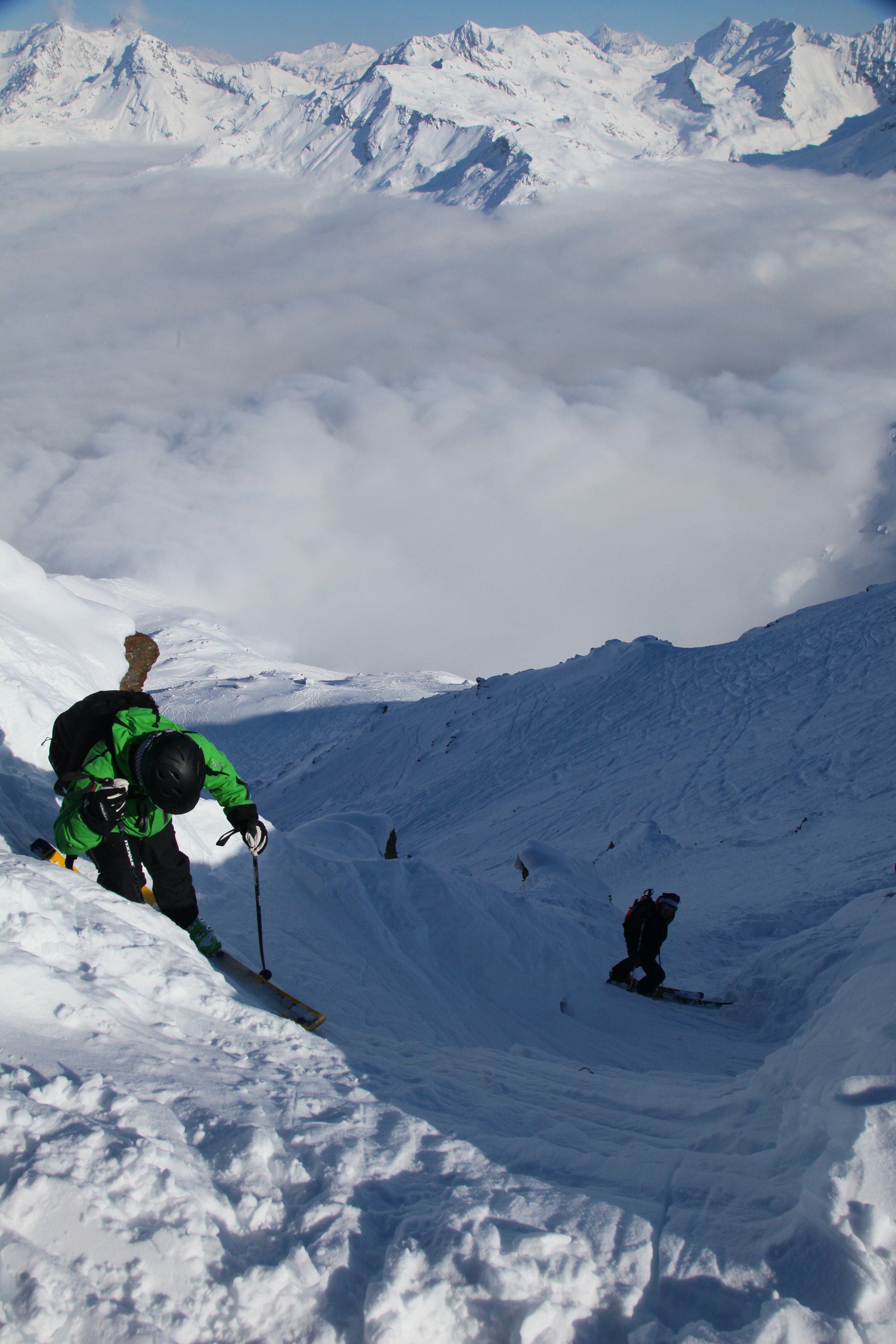 We are somewhere between the Les Grandes Pentes off-piste and the Le Couloir du Génépy (the one closed by ministerial decree since 1991). Our local friend drops in first, making everything look easy. Then again, he spends most of his time on these slopes when he is not flying helicopters to off-shore platforms. Maybe he is more used to this than we are. We follow and eventually make it to the slope without falling, and with only mild shaking.