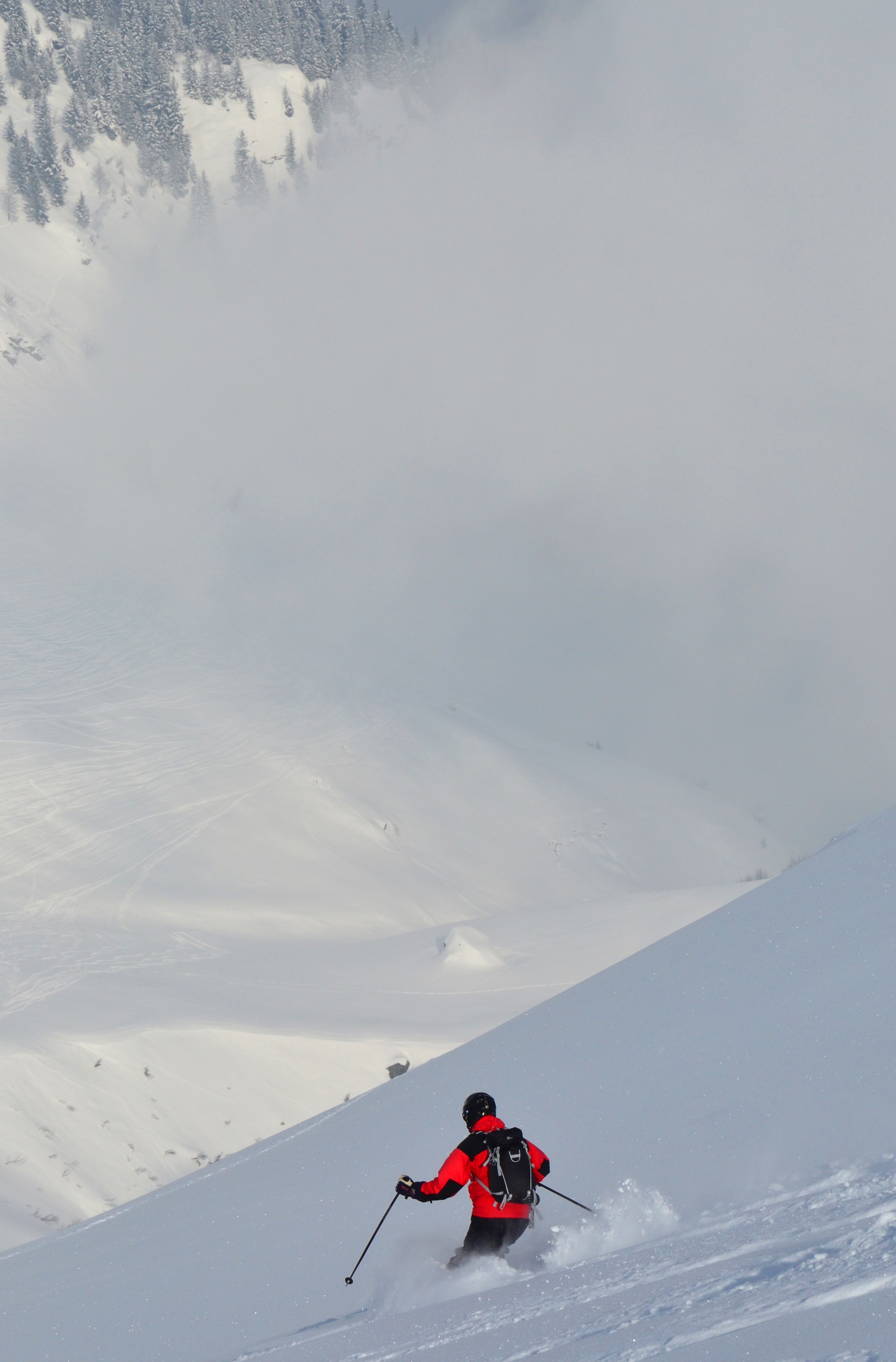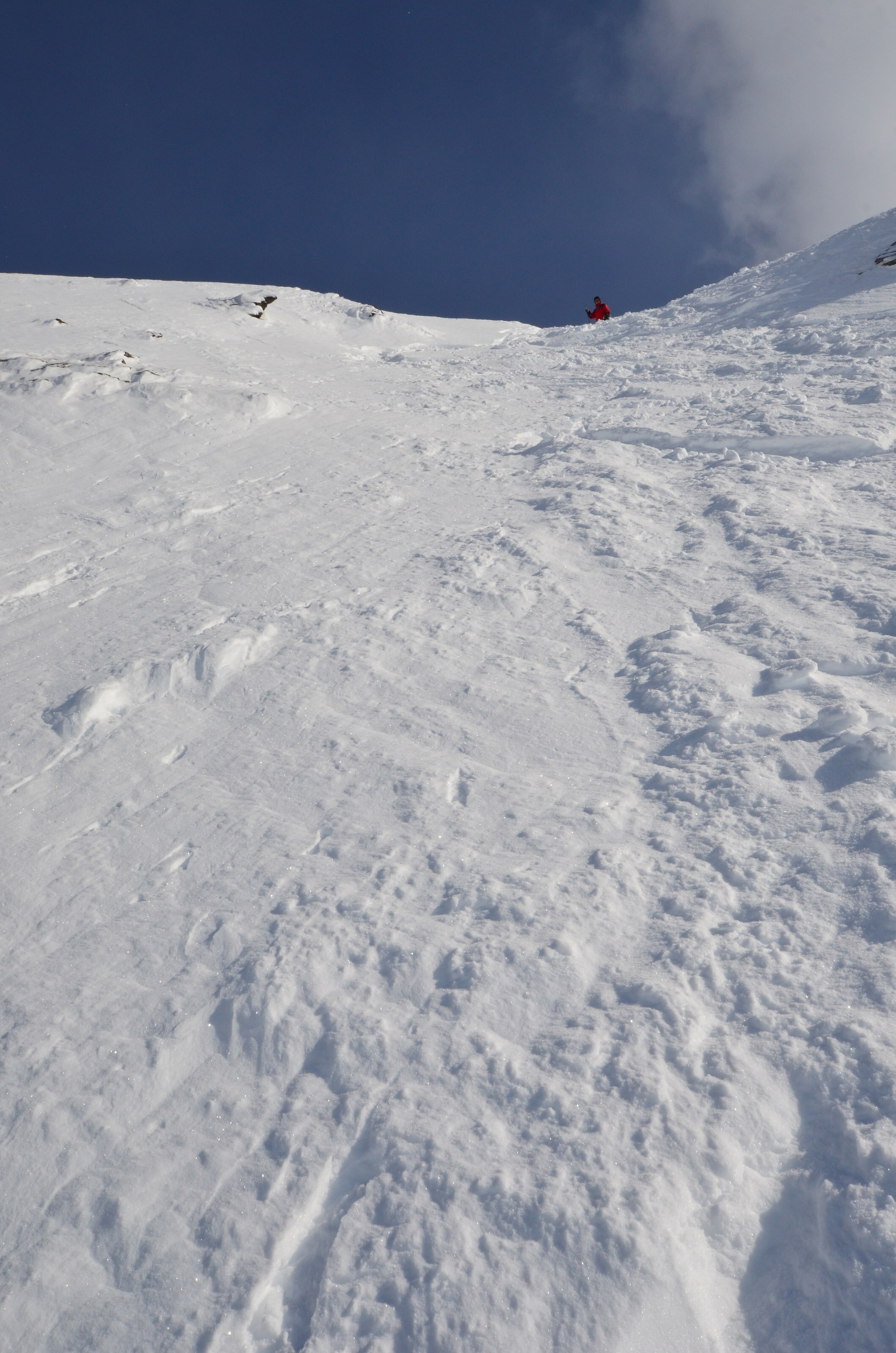 The run from the ridge is not very high, under 100 meters. But no one had skied it before, so the snow was fresh. And the slope is steep. So steep in fact that when I skied it, the uppermost layers fell away in a series of avalanches. Small ones, I could feel them but it was clear that I was not in trouble. (And I was close enough to rescue forces should they be needed in the case of a bigger avalanche.) I was more concerned about hitting rocks under the snow which might send me cartwheeling.