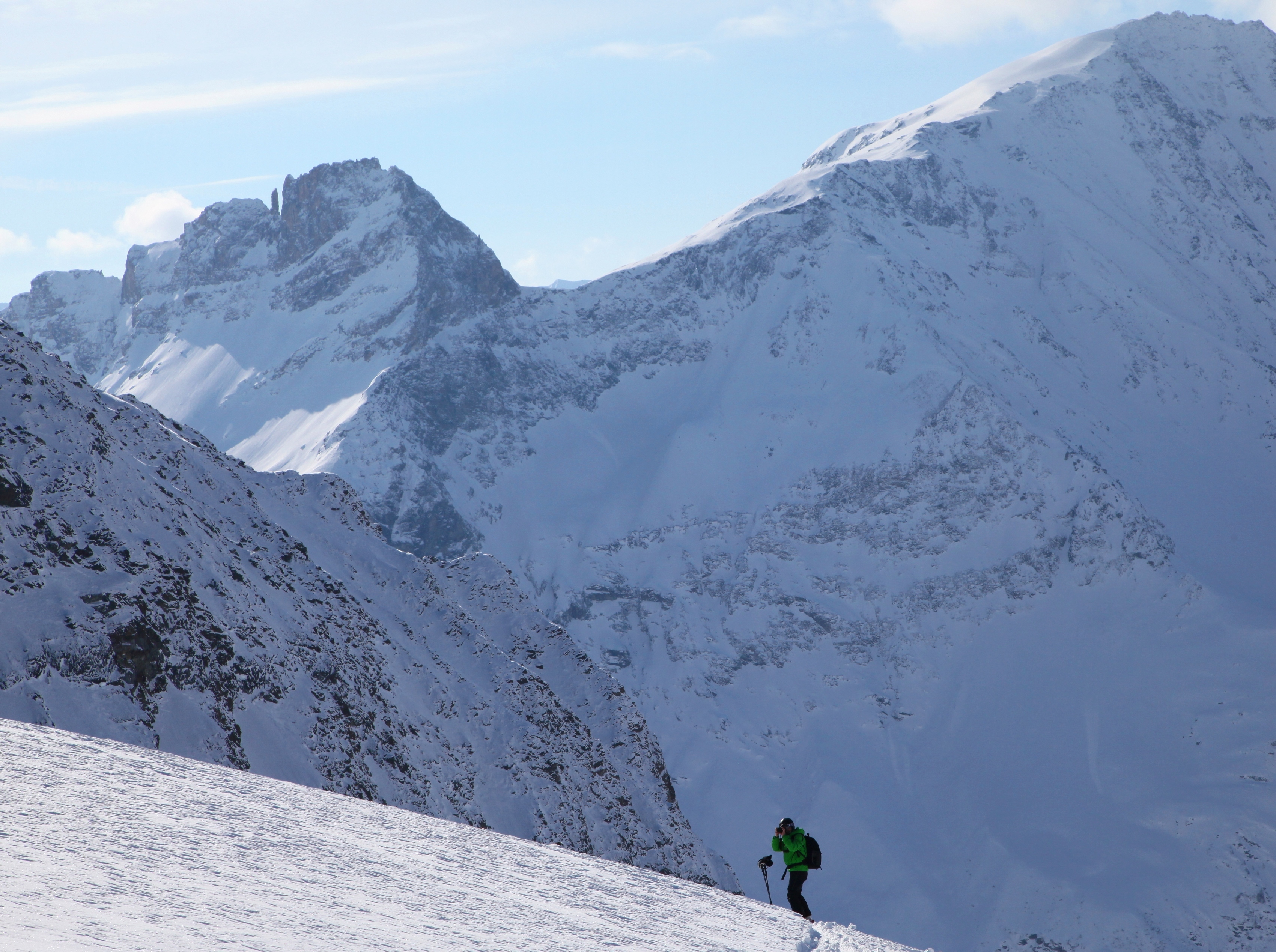 Another entrance to this same area took us from the top of the Grand Col lift to the col, an easy climb of 100 meters. Climbing a little bit higher we can take a steeper run to the right of the col. From here we enter the Itinéraire du Grand Col, a route that takes us further into the natural reserve than what can be reached from the top of Aiguille Rouge. There is a small hut at the top of the col, as well as a possibility to stop at the Refuge de Turia. As with all the backside routes from Aiguille Rouge, route finding is difficult. You are far into the wilderness area, there are rivers to cross and forbidden areas of the natural park to avoid, and there are obviously also mountain dangers. A guide is necessary.