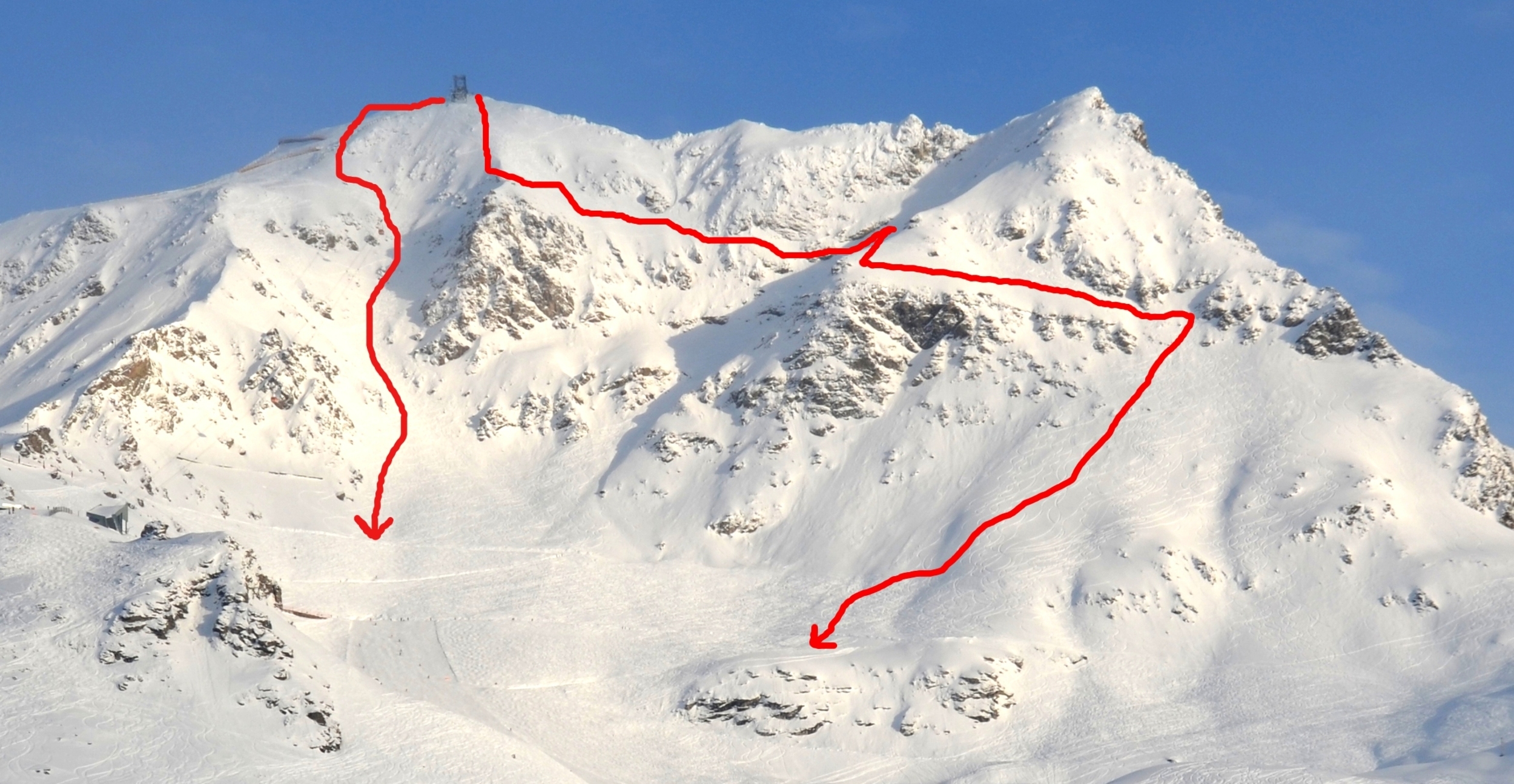 But the east side is not the only place on Aiguille Rouge for off-piste. The front of the mountain also offers interesting options. The most obvious route, the "Les Câbles", is straight down under the ski lift. We did not try this route, but it seems steep and interesting, though also quite quickly tracked out. The route is shown on the left on the picture below.