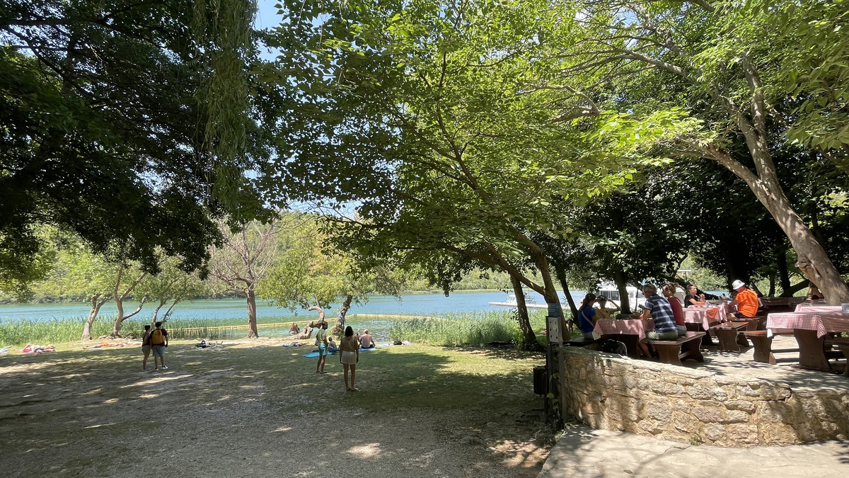 The beach in Roški Slap was nice, as discussed earlier. It is in coordinates N 43.902101 E 15.975836, next to the restaurants, near the information desk in the gorge, etc.