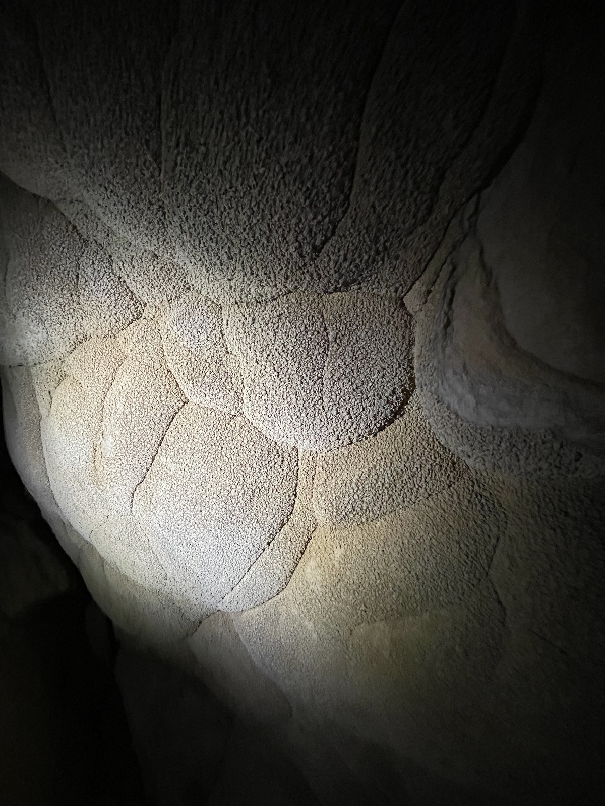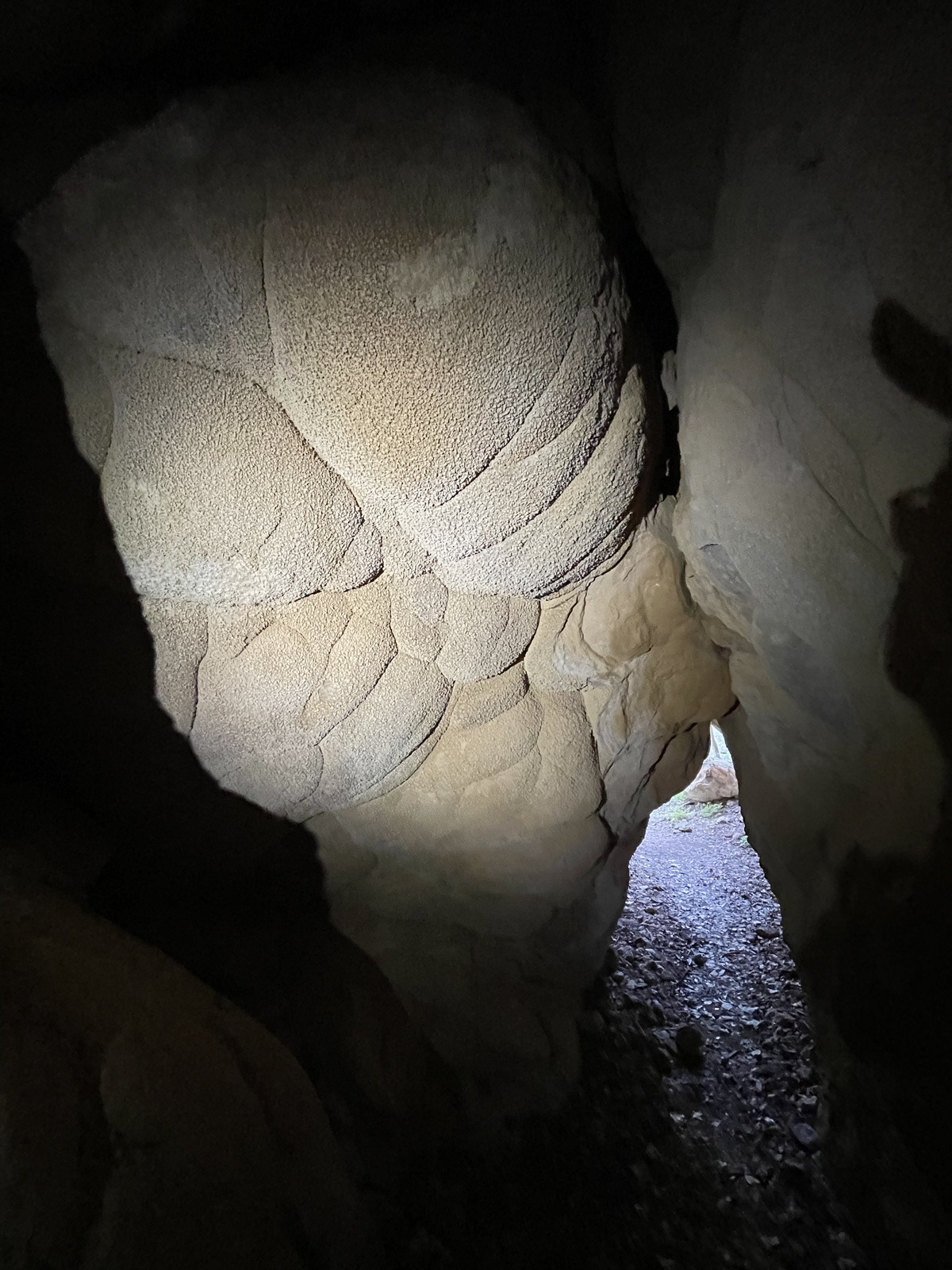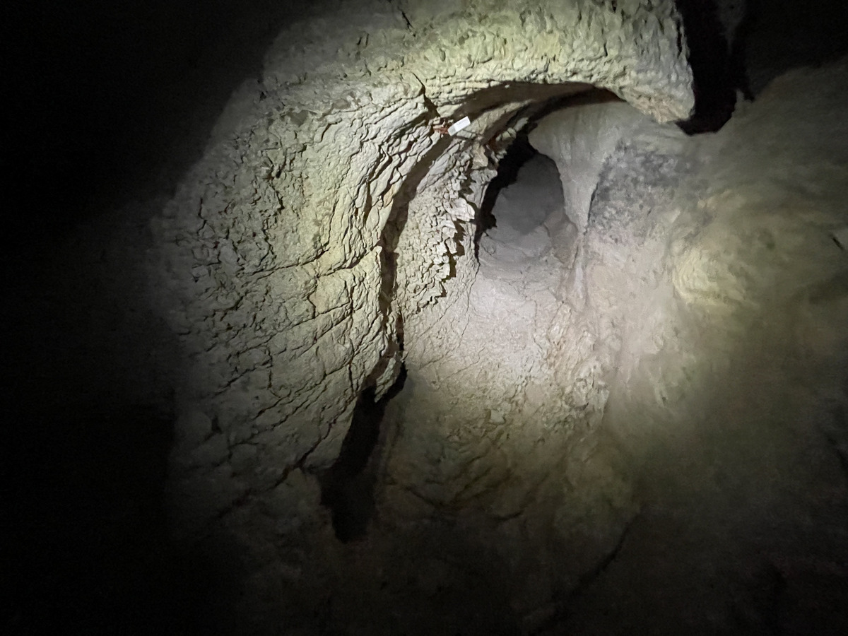 This cave forms an A-shape tunnel of about 14 meters, and has some weird ball-shaped wall forms inside.