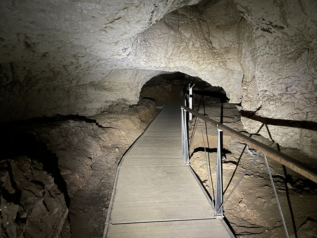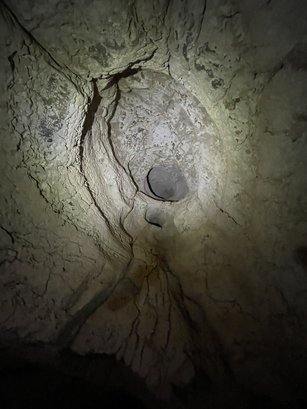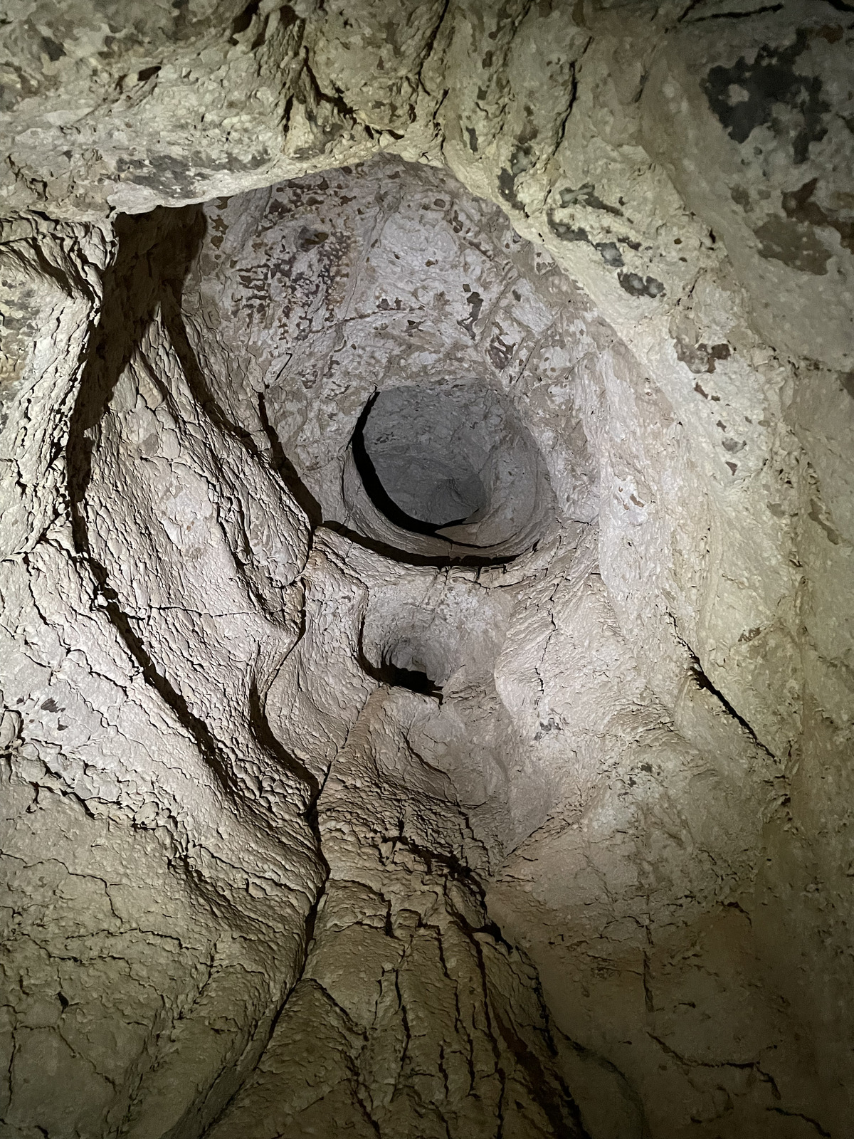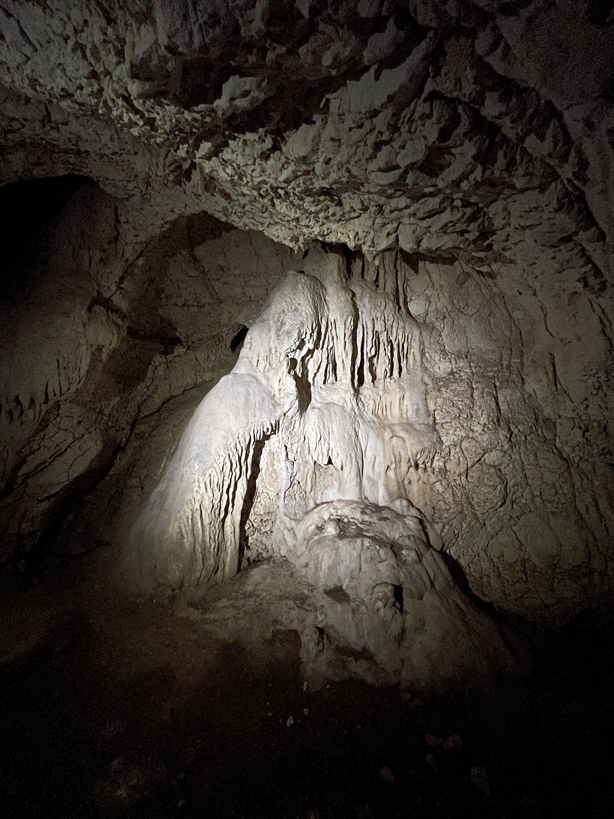 This cave forms an A-shape tunnel of about 14 meters, and has some weird ball-shaped wall forms inside.
