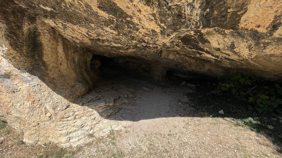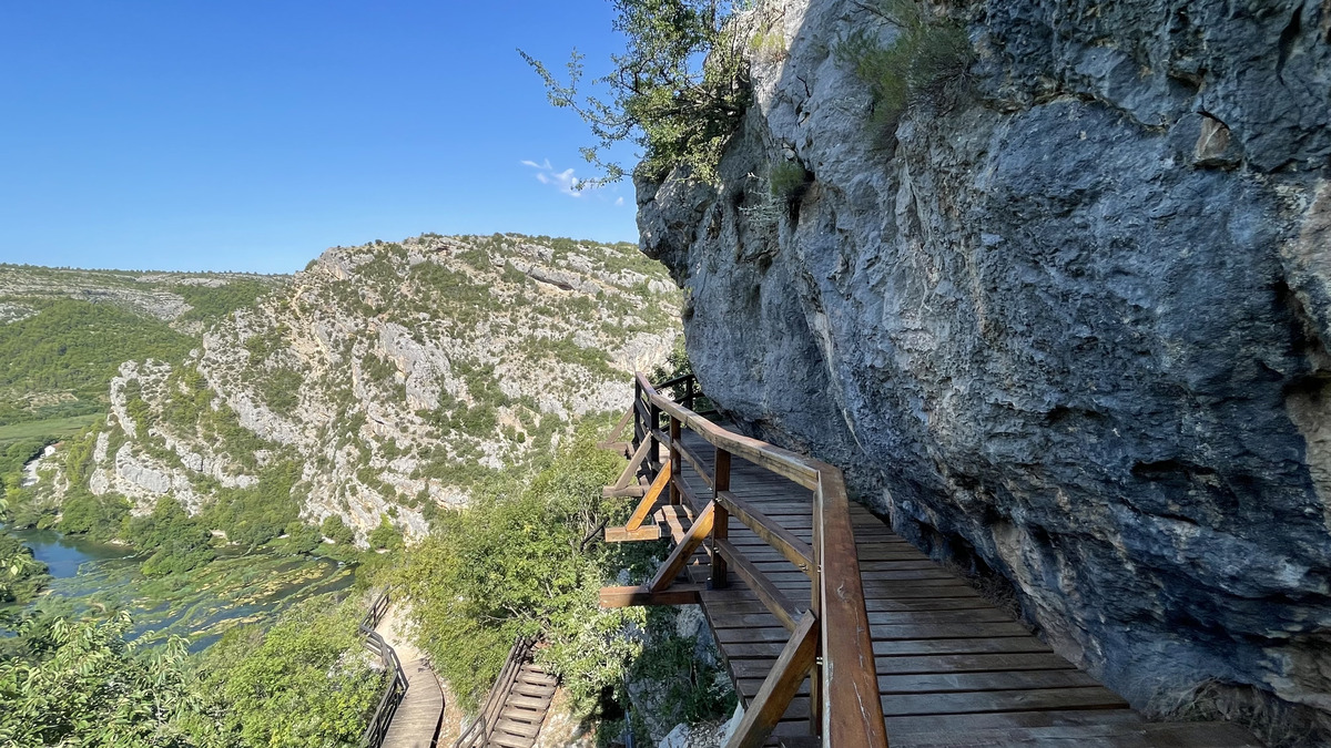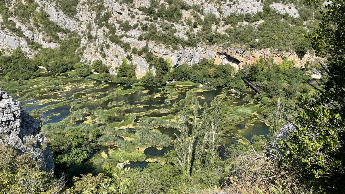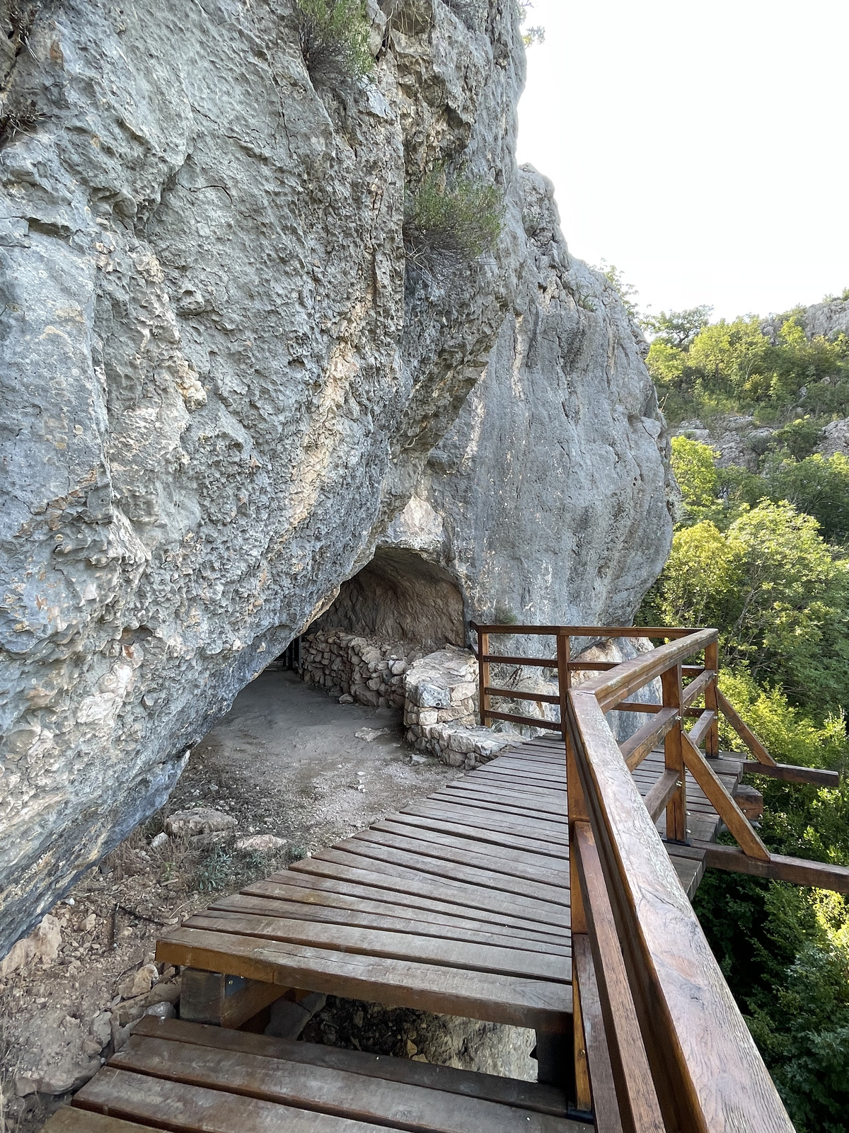 The Necklaces trail has a footbridge over the Krka river. On the west side of the river is the A-Frame cave and the path up to Bogatić Miljevački parking lot. On the east side of the river right in front of the footbridge is a cliff with a high-up shelter covering the lower parts of the cliff. On the left side of the shelter there's a smaller, proper shelter cave that is just a 1.5-3 meters high and maybe ten meters deep.