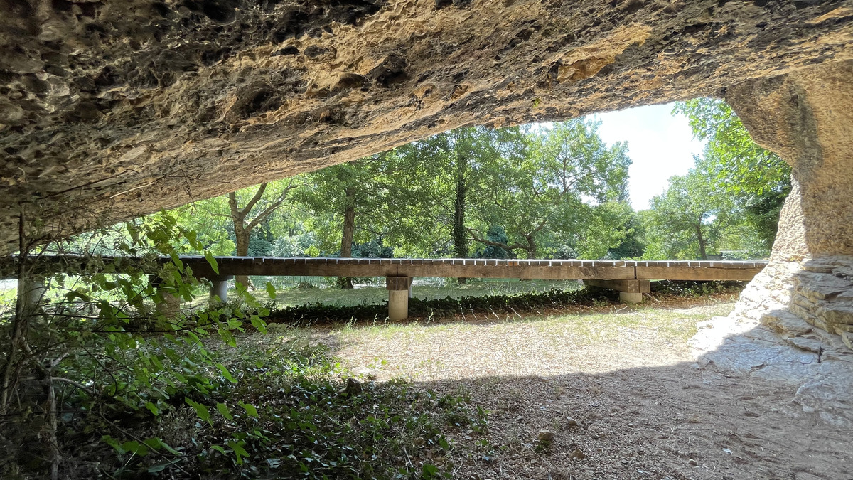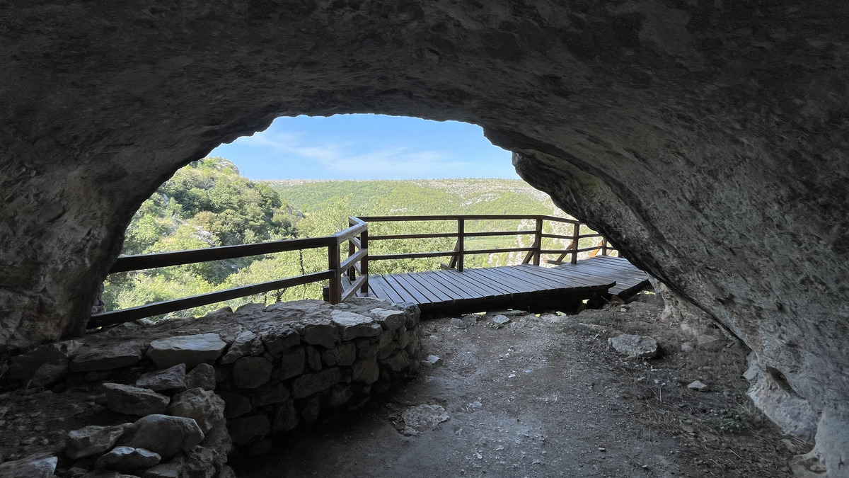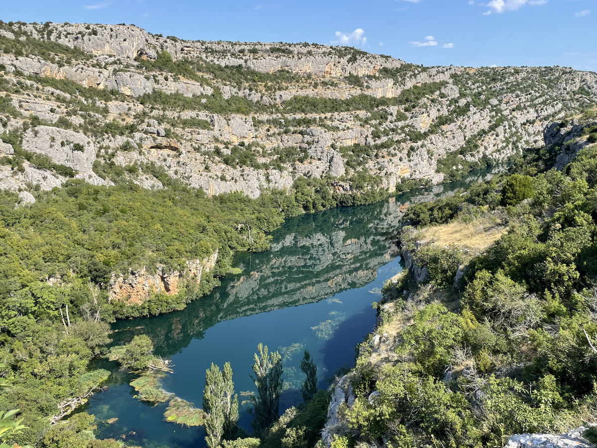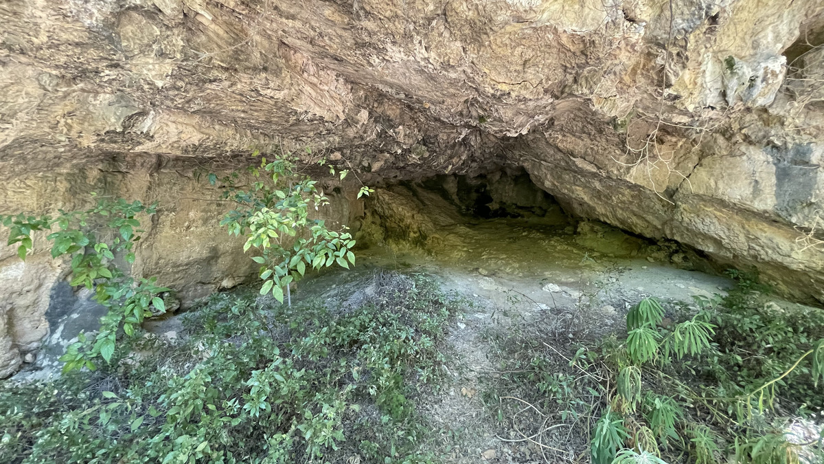 The Necklaces trail has a footbridge over the Krka river. On the west side of the river is the A-Frame cave and the path up to Bogatić Miljevački parking lot. On the east side of the river right in front of the footbridge is a cliff with a high-up shelter covering the lower parts of the cliff. On the left side of the shelter there's a smaller, proper shelter cave that is just a 1.5-3 meters high and maybe ten meters deep.