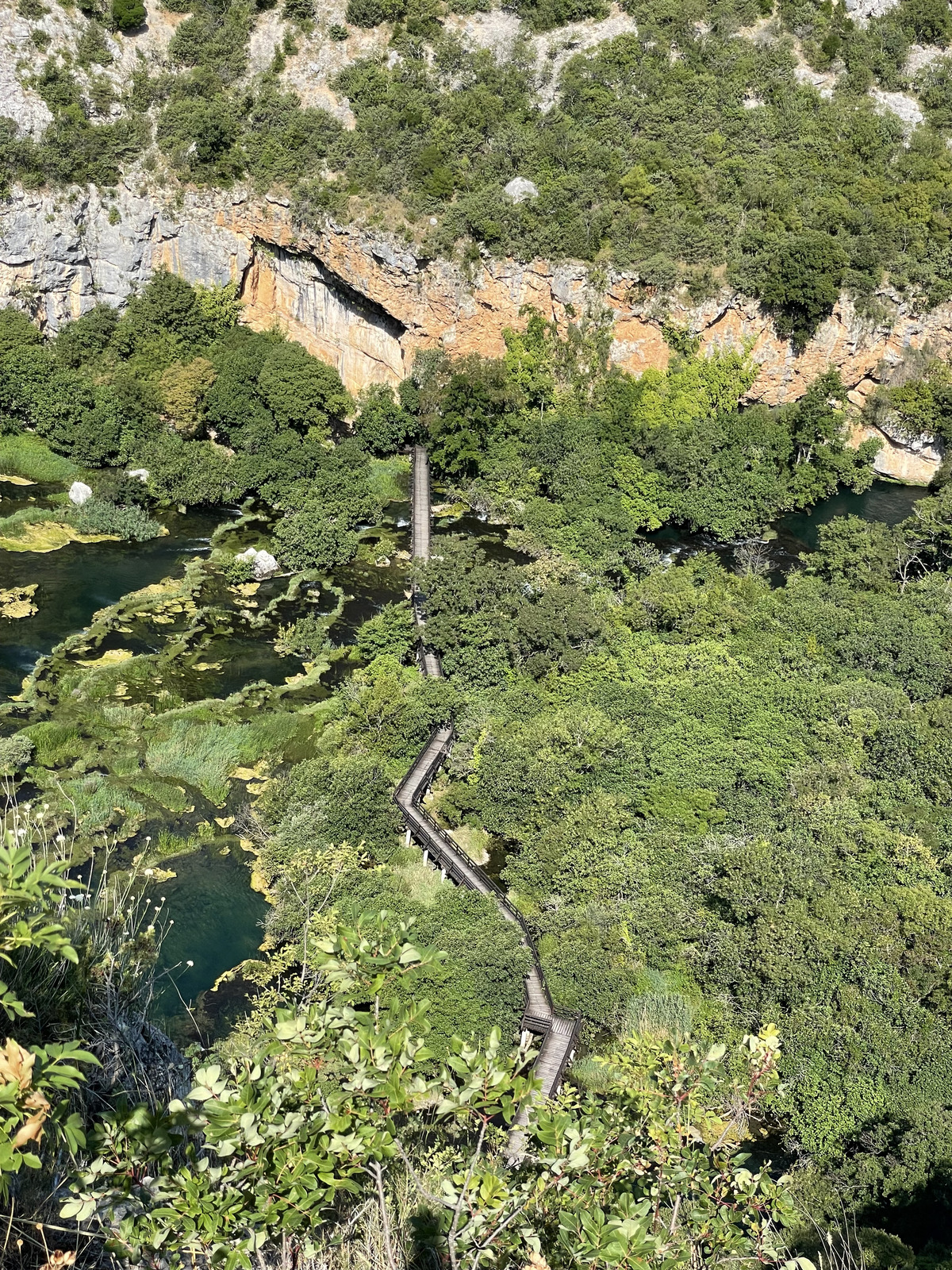 You need to buy timed tickets to visit the Krka National Park. You can get them here. More information from the park from their webpage or Wikipedia. I accessed Ozidana Pecina and the areas further down in the gorge from the upper parking lot at Bogatić Miljevački, here. It is an easy drive and Ozidana is near. The parking lots in the gorge itself near the Roški Slap waterfall are tiny and not recommended during the summer. And if you walk down to the gorge from the upper parking lot it is an easy walk, but in the heat of the summer walking up can be a challenge; I took the bus up. The bus runs every hour.