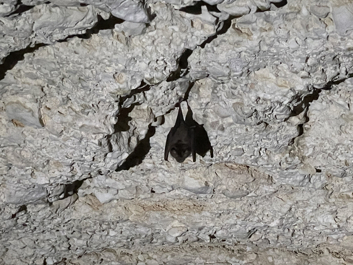 Let's focus first on Ozidana Pecina, the curated show cave in the park. This cave is well researched and documented. It is 59 meters long, a metro-sized tunnel straight into the rock in the middle of the cliff face of the gorge. It makes one turn within the tunnel, but is otherwise relatively straight. There are, however, several chimney features rising from the roof towards higher. But none of these chimneys appear to push through to the top of the cliff, or allow any kind of exit. How were they created? Perhaps there's some smaller water passages that allowed these to form.
