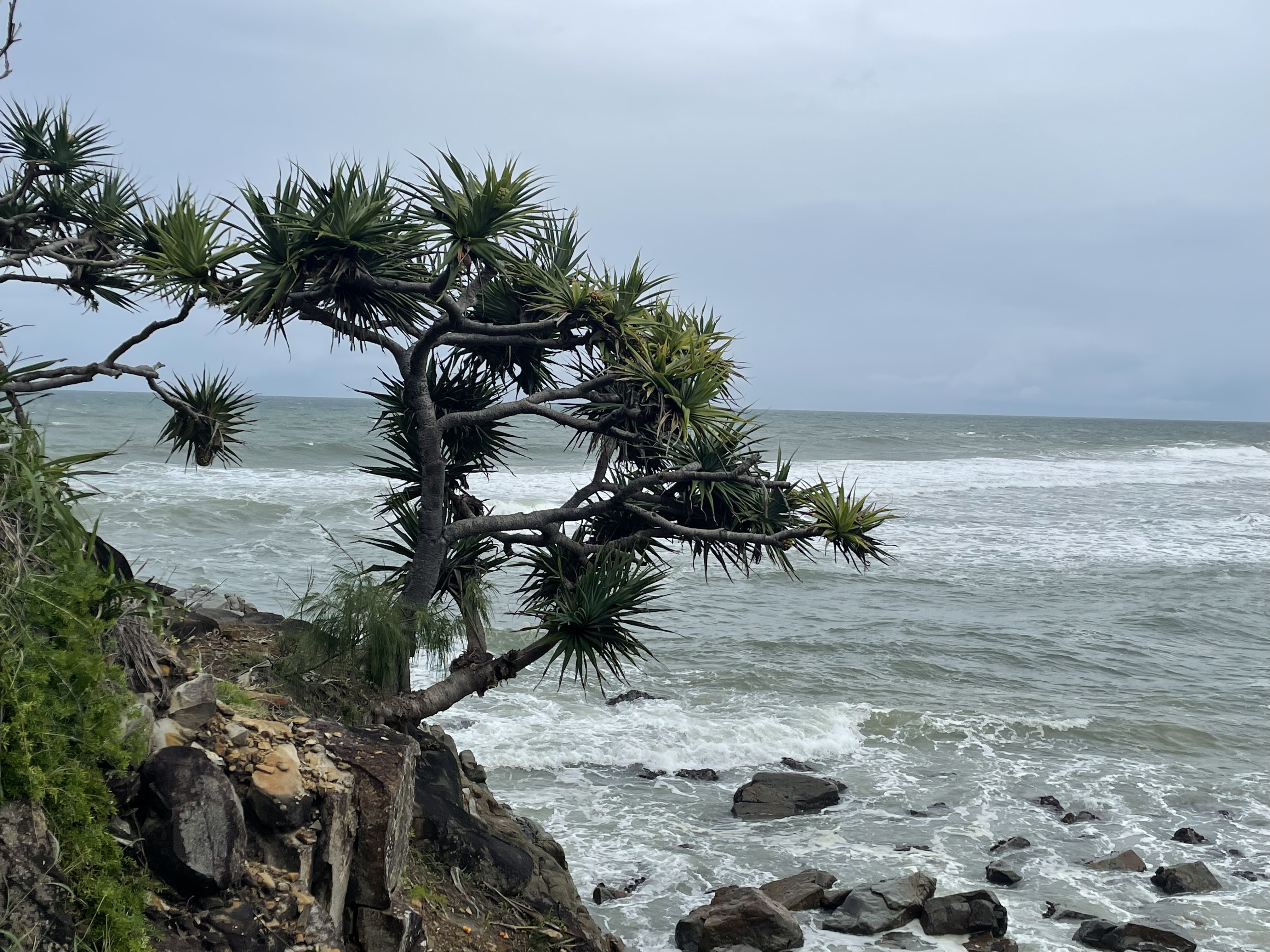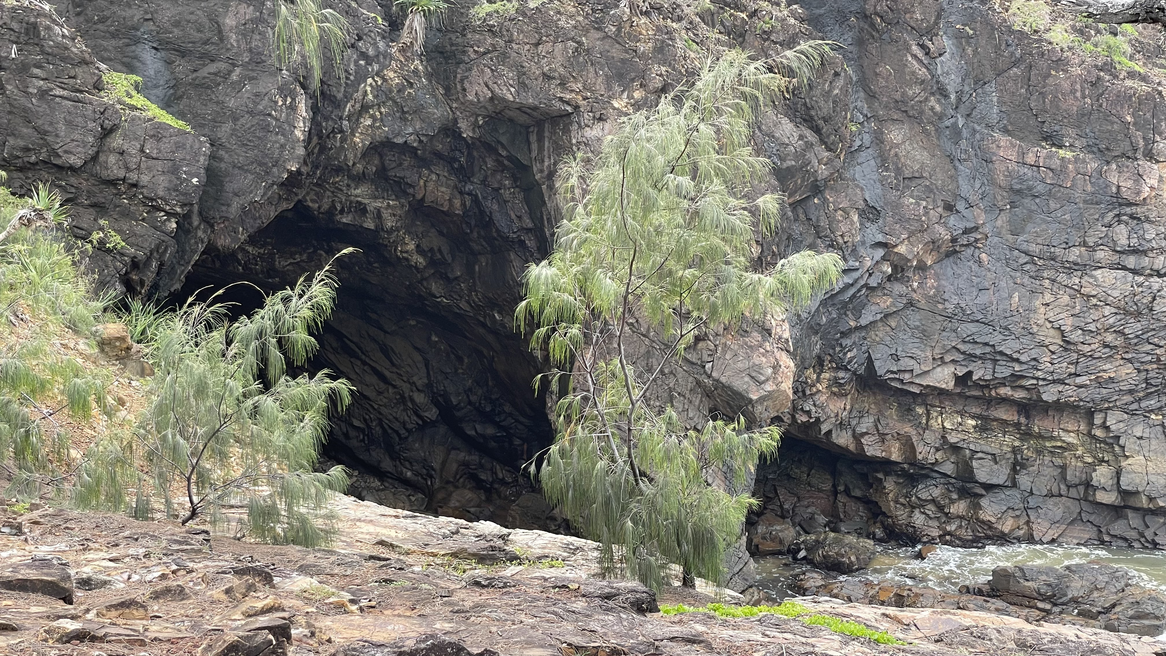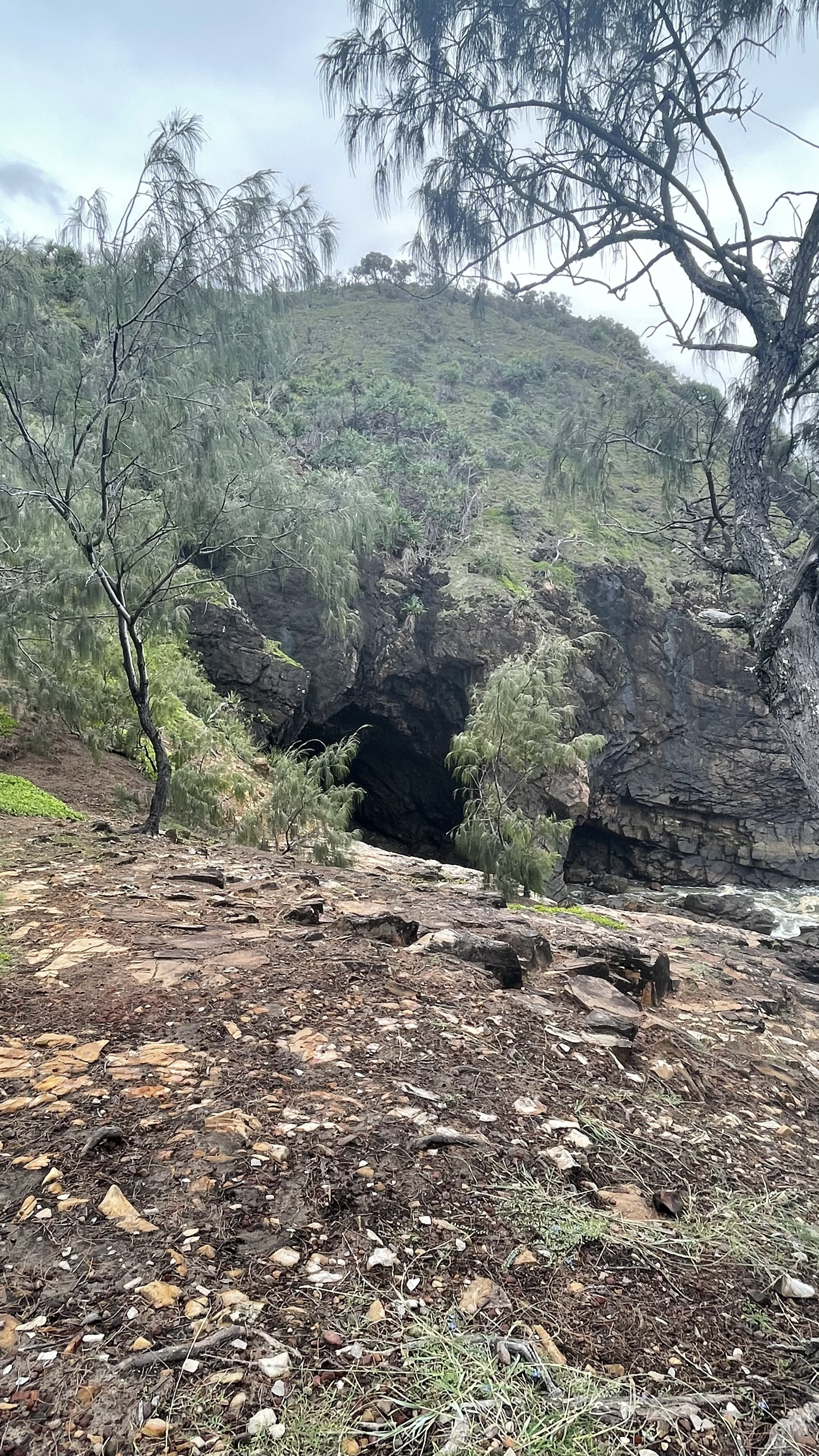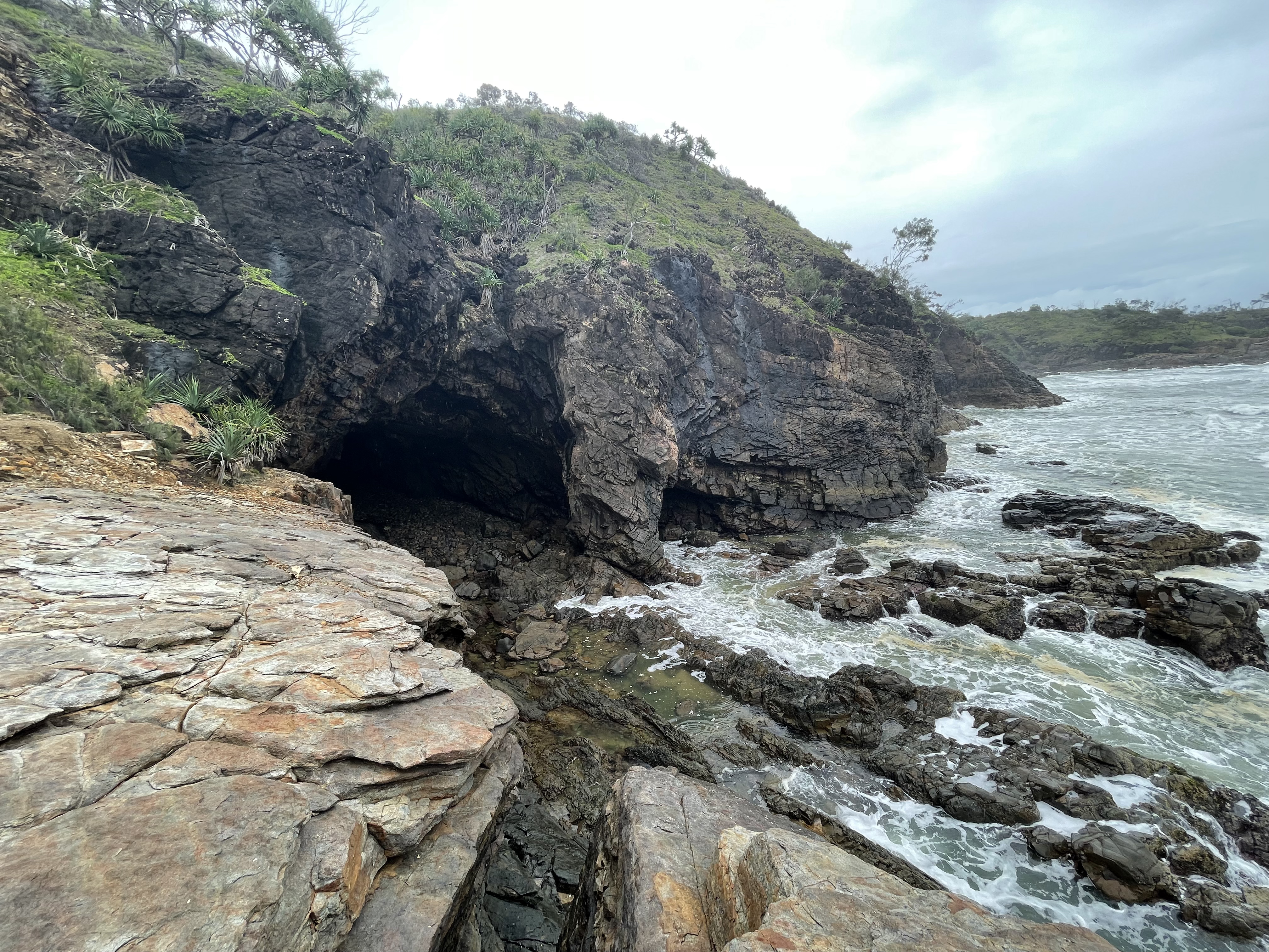 The cave coordinates are S 26.394911 E 153.116547. The beach is here. Or technically, that's the dogs-unleashed-area, and maybe a dog beach... but you can also swim here :-) The human beach proper is more towards the south. From south you can also find parking, here.