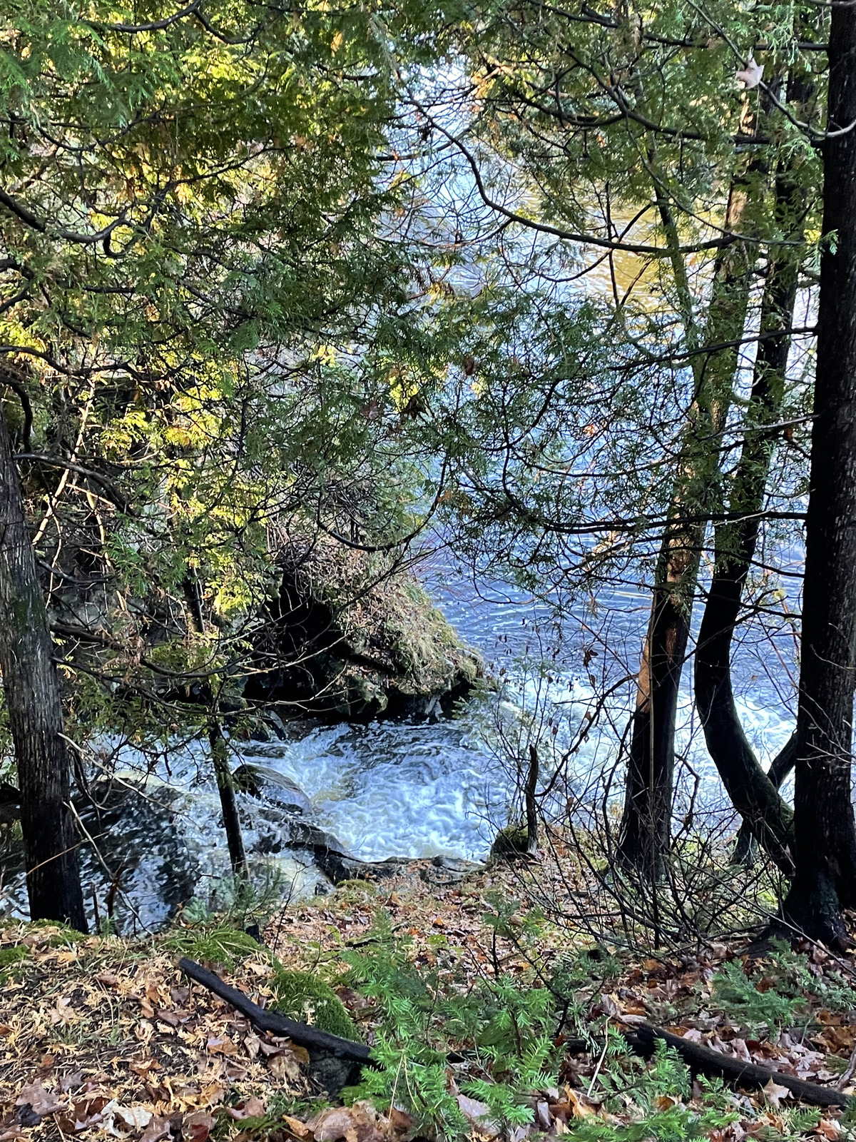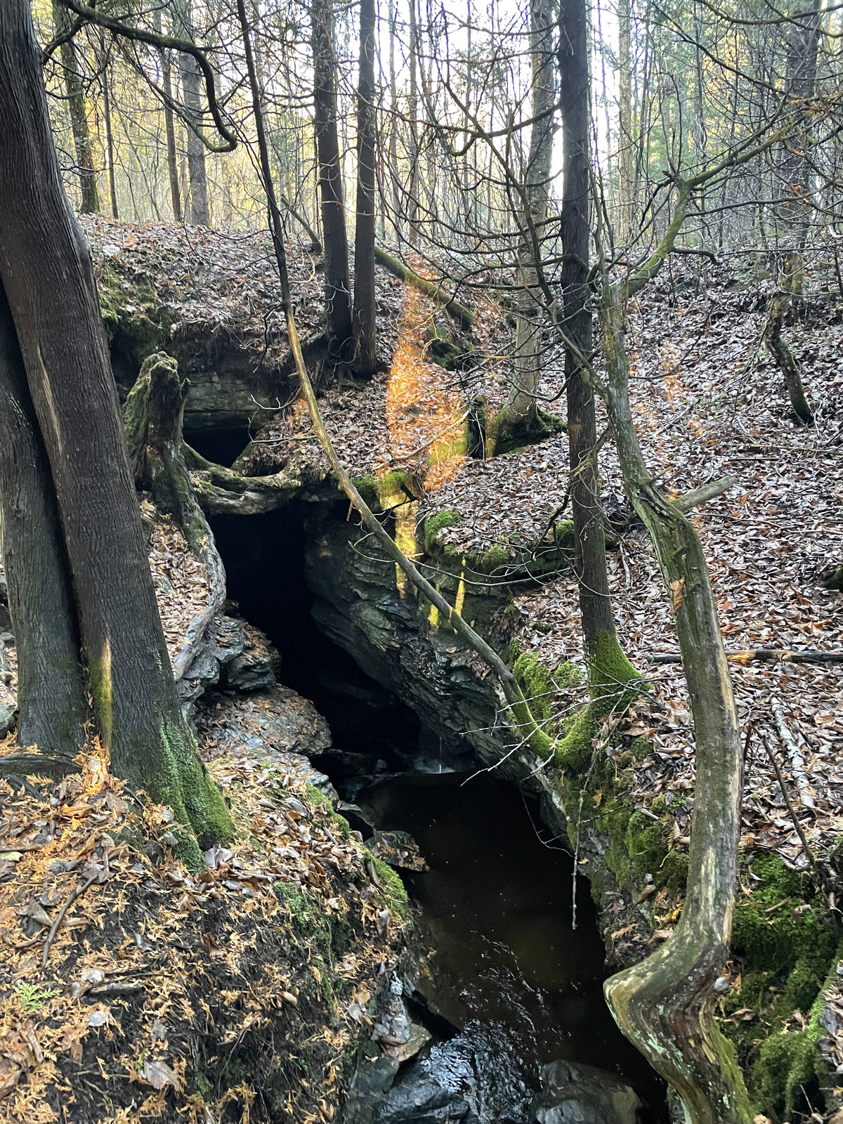 The other cave, Grotte aux Cascatelles, was hard to find. All the coordinates in Grotto Center and Wikipedia appeared to be incorrect, pointing to a swampy plains above and north of Sainte-Anne. I criss-crossed this area for an hour but did not see anything. And I didn't think there couldn't even be anything given the flat and and muddy landscape. But there's a cave that matches roughly what the cave map in Wikipedia shows, with two holes and a stream entrance from the top, and exit at the bottom of a cliff. The right coordinates are, I think, N 46.709885 W 72.079825.