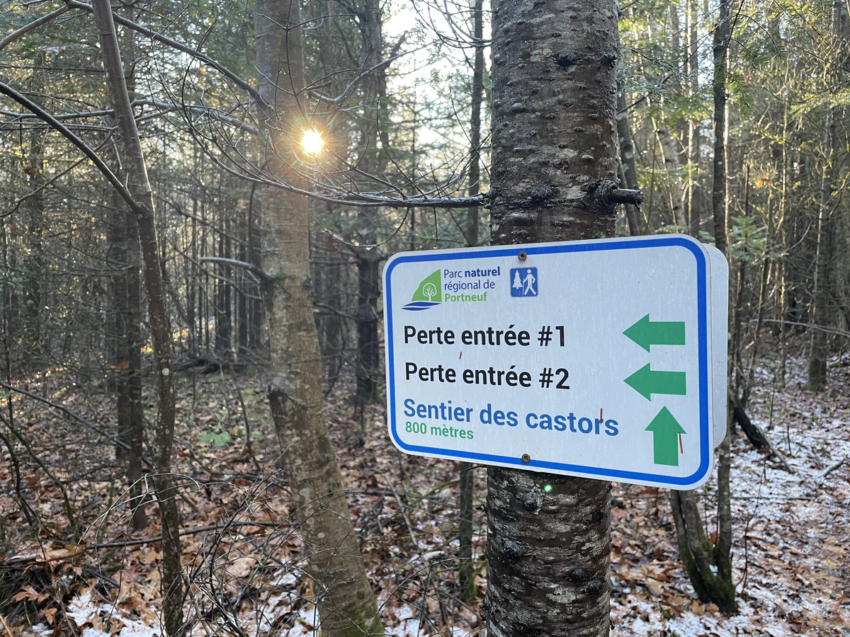 The Grotte le Trou du Diable has (at least) three openings, in coordinates N 46.677038 W 72.094314, N 46.675057 W 72.091979 and N 46.674699 W 72.091523. The first one is accessible by climbing down the steep river walls of a small contributory to Sainte-Anne, the one coming from the cave. The other two are accessible through the society's grounds. The society's hut is here, subject to opening hours etc.