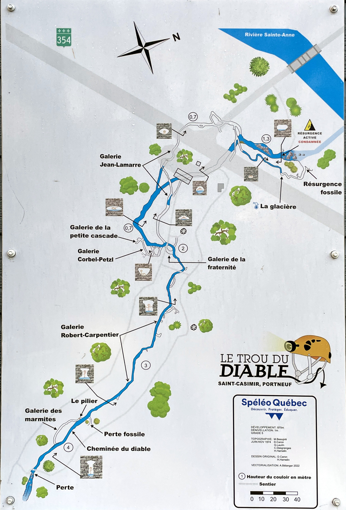 More information about Grotte du Diable can be found on the QC Speleo site and Portneuf Tourism site, and from Grotte Aux Cascatelles at the Grotto Center, a map from Wikipedia is here.