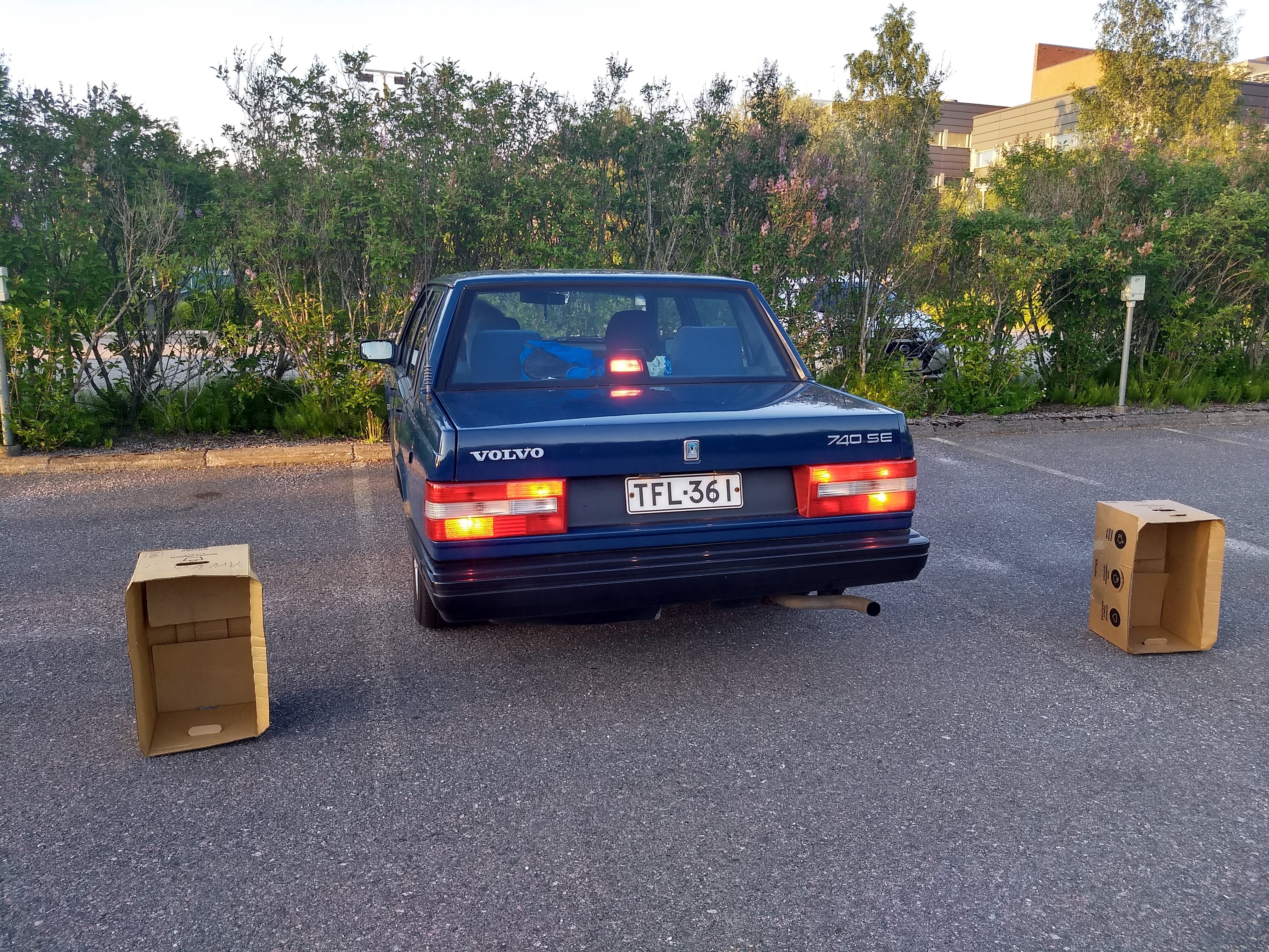 Parking practice between tightly parked cardboard boxes. Front, back, parallel. Oh and the Volvo has been running nicely for ALMOST THREE DAYS by now.