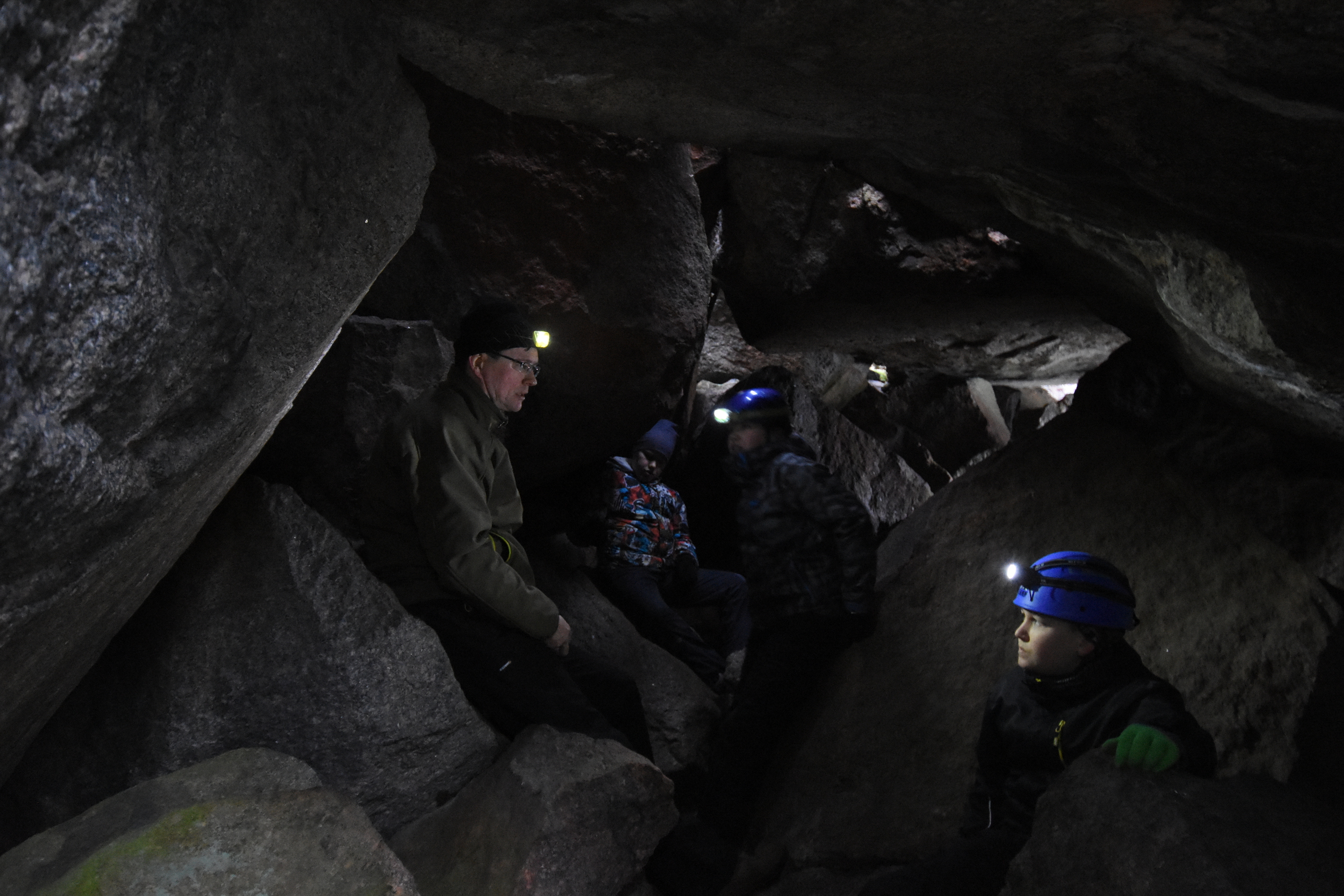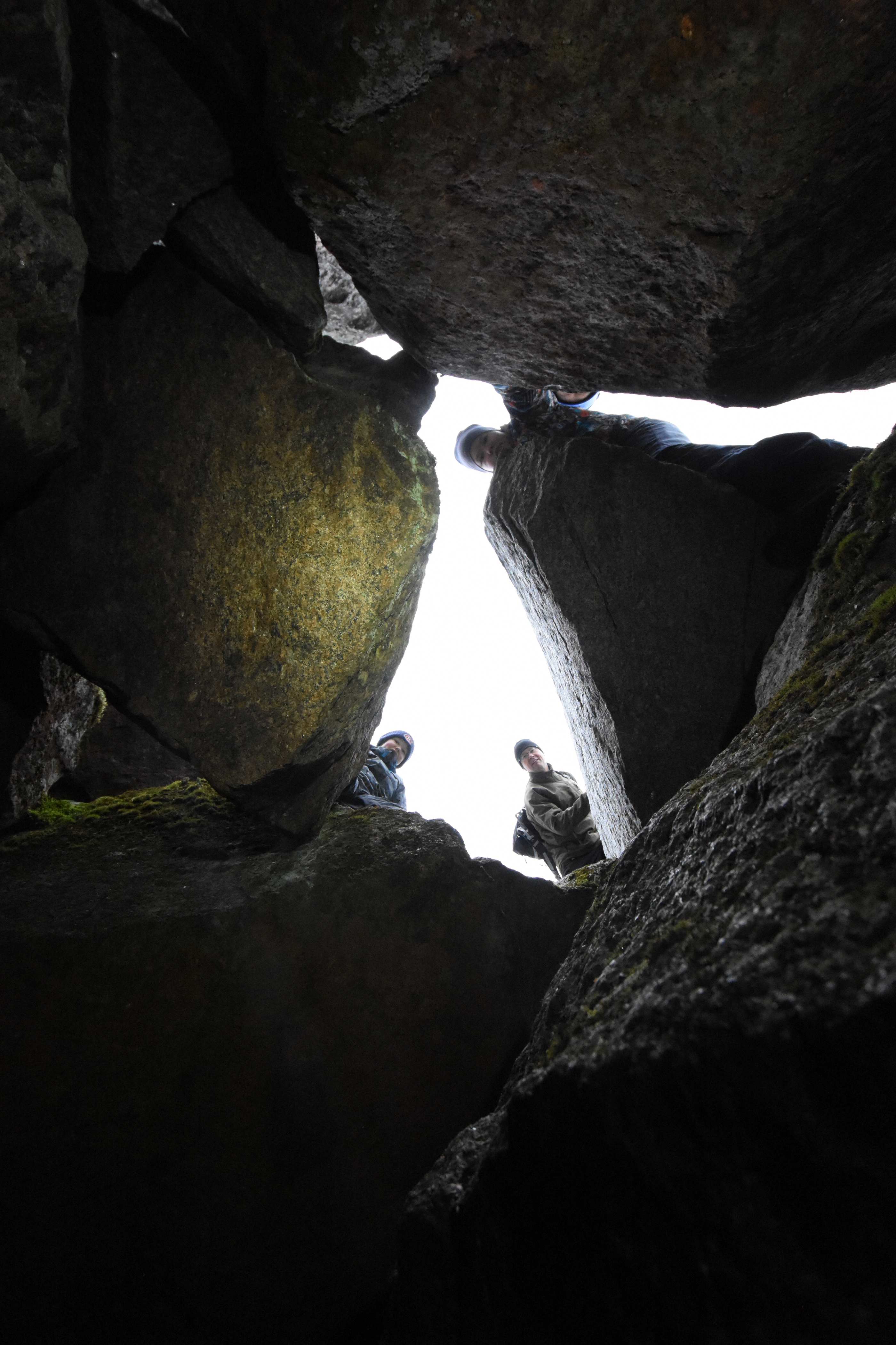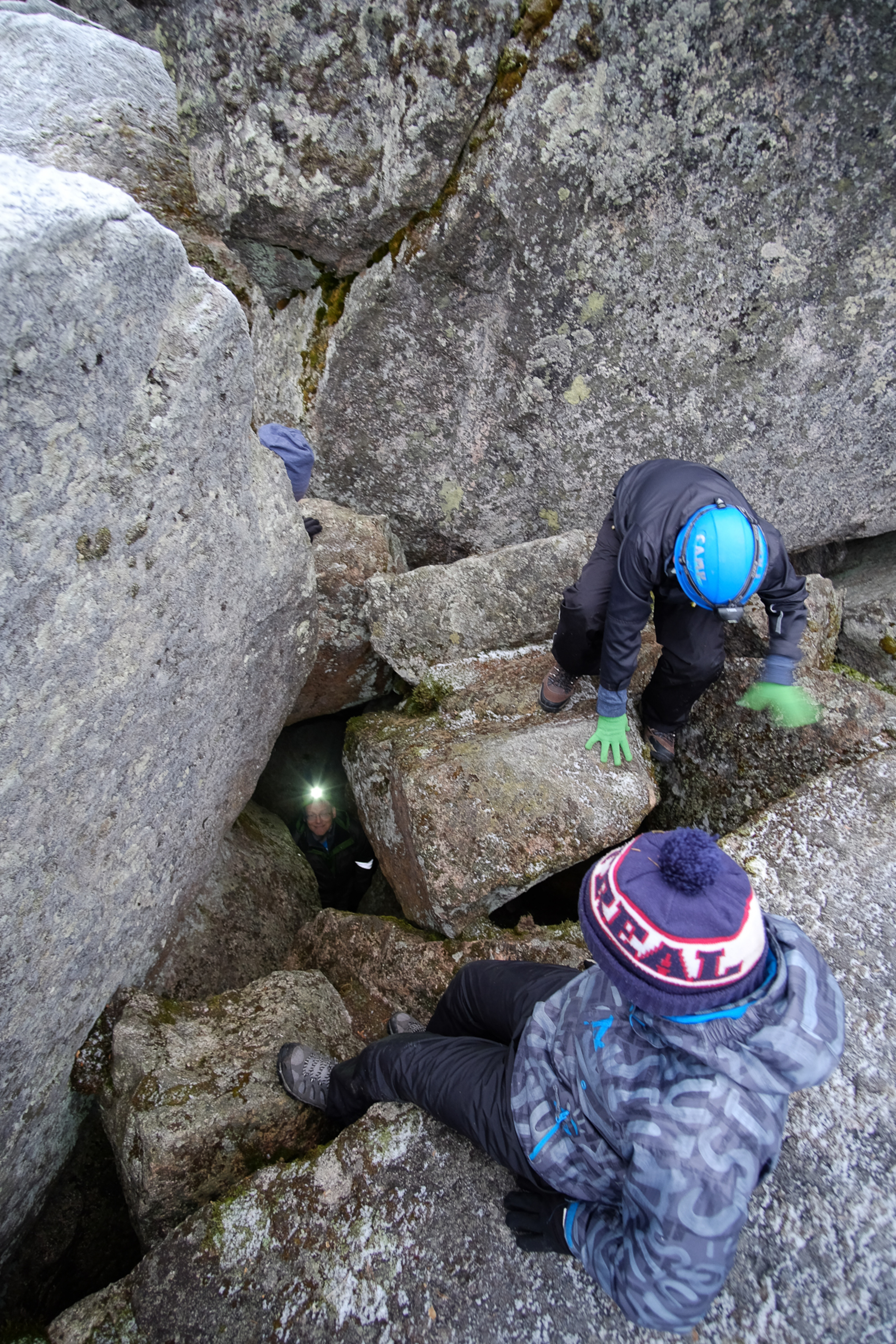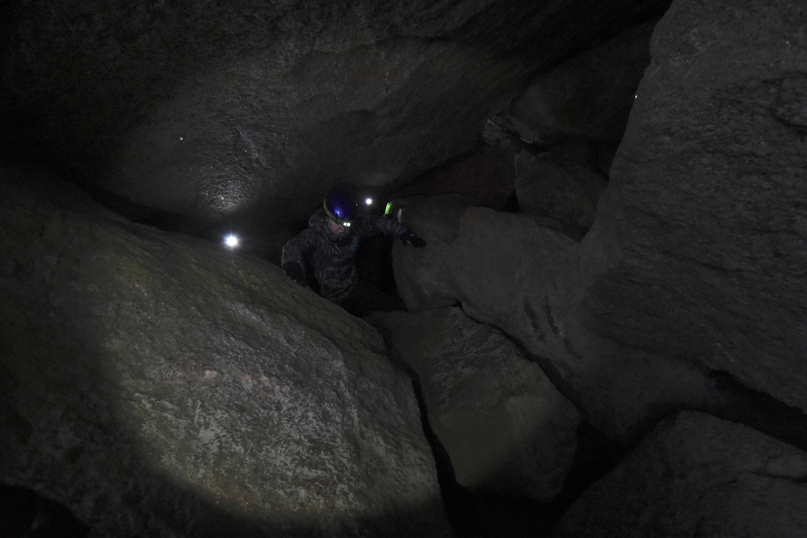 The boulder field caves feel different. Not carved into smooth shapes by water, not cracked open by forces of nature. They just are, and there is space between them. If there's enough big rocks, there will be spaces underneath, and you can crawl around.