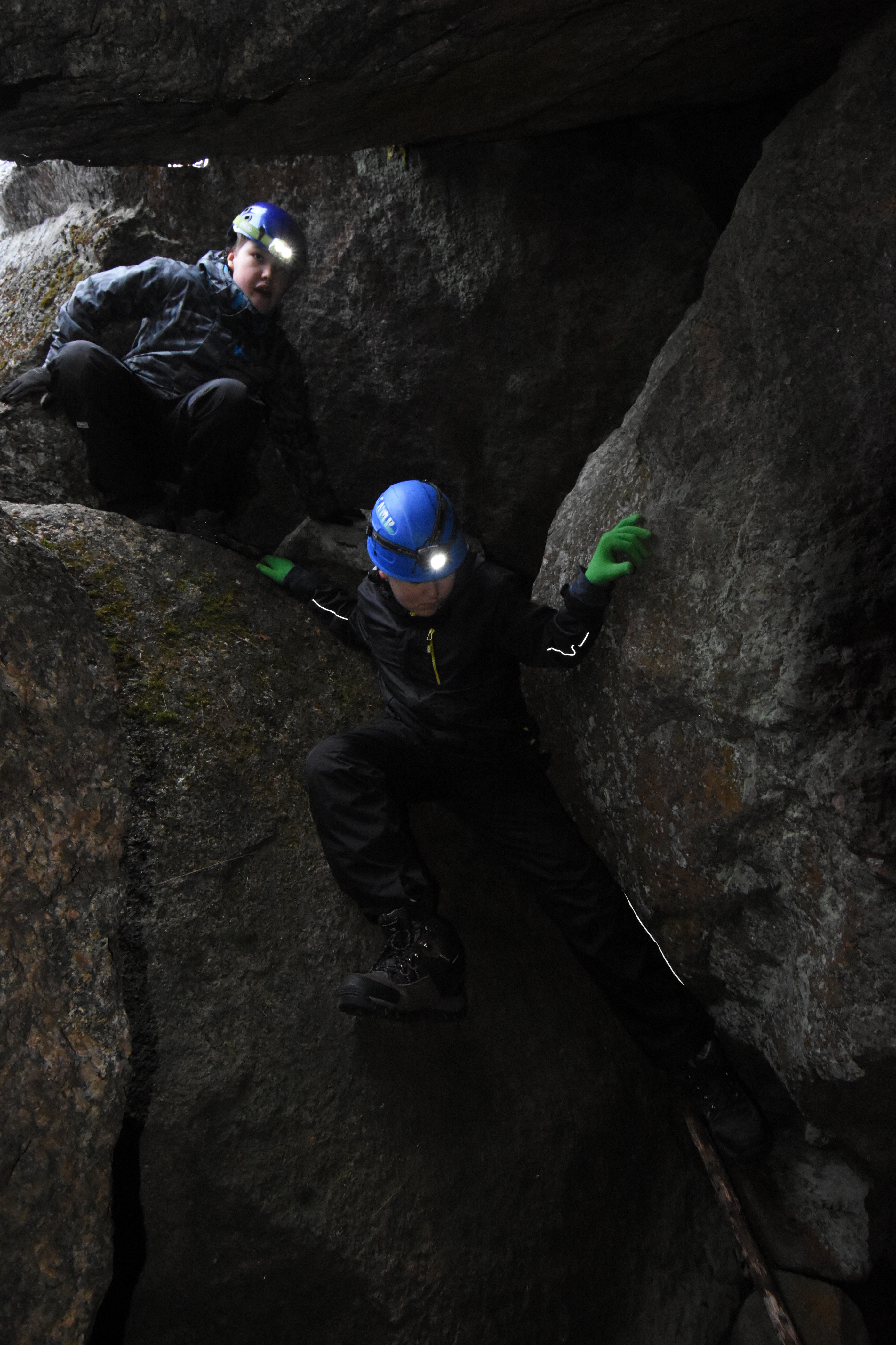 While I explored the hole, Jarmo found the main cave. It is possible to enter the main cave from the hole, I think, by crawling under one of the rocks near the surface. Although I chose to exit and then re-enter, as the crawling space would have been quite tight and had sharp edges. The smaller cave explorers had already gone in.