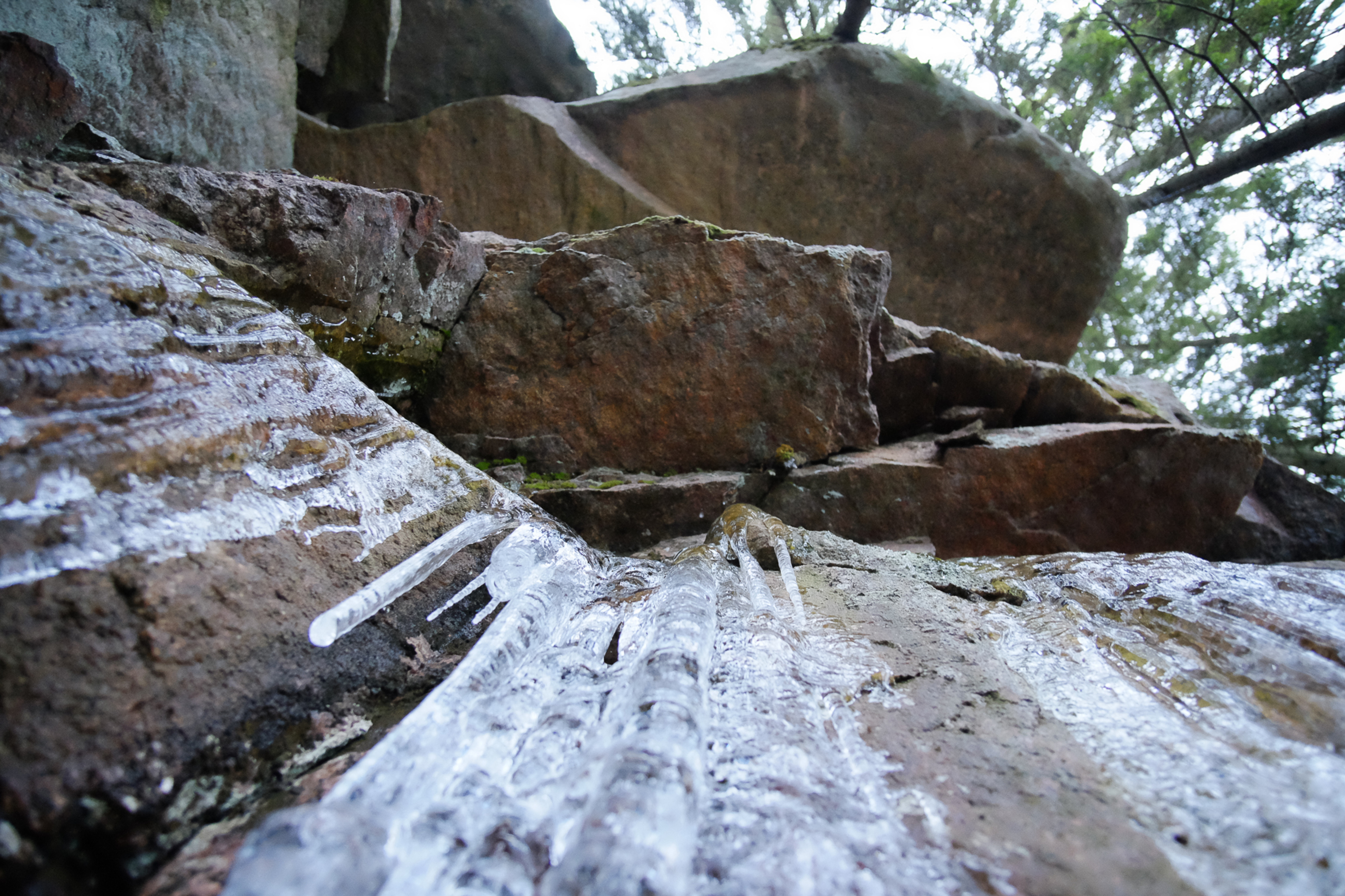 The cliff tower above the boulder field, including a major overhang, a small "arch" cave, and somebody's hastily constructed little hut. Water flows from the cliff, and had created frozen ice. The cliff, and perhaps later in the winter, the ice looks very climbable, though I'm not sure if it is allowed in this area.