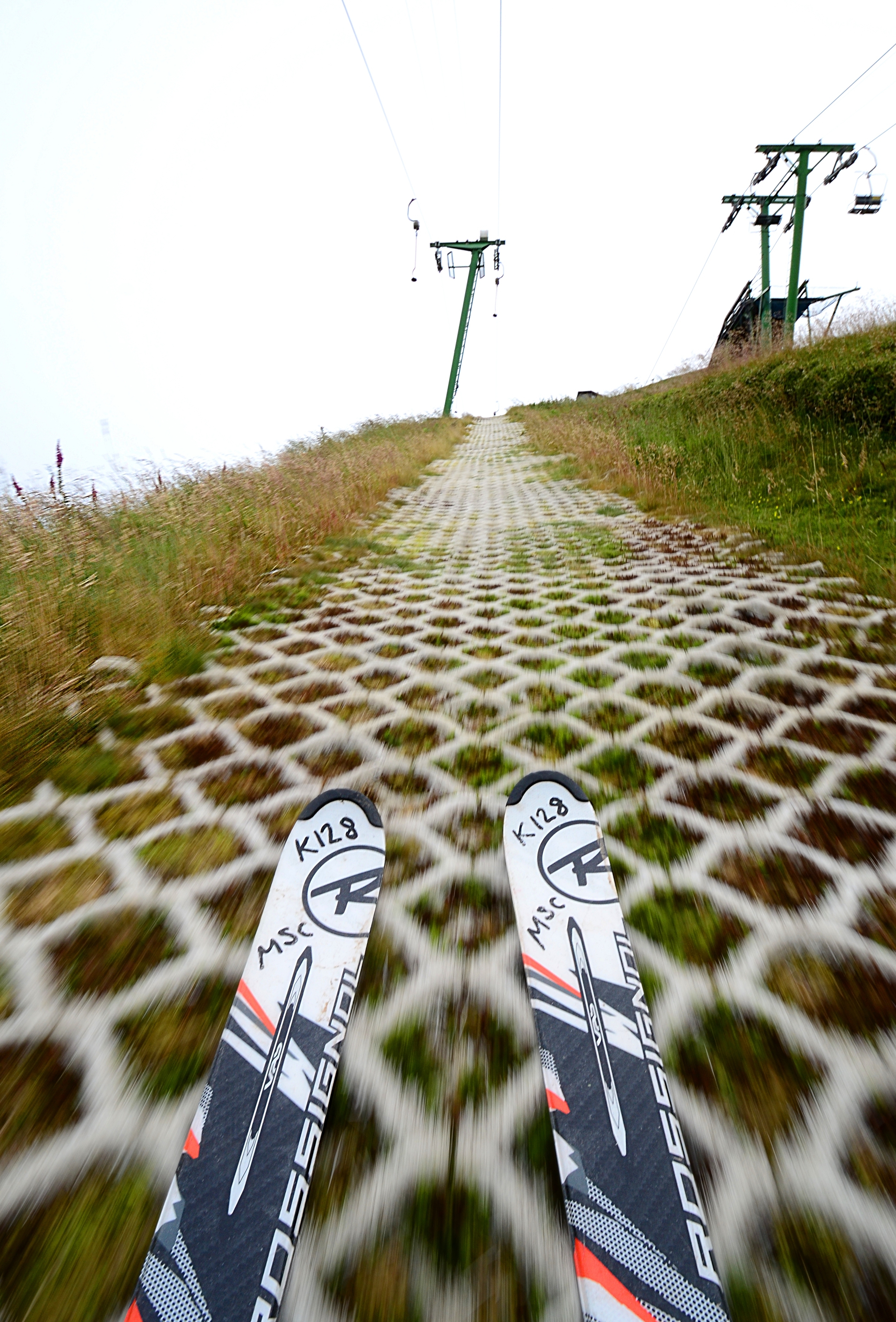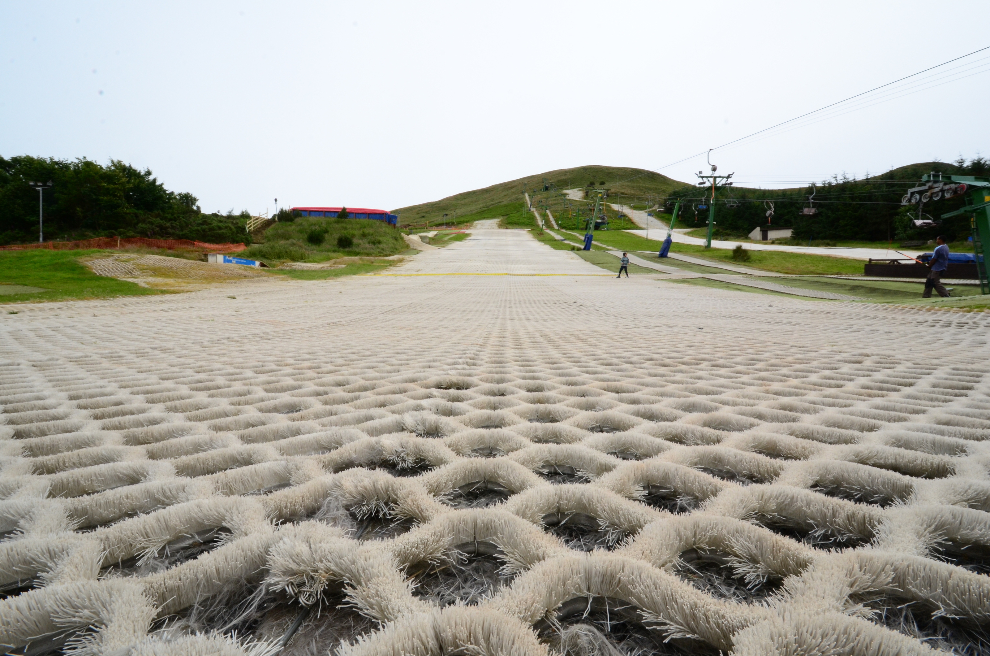 The slopes are covered with plastic matting, allowing the ski area to be used at any time. (There is typically no snow here even during the winter.) Holes in the matting allow grass to grow in the slopes, and at times you can not be quite sure whether you are skiing on grass or plastic.
